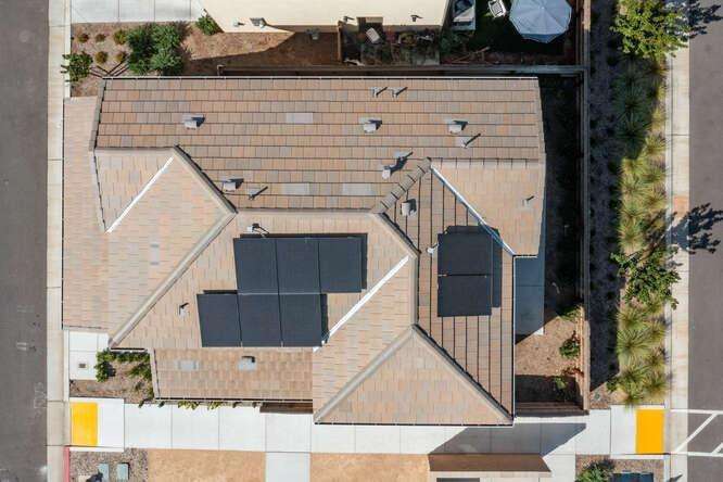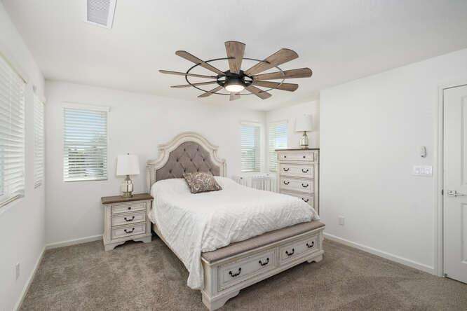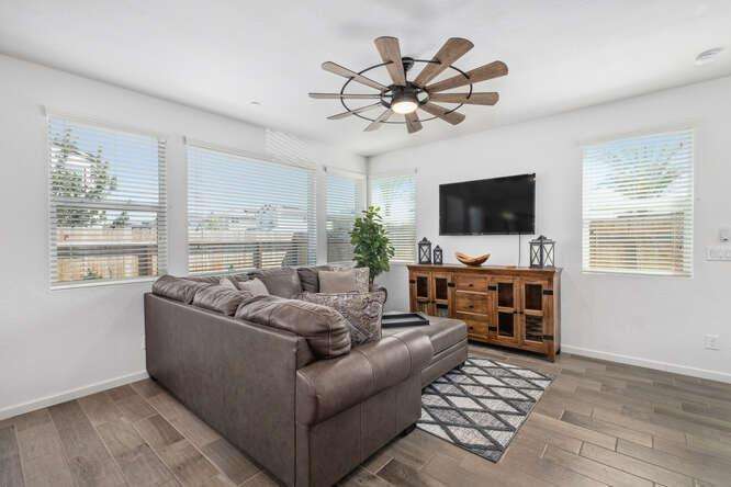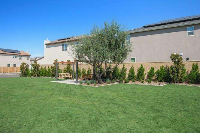 Are you looking for a turn-key newer, low maintenance home built by a quality local builder in a prestigious area? Live the lifestyle you've been waiting for at The Elev8ions at Heritage Grove! This two-story 3 bedroom, 2.25 bathroom home has high ceilings, lots of windows, stylish tile plank flooring, upgraded lighting, tasteful design choices in the kitchen and all appliances including the washer and dryer are included. Enjoy beautiful, unobstructed views of the Sierras from the master bedroom. After a long day, enjoy the extended concrete patio in the cozy backyard which has automatic sprinklers and a drip irrigation system. The best part may be the location. This home is on a corner lot with no homes directly behind it or on one side of it. The impact is a feeling of more separation and privacy with lots of light and great window views. The community pool, shaded cabanas, green space and overflow guest parking are just a few steps from the door. Monthly HOA fee of $128 includes front yard maintenance, community pool, gated entry and trash disposal. The Solar lease is $82 monthly. Heritage Grove is a desirable community with bike and walking trails and close to parks, restaurants and shops. This move-in ready home combines modern comfort with energy savings, all in one of the fastest growing neighborhoods in Clovis!