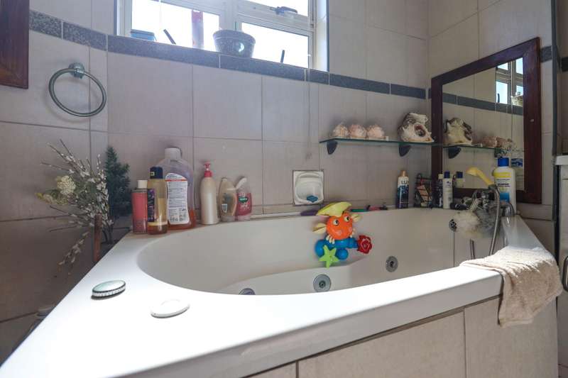 The tiled family bathroom comprises a jacuzzi bath, toilet and basin.