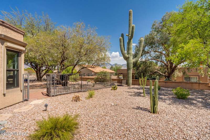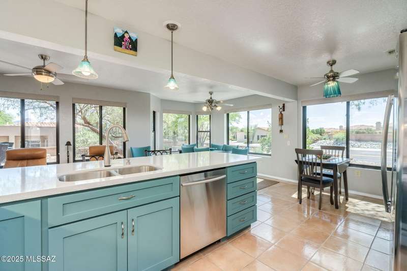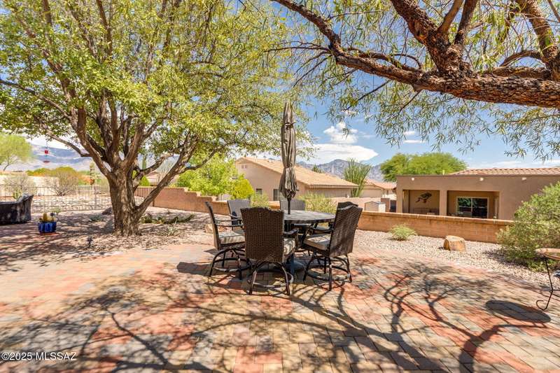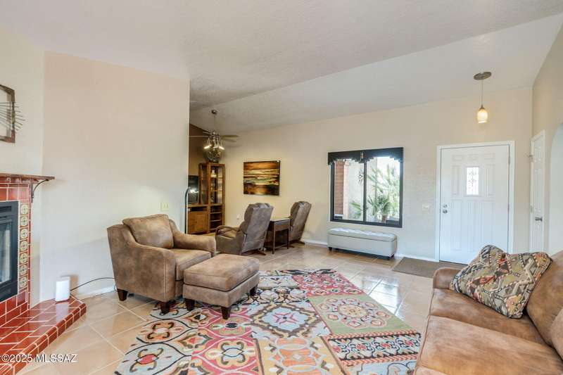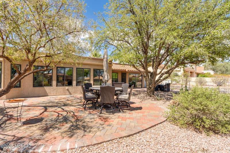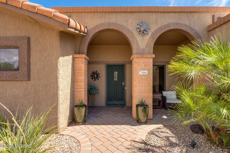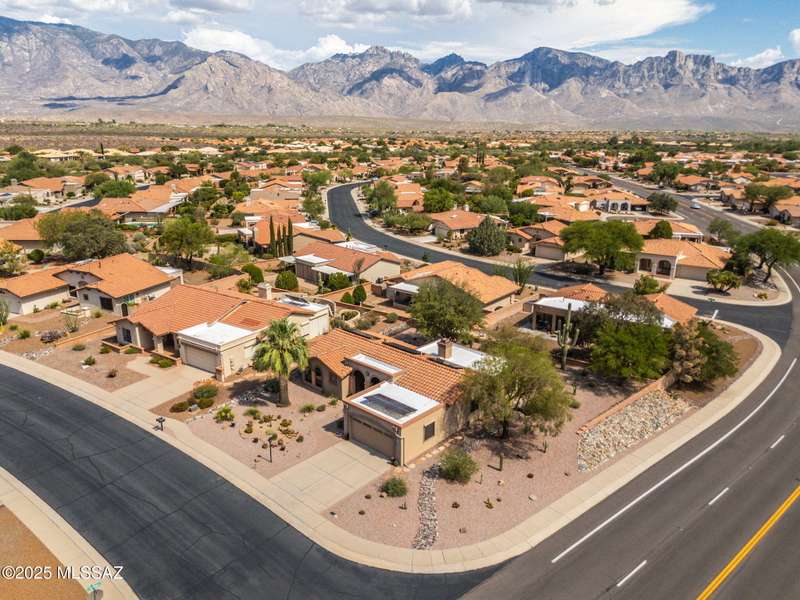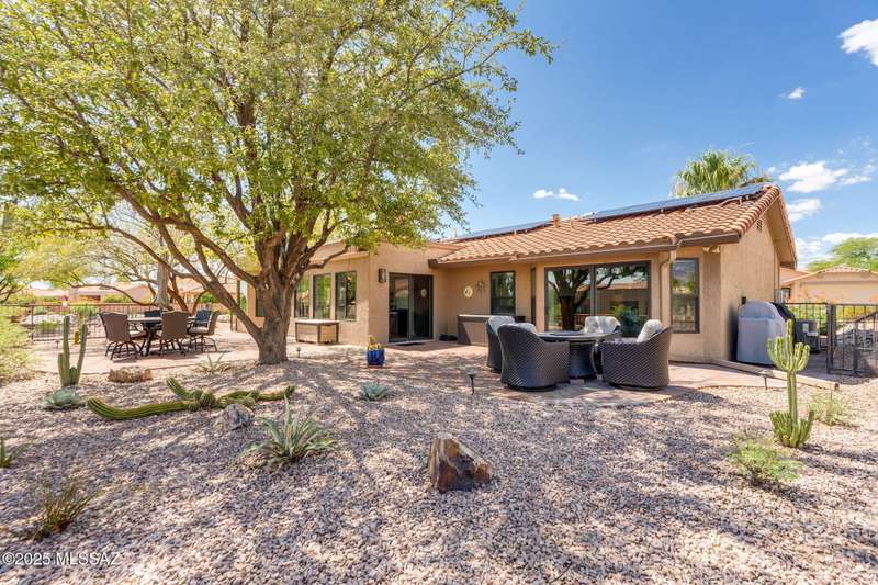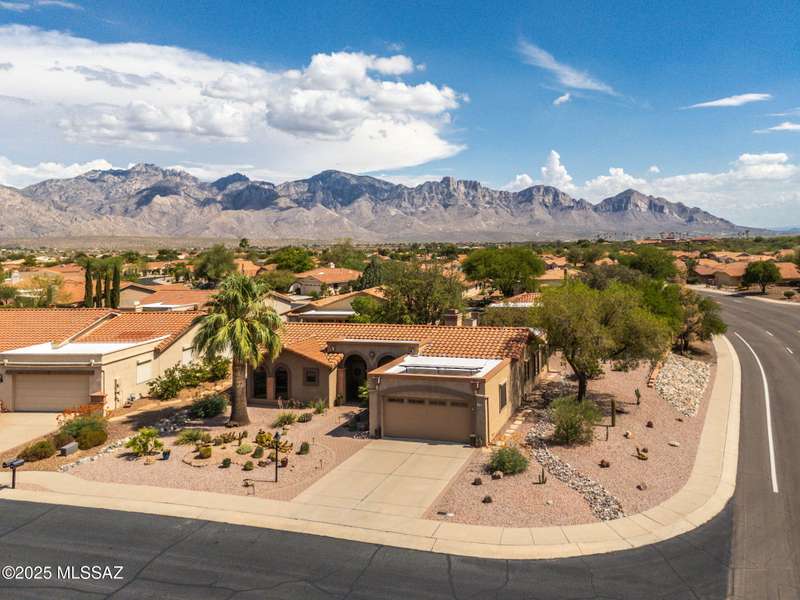 Fabulous, highly updated 2BD/2BA (1,645 sq ft) extended Dakota plan boasts flexible living spaces, seller owned SOLAR plus tranquil outdoor setting with Catalina mountain views. Formal living area displays vaulted ceilings and decorative tiled fireplace while large Great room affords multiple dining options and walls of windows for natural light. Sleek chef's kitchen with quartz and SS amenities adjoins built-in office. Inviting Primary suite hosts large bay window and ensuite bath while guest room adjoins hall bath. Extended garage with laundry sink & storage plus updated roof/HVAC/water heater. Step outside to an enchanting yard with meandering brick paver patios, mature shade trees and impressive Catalina views. A perfect retreat in Sun City Oro Valley's premier Active Adult community.