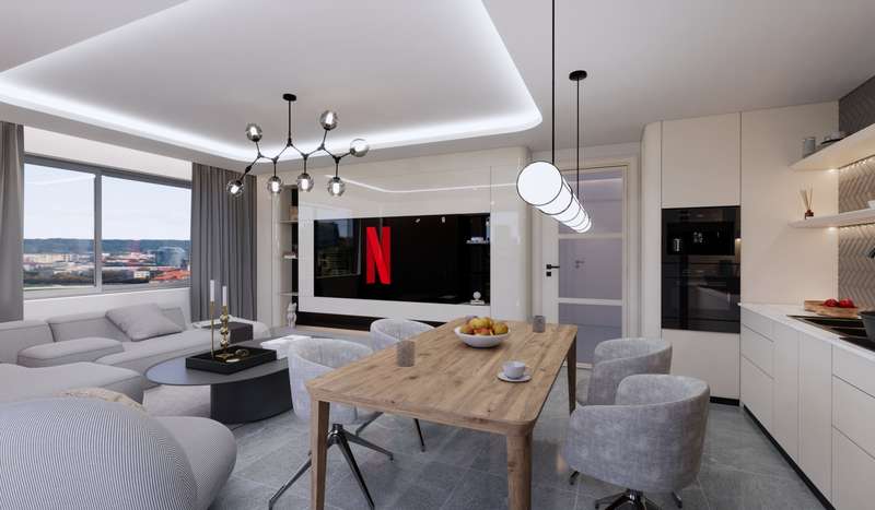 The specially designed properties are equipped with a central satellite system, flooring and lighting, wall paintings, electrical, heat, and water installations, balcony and stair railings, bathroom and kitchen furniture, bathroom and kitchen flooring, and countertops.