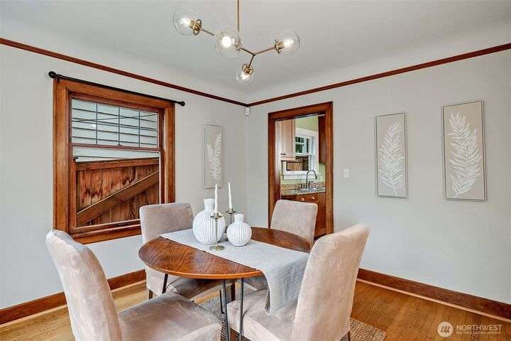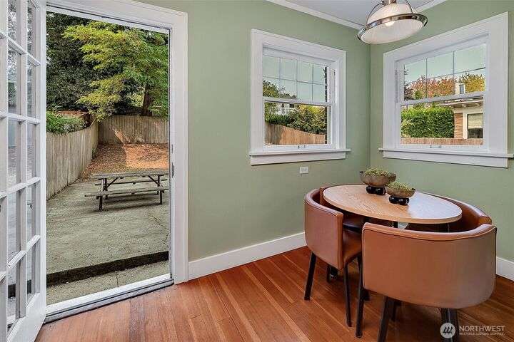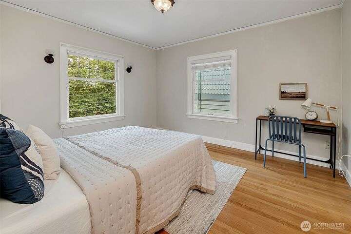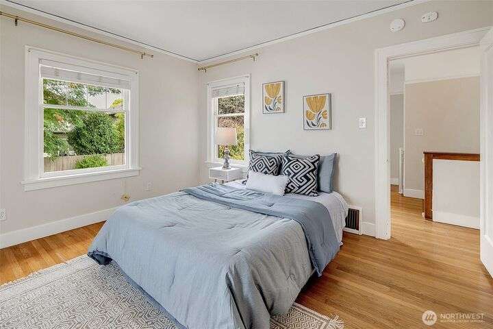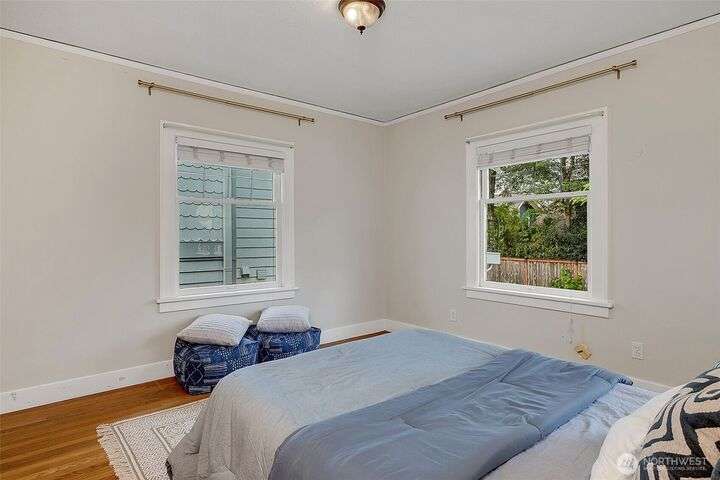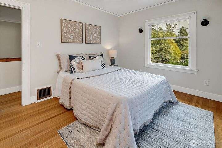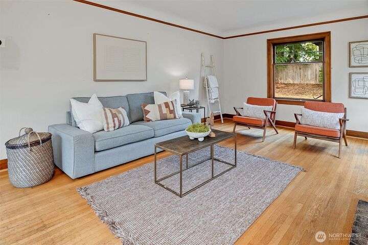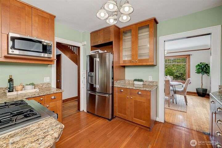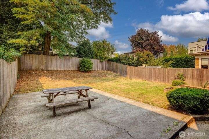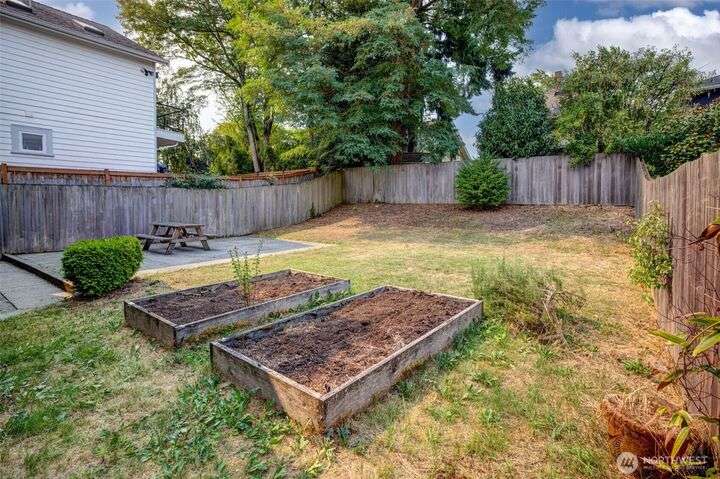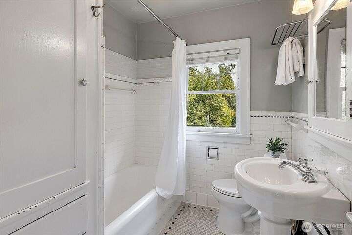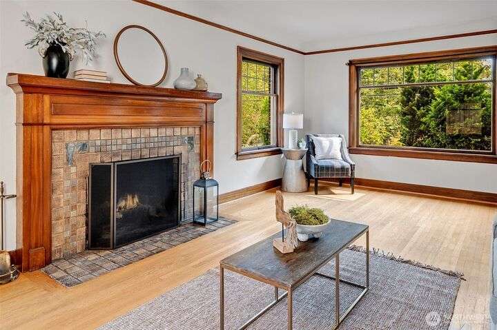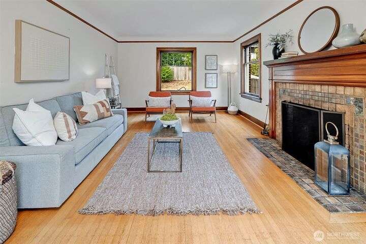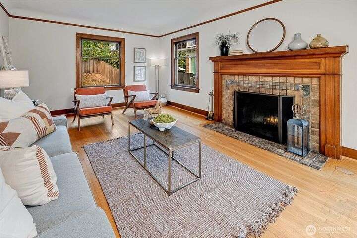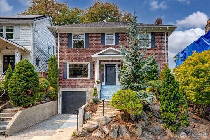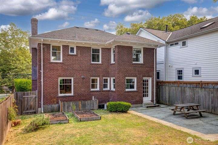 Across from Madrona Park on a quiet, tree-lined street, this classic 1926 Colonial brick home beckons. Period details throughout—oak floors, tiled fireplace, mahogany trim, and a spacious sunlit living room. Formal DR with French doors, updated kitchen with stainless appliances and a cozy breakfast nook. A fenced backyard are ideal for gardening, entertaining, or pets. Upstairs: three spacious bedrooms and full bath. Built-in storage and vintage laundry chute. The unfinished basement offers high ceilings and exterior access for potential expansion. Recent upgrades include a new sewer line and copper water service. Unbeatable location across from the park, and steps to coffee, restaurants, and transit. Pre-inspected for your confidence.