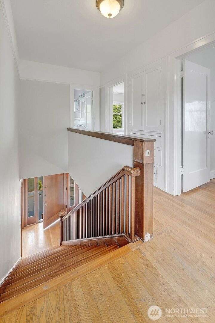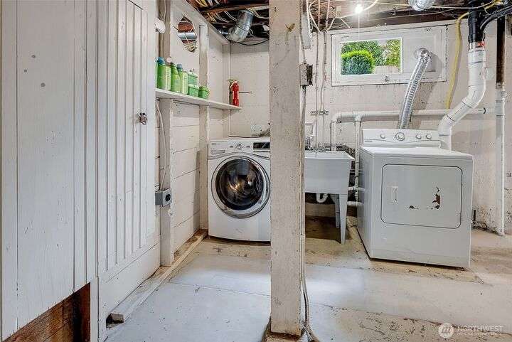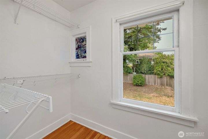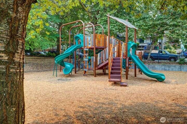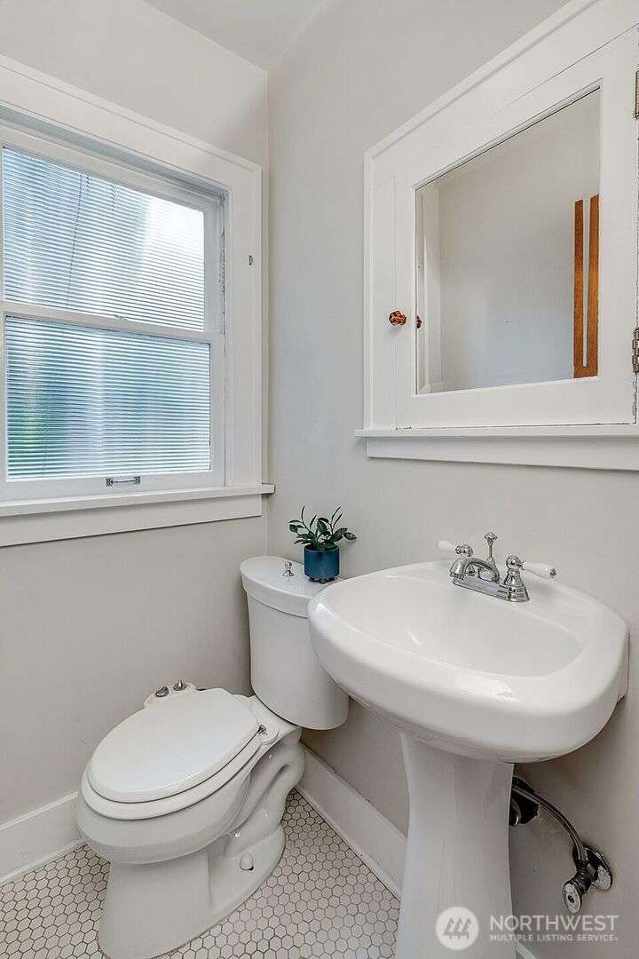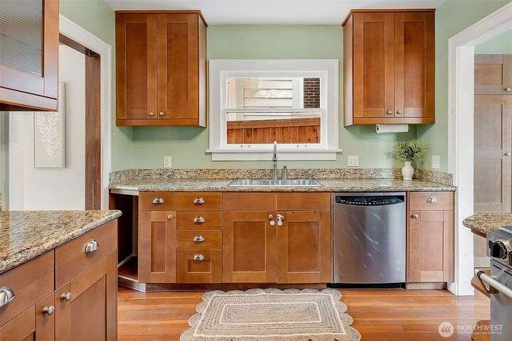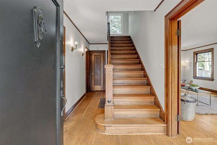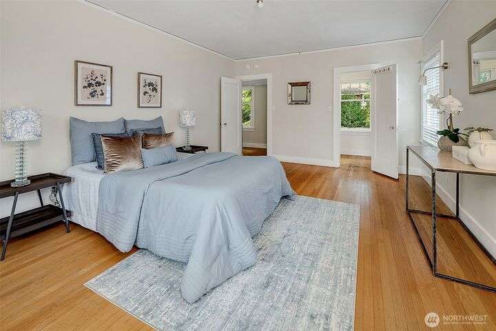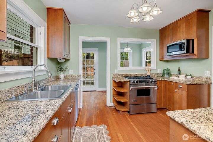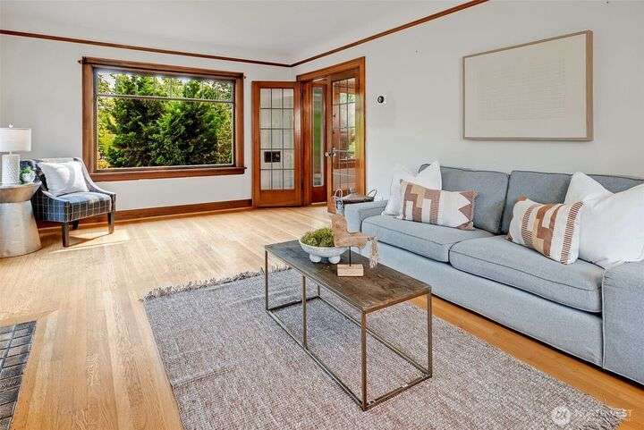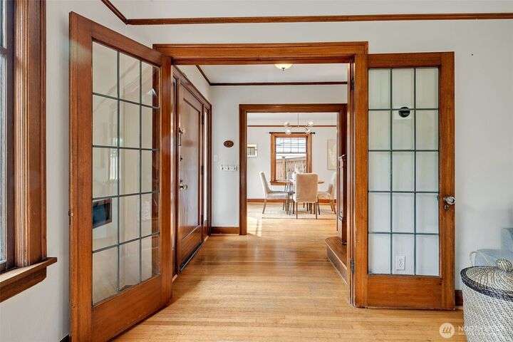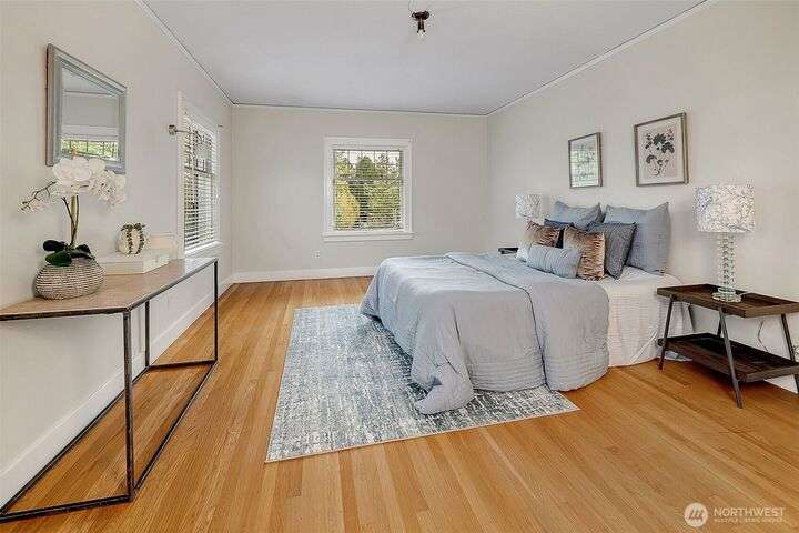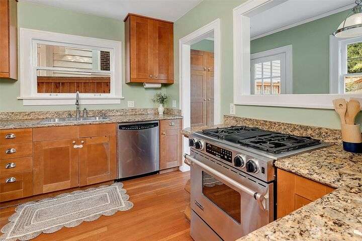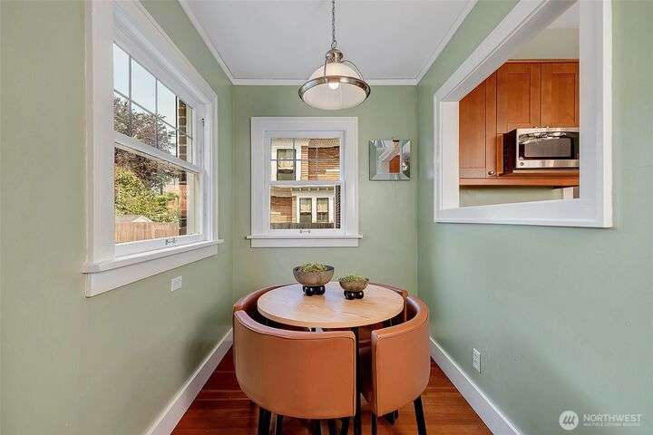 Across from Madrona Park on a quiet, tree-lined street, this classic 1926 Colonial brick home beckons. Period details throughout—oak floors, tiled fireplace, mahogany trim, and a spacious sunlit living room. Formal DR with French doors, updated kitchen with stainless appliances and a cozy breakfast nook. A fenced backyard are ideal for gardening, entertaining, or pets. Upstairs: three spacious bedrooms and full bath. Built-in storage and vintage laundry chute. The unfinished basement offers high ceilings and exterior access for potential expansion. Recent upgrades include a new sewer line and copper water service. Unbeatable location across from the park, and steps to coffee, restaurants, and transit. Pre-inspected for your confidence.