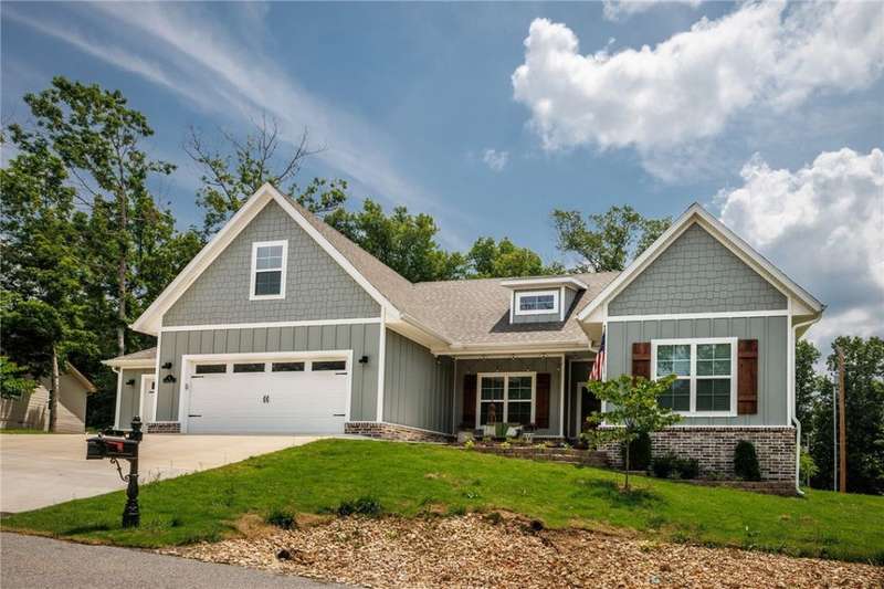 Built in 2023 on a rare, mostly flat, double lot in Bella Vista, this move-in ready home offers 4 bedrooms, 3 baths and a private office. This home has TWO primary suites! The open split floor plan features vaulted ceilings with beams, wood floors, high-end finishes, and a ventless fireplace added in 2024. Outdoor living includes a wood deck, spacious front patio, and charming wood shutters. An oversized 3-car garage plus outbuilding provide storage or workshop space. Fresh sod (2025) completes the yard. Conveniently located near lakes, golf, and biking/hiking trails, this property blends comfort, function, and lifestyle. Seller offering $2,000 toward closing costs! Don't miss out of this rare double lot beauty!