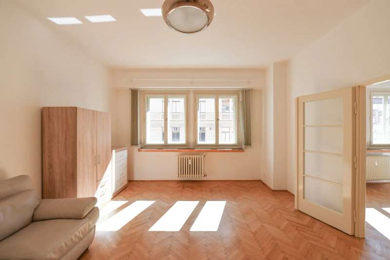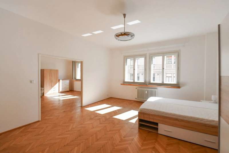 We are offering for rent a spacious, bright 2+1 apartment with a total area of 95 sq.m., situated on the 2nd floor of a brick building at one of the most sought-after addresses in Prague - Rybna Street in the Old Town. This location offers excellent accessibility to all civic amenities including local authorities, schools, restaurants, cultural facilities, shops, and medical facilities.