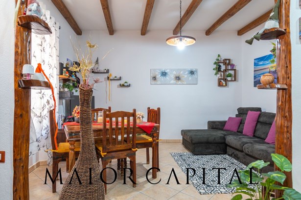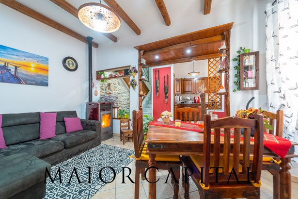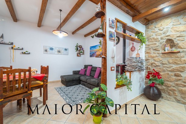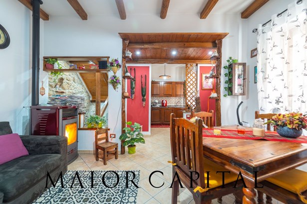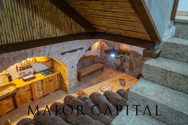 * The ground floor opens onto the living room, with a cosy living area and a separate kitchenette. The exposed wooden beams and local stone inserts give a sense of warmth and authenticity. The natural light, filtering through the windows, enhances the architectural details and the care taken in the finishes.