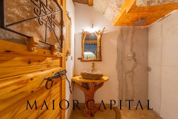 * The basement lounge, located in the basement, is the beating heart of the house: an evocative and enveloping environment made of juniper wood, local stone and hand-forged wrought iron. The custom-made furniture emphasises the traditional character of the space, making it ideal for dinners in company and moments of relaxation in an authentically Sardinian atmosphere.