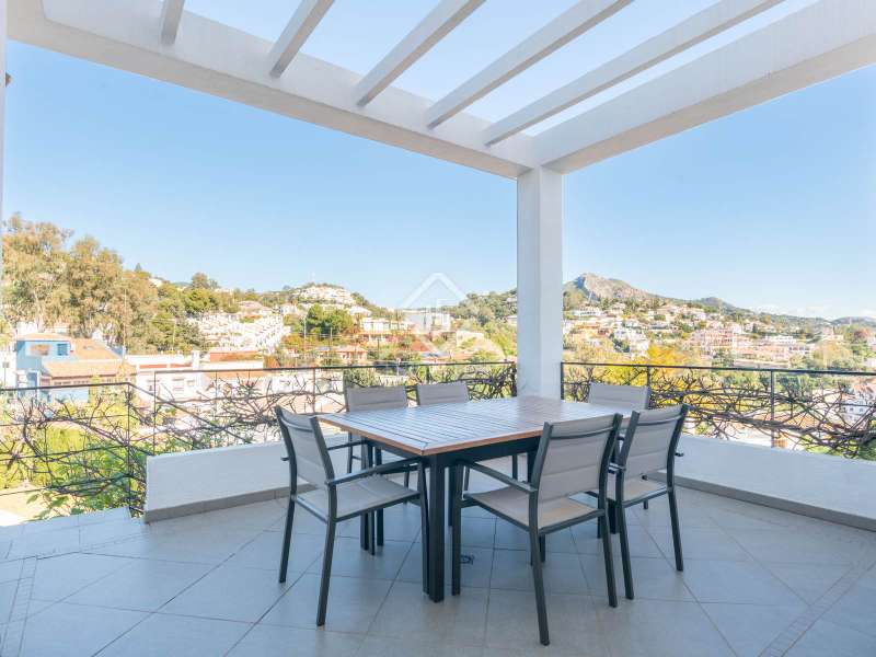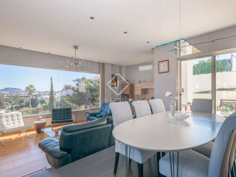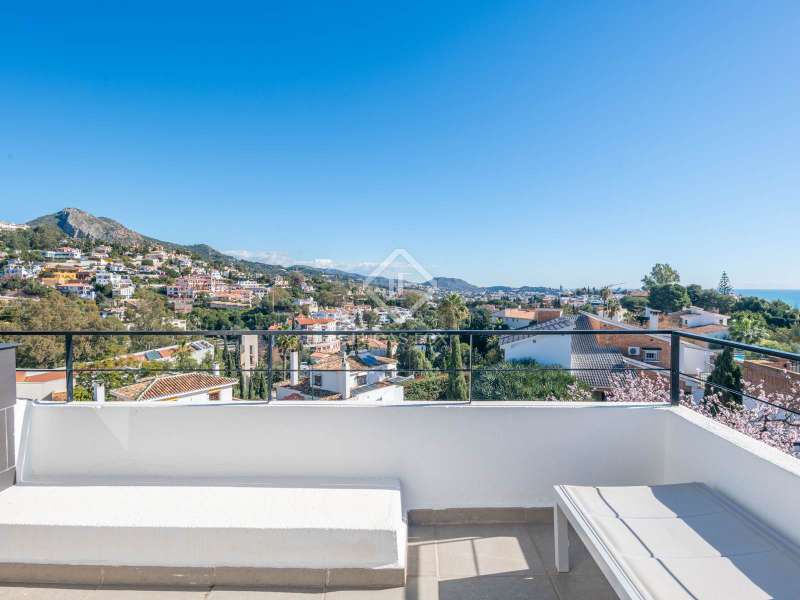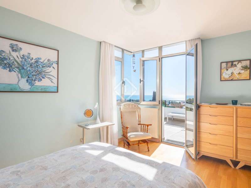 Located in an exclusive residential area, this majestic detached villa of 422 m² built is built on a 729 m² plot , offering a privileged location with a southeast orientation and spectacular sea views from all its rooms. Designed for those seeking the perfect balance between luxury, comfort and privacy, this property is a true refuge of serenity and sophistication. Upon entering the property, we are greeted by an elegant entrance hall that leads to a spacious and harmonious layout . On this same floor, we find a guest room, a guest bathroom and a large designer kitchen, directly connected to a northeast-facing terrace, ideal for enjoying breakfasts outdoors. The impressive double-height living room is divided into two distinct areas: a cozy bedroom area with a large window that frames unobstructed views, and a sophisticated social area on the upper floor, perfect for meetings and celebrations. From the living room , we access a large southerly aspect terrace- garden , a dream space that invites you to enjoy the Mediterranean climate. On the upper floor , the property houses a refined study, the splendid main bedroom with dressing room, en-suite bathroom and private southerly aspect terrace, as well as two additional bedrooms with built-in wardrobes that share an elegant bathroom. On this same floor, there is a practical laundry room room, providing maximum comfort on a daily basis. The upper level of the villa surprises us with a fully accessible roof terrace, equipped with recently installed solar panels and a water reserve tank, guaranteeing energy efficiency and sustainability. The exterior of the property is a true oasis of exclusivity. Its large, meticulously designed garden houses a private pool where you can relax while enjoying the unrivalled Mediterranean climate. The chill-out area with kitchen and barbecue offers the perfect setting for unforgettable evenings. Finally, the covered garage, with capacity for four vehicles, adds extra comfort and security. This villa represents a unique opportunity to live in a luxurious setting, where every detail has been carefully thought out to offer maximum comfort and elegance. An exceptional home that combines design, spaciousness and unrivalled views in one of the most coveted locations.