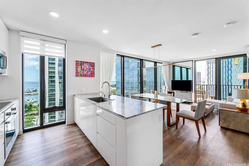 Experience luxury living at A'ali'i, where ocean views greet you the moment you enter. The rectangular shape "01" stack offers the only corner 2-bedroom, 2-bath units with floor to ceiling windows, allowing you to enjoy stunning views from the living room, kitchen and bedrooms. This fully furnished TURNKEY home designed by Rottet Studio includes its own 37 sq ft STORAGE ROOM on the 22nd floor, an EV charger equipped parking with extra overhead storage, an upgraded TOTO washlet, two walk in customized closets, Bosch appliances, and blackout shades in both bedrooms. A wide range of amenities including an outdoor sky deck, spacious gym, yoga room, BBQ areas, large pool and jacuzzi, event rooms, are all extensions of your living space. A'ali'i represents luxurious, sustainable, and well-designed living in one of the most sought-after locations at Ward Village in Honolulu.