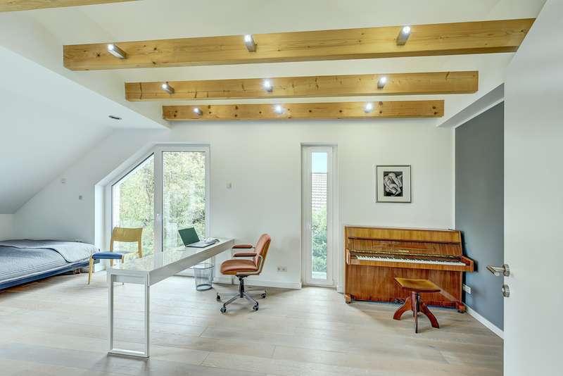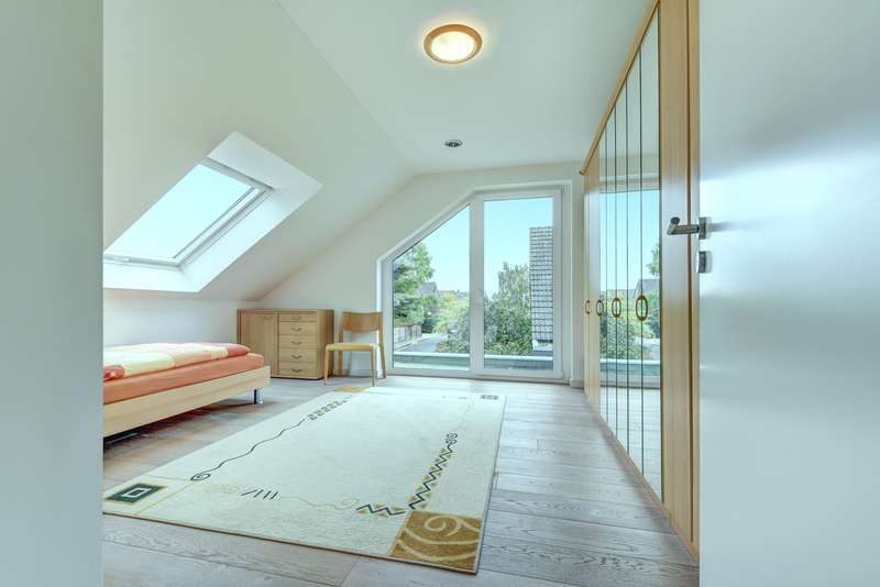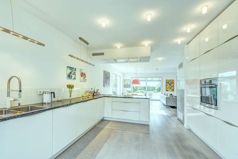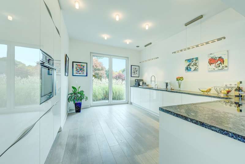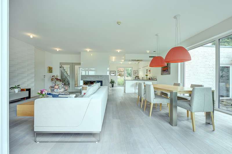 Completed in 2013, this detached house combines modern architecture with a well thought-out room layout and impresses with its generous living space. The modern property is situated on a south-facing plot of approx. 915 m² and offers unobstructed views. The property has a total of five bedrooms and three bathrooms. The inviting entrance area catches the eye as soon as you enter the house, providing a harmonious transition to the spacious living and dining area with open-plan kitchen. Floor-to-ceiling windows provide plenty of natural light and open up views of the spacious garden. The open-plan living area also features a cozy fireplace with modern marble tiling. The premium kitchen is directly connected to the dining area and has high-quality fittings and plenty of storage space thanks to numerous cupboards and work surfaces. A kitchen counter charmingly rounds off the kitchen area. The first floor also has a separate, low-threshold sleeping area with a fully equipped bathroom with a walk-in shower, a dressing area and an adjoining bedroom. The centrally located staircase leads to the upper floor. This is currently used as a separate granny apartment with a large living/dining area with fitted kitchen, a bedroom, a bathroom and a hallway. Another large room with a bathroom is also located on the upper floor. The floor plan is flexible: Whether as three to four bedrooms with two bathrooms or currently as two separate living areas - anything is possible. You can enjoy a fantastic view of the countryside from all the windows. The energy-efficient building technology includes modern underfloor heating, which provides pleasant warmth in all living spaces via geothermal energy. Controlled ventilation rounds off the building technology for a pleasant living atmosphere. In terms of sustainable energy supply and low operating costs, this property is absolutely progressive. The fittings and materials used are of a high standard. The house is in very good overall condition and is suitable for both families and couples who value spacious living and modern technology. Two garages with wallboxes and several outdoor parking spaces offer convenient parking options right next to the house. One of the garages also offers sufficient space for garden utensils and can be accessed directly from the garden. The very large main terrace has a high-quality glass roof with side protection, shading and lighting, making it a wonderful outdoor living area. In addition to a homely and high-quality basement, there is also a sauna and a fitness area. A fourth bathroom has been prepared. The surrounding area is characterized by a quiet and family-friendly neighbourhood. Shopping facilities, schools, kindergartens and leisure activities are just a few minutes away, as are public transport links and the regional road network, such as the A44 and A52. See the advantages of this property for yourself and arrange a viewing appointment. The house is ready for immediate occupation and is just waiting to fulfill your individual living dreams.