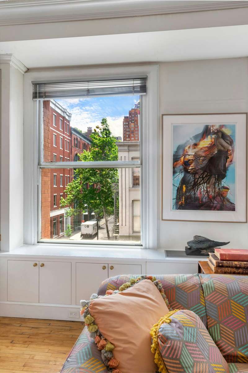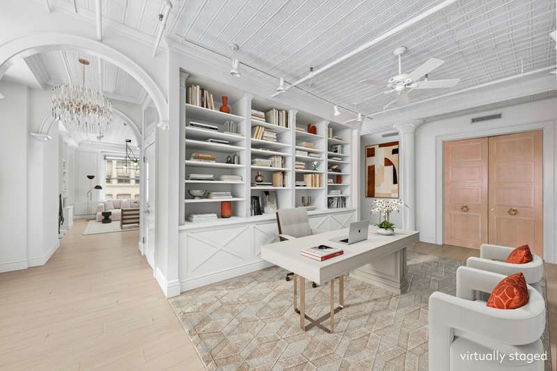 This genuine loft is the perfect canvas for creating an unrivaled home or a versatile live/work space. The building was home to many well-known art gallerists over the years, including Paley and Byers who had the Bykert Gallery in the 70's and later the Paley & Lowe Gallery on the third floor. The keyed elevator opens to a windowed foyer, introducing the home's stately architectural features and grand entertaining space. The living room and studio space occupy over 2,300 square feet and flow seamlessly together surrounded by oversized cast iron windows. Three columns divide the space, adding to its multi-use functionality.. The home also features custom closets and built-ins throughout, providing ample storage. The principal bedroom nestled in the northwest corner of the loft offers privacy and quiet with custom frosted glass windows that provide tranquil light throughout the day. The suite also includes ample closet space with three double-deep built-ins, a separate walk-in closet, and a large en-suite bathroom. The second bedroom is also generously proportioned and has its own en-suite bathroom.