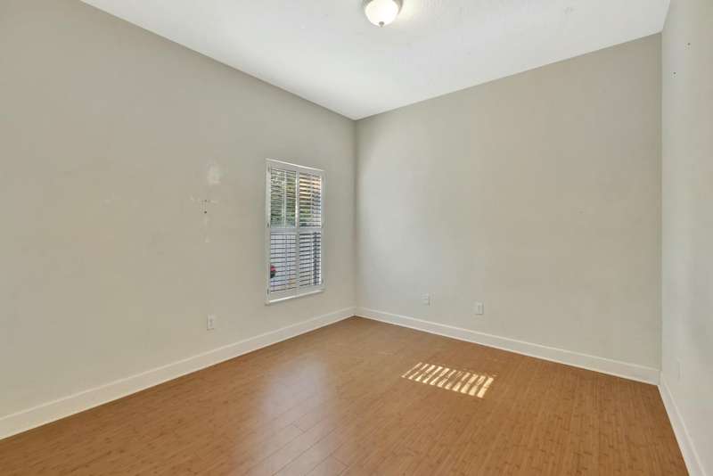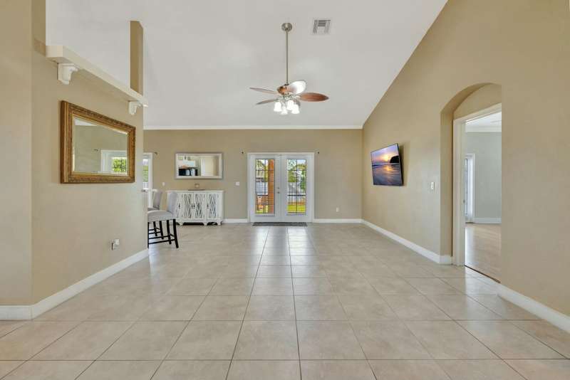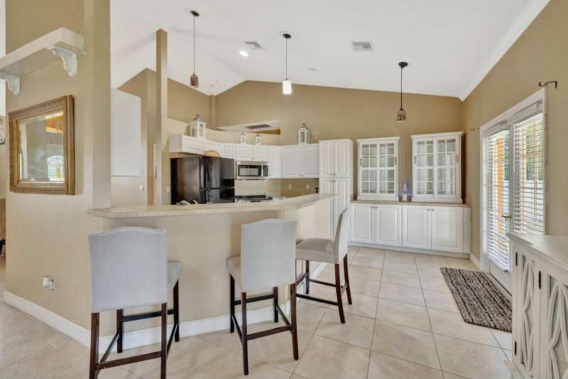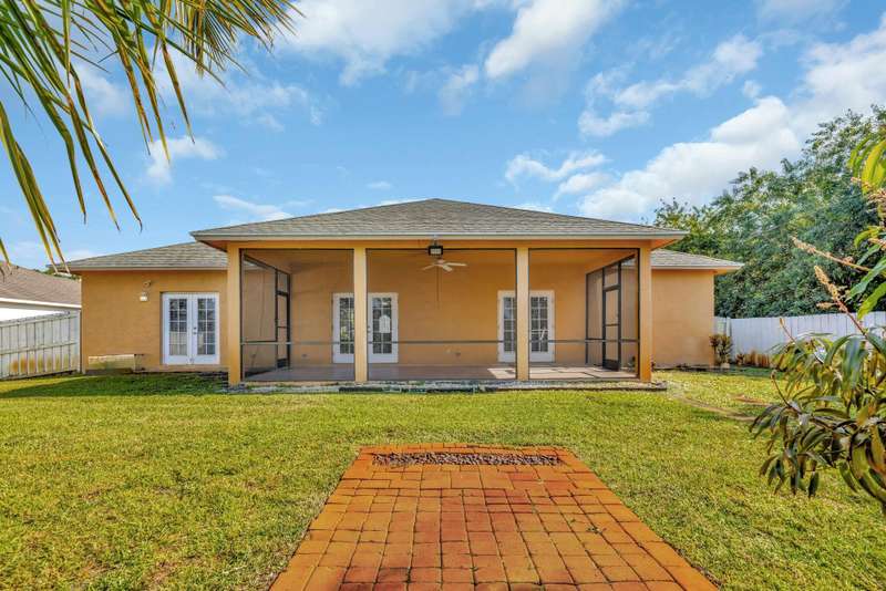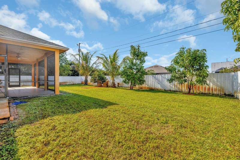 This beautiful 3BR, 2BTH CBS home with den/office in Port Saint Lucie near Becker awaits you. There is tile throughout main areas with wood laminate in secondary bedrooms and bamboo in Master. Black and stainless appliances in kitchen and a beautiful pantry. Once you enter the home you will see the open living room with formal dining area and breakfast/bar area off the kitchen. This home has vaulted ceiling with fans and HUGE Master B/R with his/her walk-in closet. Master bath has Roman tub, glass walk-in shower and dual sinks. Large screened tiled open patio, privacy fence. Quiet street and great location with easy access to I-95 & Turnpike. Great area with everything close by. Come see for yourself. make an appointment. Mature fruit trees. Mangoes and coconut