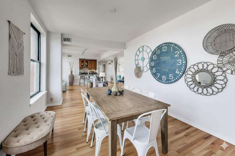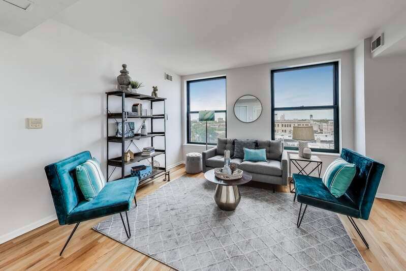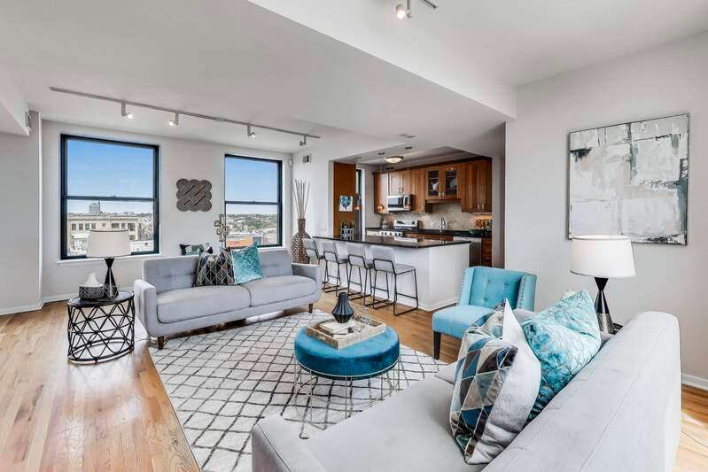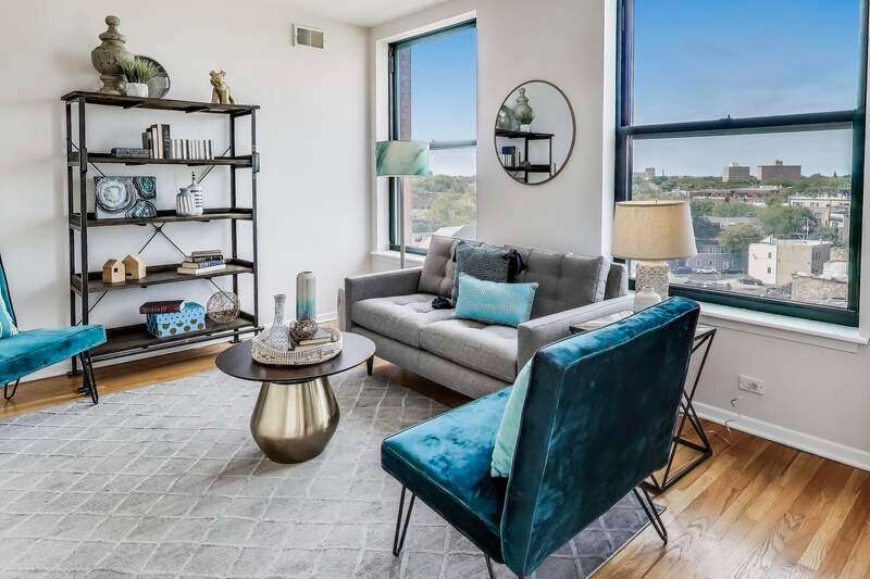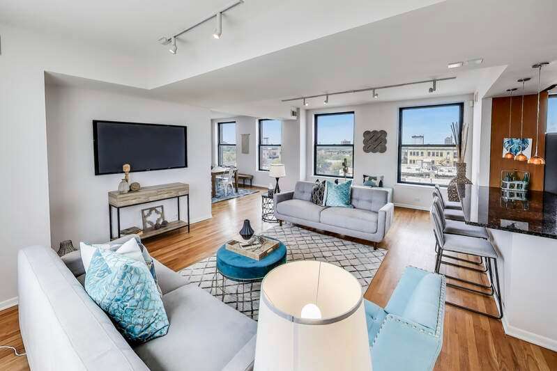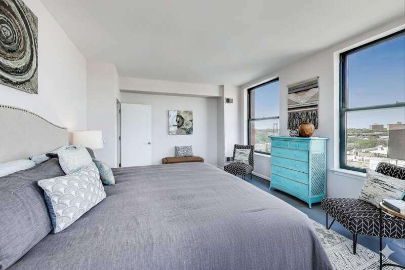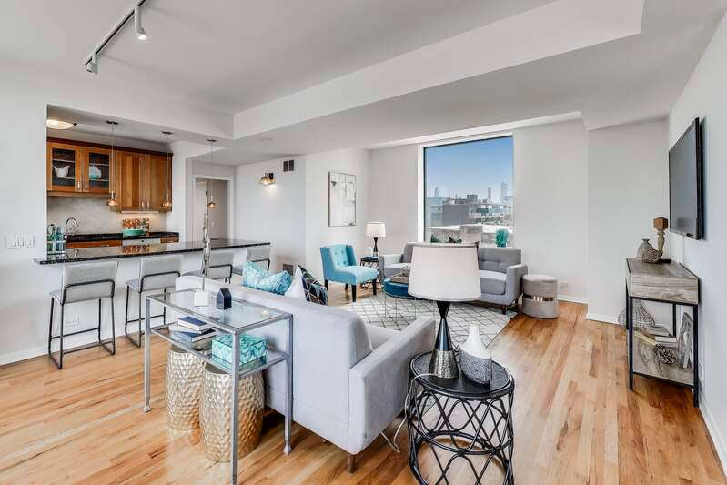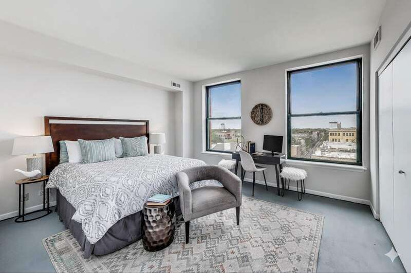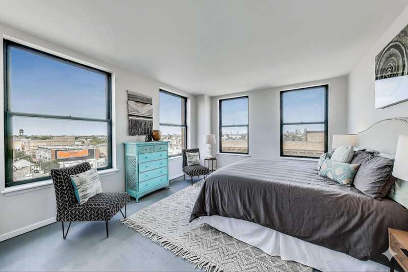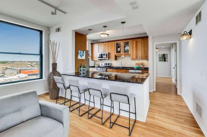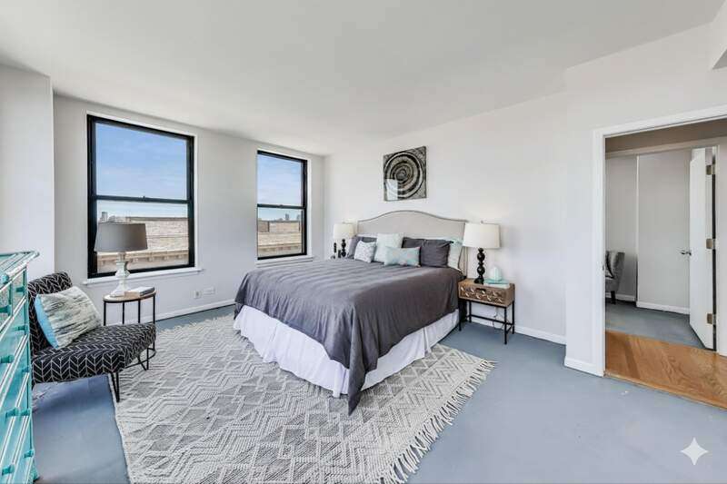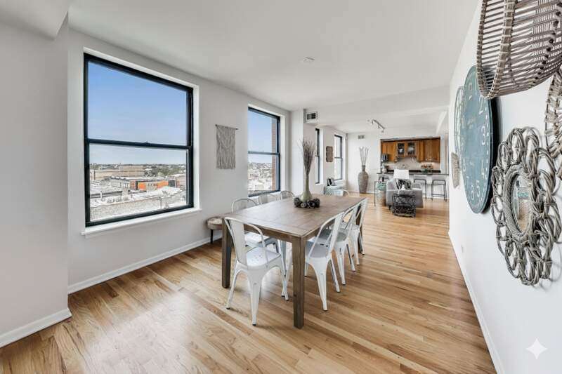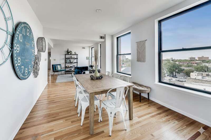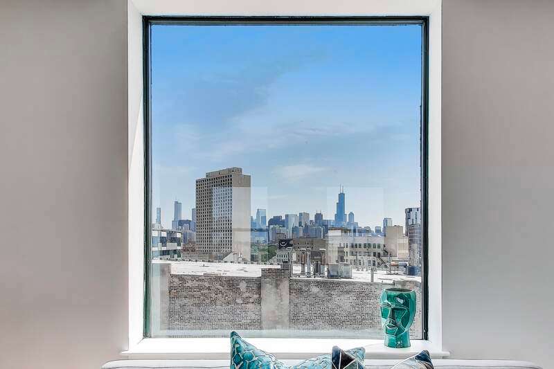 Live in style in this one-of-a-kind, sun-drenched loft in vibrant Wicker Park/Bucktown. A private elevator opens directly into your unit, revealing over 2,200 square feet of living space that spans the entire 7th floor. Light floods in from huge east, west, and north-facing windows with beautiful skyline and sunset views. The extra-high 10-foot ceilings and massive living and dining areas give this place a truly special and expansive feel - perfect for entertaining. The extraordinarily spacious and bright master bedroom is highlighted by beautiful corner windows and an enormous walk-in closet. Shared full bathroom with double vanity. The second bedroom is a generous size with great closet space and its own full, detached bathroom. The third bedroom offers an easy layout, perfect for a multi-purpose room. Hardwood floors run throughout the main living areas, with painted concrete floors in the bedrooms. The large kitchen features 42" cabinets, granite countertops, and LG appliances. A separate laundry room with extra storage and central air complete the unit. Low assessments. In this prime location, you can easily walk to all the vibrant restaurants, popular shops, and lively bars that make Wicker Park and Bucktown so desirable. With bustling Milwaukee Avenue at your feet and Division Street just two blocks south, you're at the heart of the action. The Blue Line is also a short walk away. Included in the sale is one year of prepaid exterior parking across the street on the corner of Paulina and Moorman.