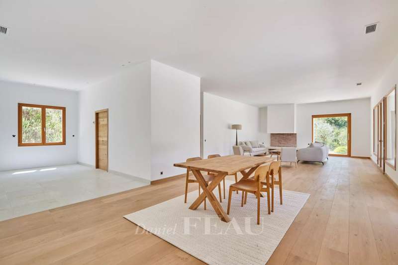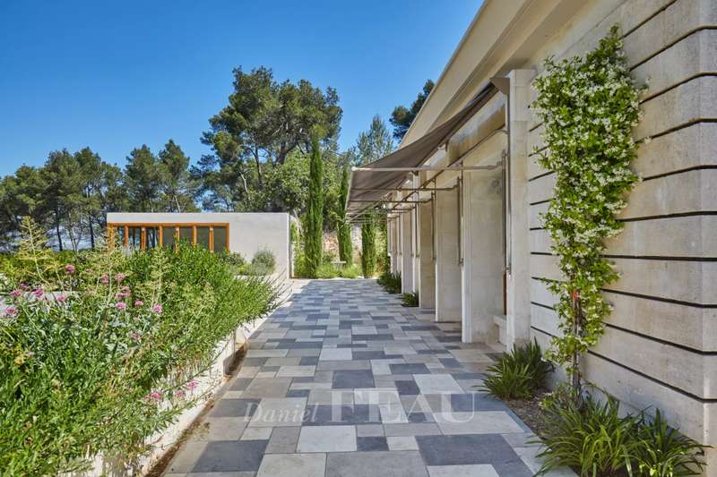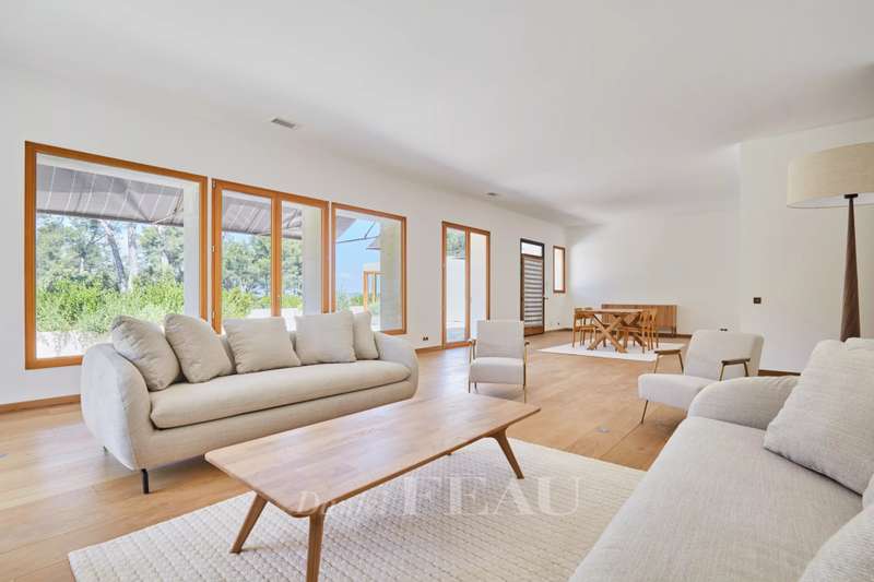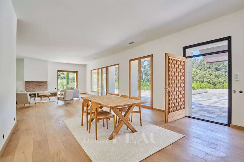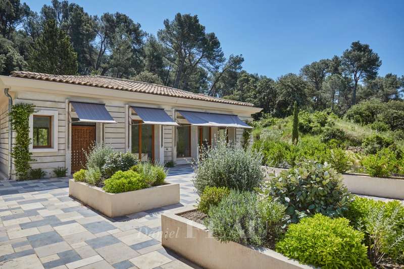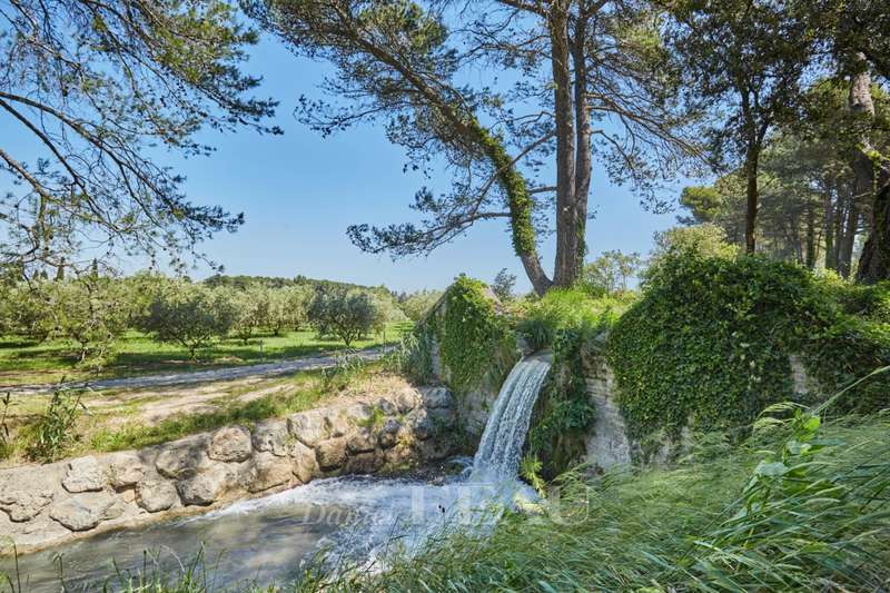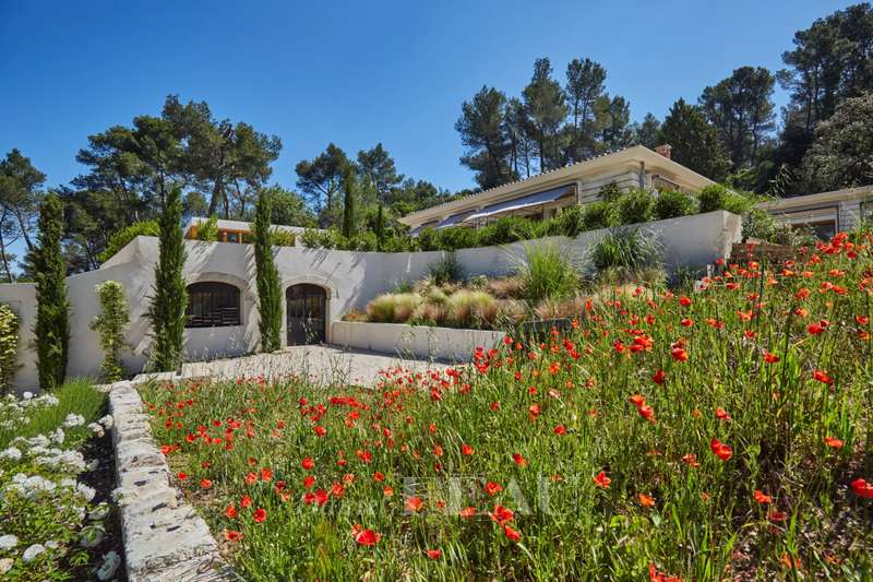 This exceptional mid 20th century property reminiscent of the Mid 20th century modern architectural style is in the Saint Rémy de Provence countryside in the heart of the peaceful Alpilles area. Set in over 3 hectares commanding an open view and on a hillside, it offers 370 sqm of floor space and about 280 sqm of living space. It includes a near 85 sqm living/reception room with a fireplace, a dining room, an open-plan kitchen with a pantry, four suites set around a patio planted with olive and cypress trees, and a conservatory bathed in sunshine and opening onto a wide terrace. A lift from a heated 3-car garage accesses the upper floor. With a guest house, a workshop, a 200 sqm terrace and a 12 x 6 metre swimming pool with a shutter.