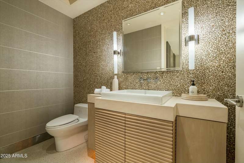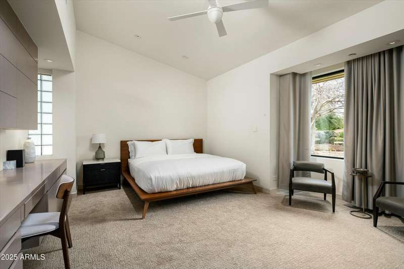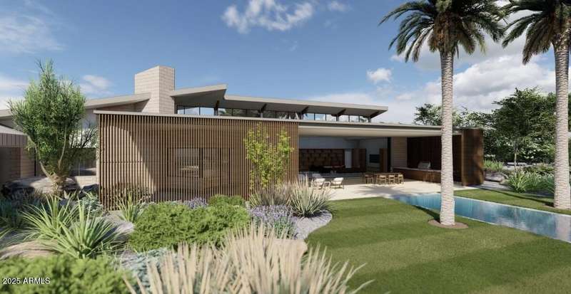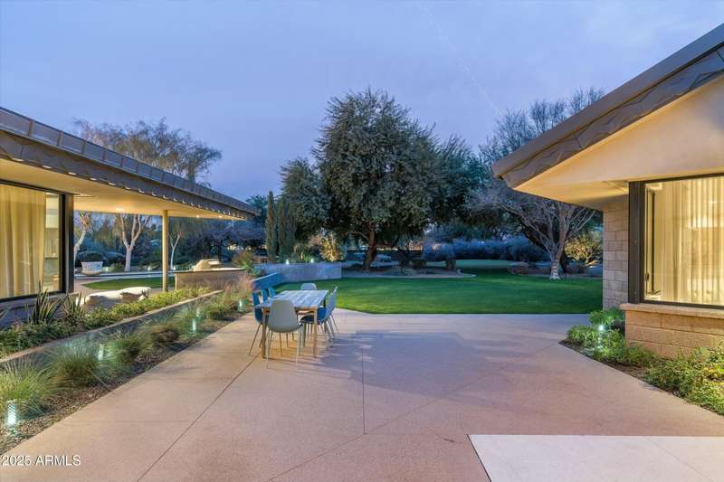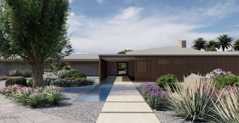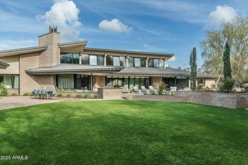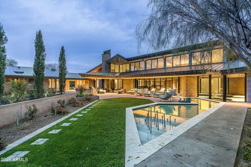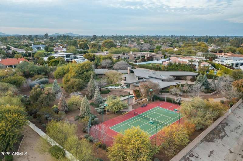 Experience Architectural Brilliance in the Heart of Paradise Valley! Step into a world of inspired design and unmatched elegance in this privately gated 2.5-acre estate—a true architectural gem that pays homage to Frank Lloyd Wright's organic principles. Envisioned by Taliesin-trained architect Gustad Irani and expertly brought to life by award-winning La Casa Builders, this residence is a rare blend of form and function. Thoughtfully designed with a modernist vision, the home showcases luxurious and refined finishes—from zinc-inlaid terrazzo floors to bespoke Fiddleback English Sycamore cabinetry. Striking geometric lines and thoughtfully selected materials establish a warm yet sophisticated atmosphere across 7,041 square feet of interior living space, including a 1,291-square-foot detached guest house with two en-suite bedrooms, a full kitchen, living room, laundry, and its own 2-car garage. The main residence features 6 bedrooms, 8 bathrooms, and a 6-car garage, with the primary suite offering a private office, exercise room, and tranquil views of the indoor therapy pool. A separate guest wing within the main house includes two en-suite bedrooms, a private living area, and a kitchenetteideal for multigenerational living, long-term guests, or live-in support. Resort-style outdoor living is reimagined with a heated indoor lap pool, a reflecting pool, and spaall set amid lush, mature landscaping that blurs the lines between interior and exterior spaces. The grounds are complete with a north/south-facing tennis and pickleball court, putting green, and generous entertaining areas designed for year-round enjoyment. Whether enjoyed as a primary residence or held as a rare investment, this architectural masterpiece embodies timeless elegance and intentional design at every turn.