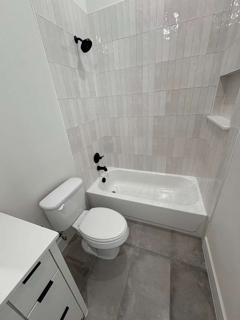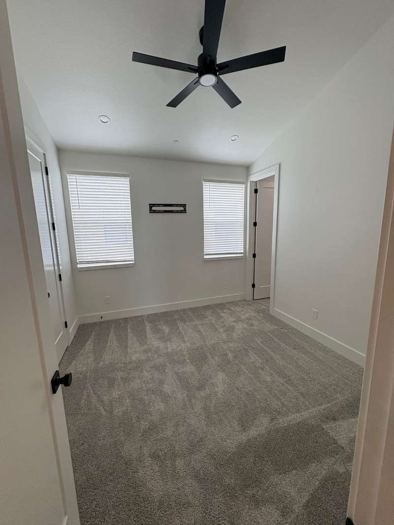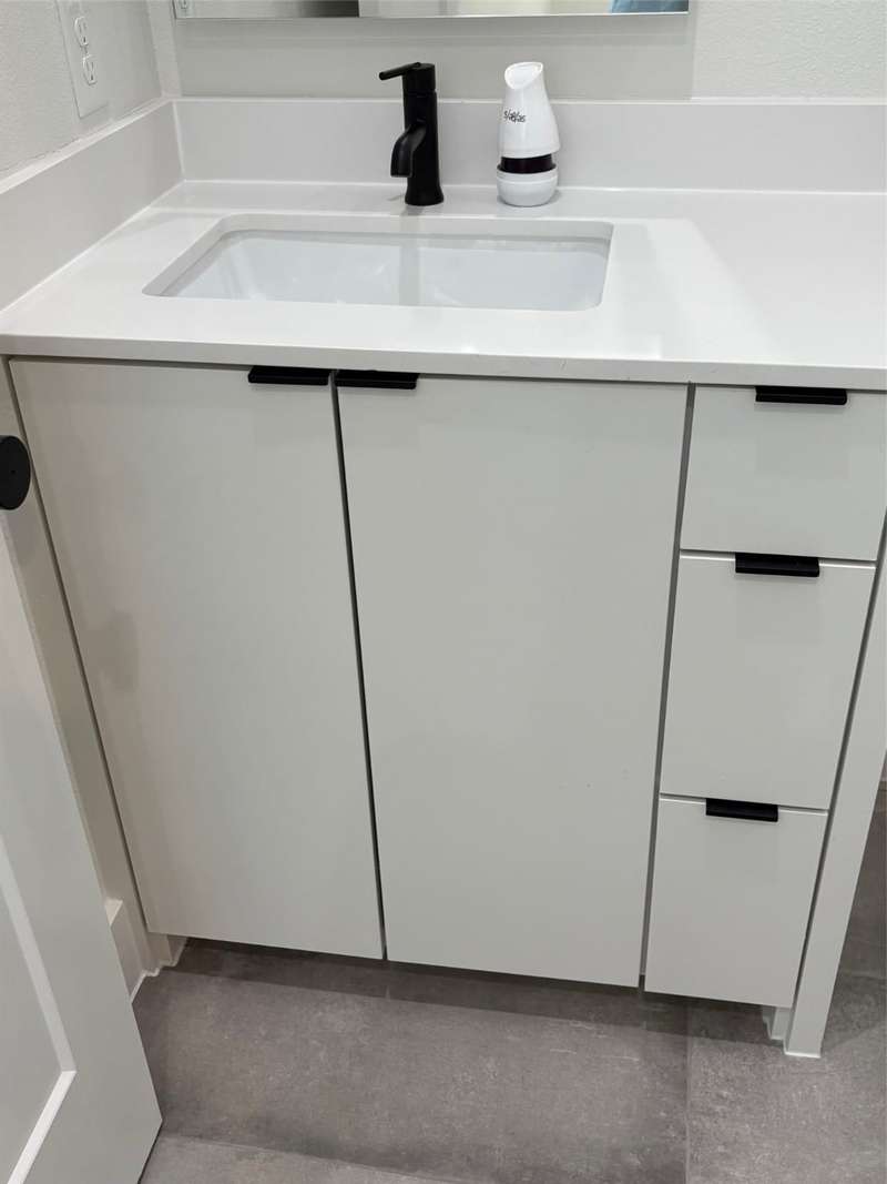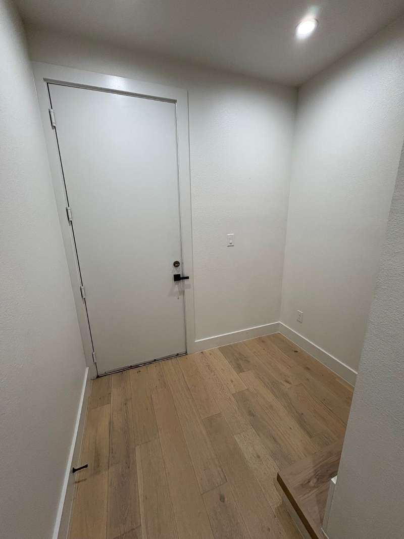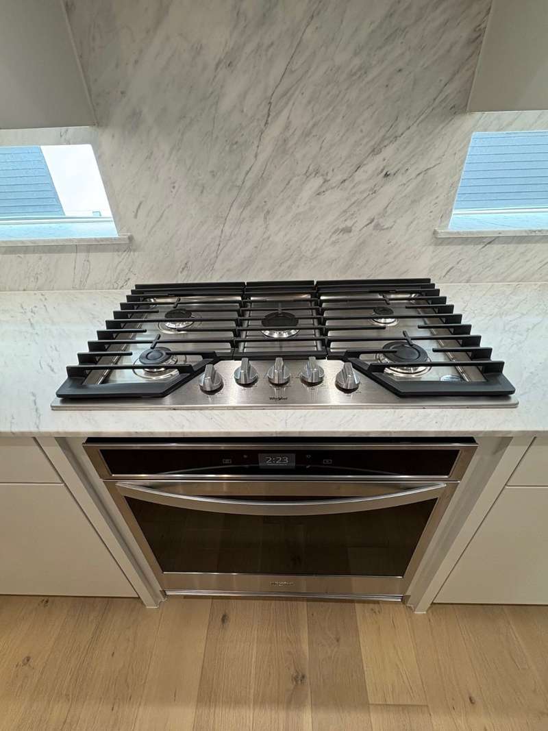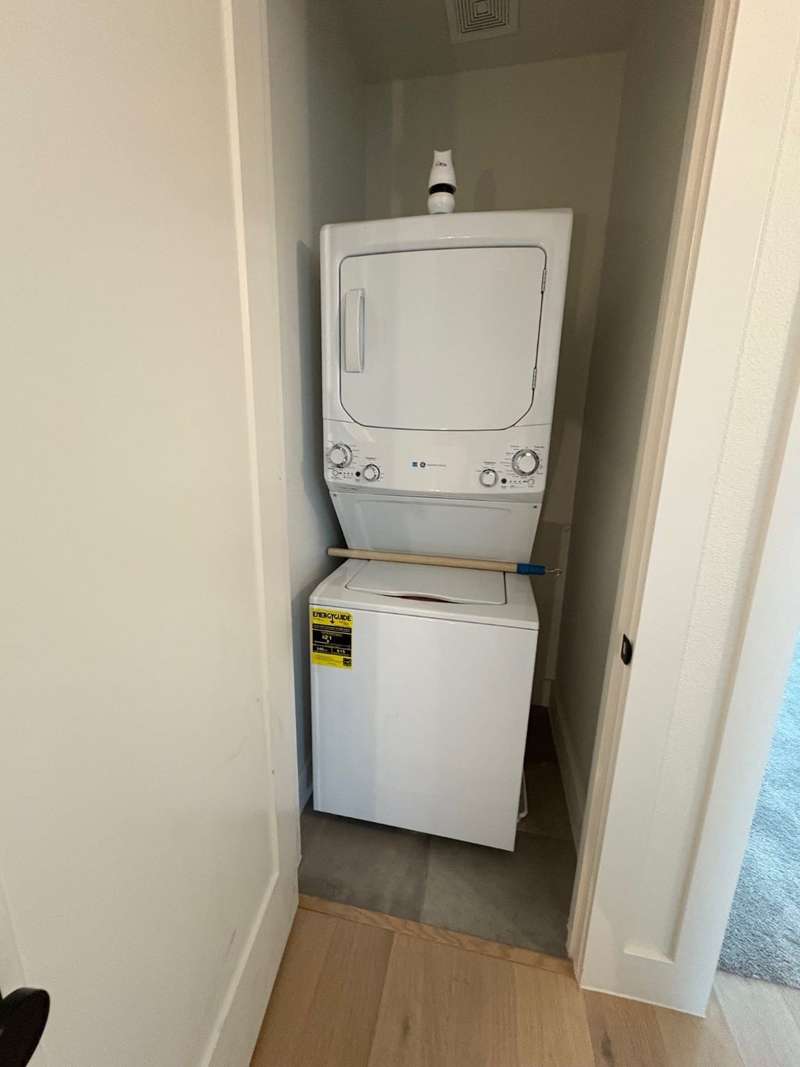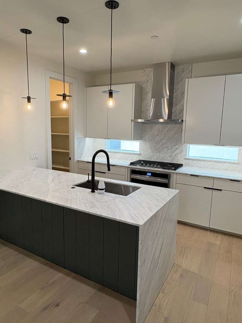 Three story condominium with the kitchen, half-bath, living room combined with the dining room is located on the second floor. The kitchen features stainless steel appliances, quartz countertops and a large peninsula island with bar seating and a farm sink. Gas cooktop. Pendant lights over island. Vinyl plank flooring is on the 1st and 2nd floors, and multiple stairs. Ensuite primary bedroom is located on the third floor. Walk-in closet in primary bathroom, separate shower and double sink vanity. Second closet is located in the primary bedroom. Ensuite second bedroom and bath is located on the third. floor. The third bedroom or flex room with a closet is located on the first floor. Two car attached garage with a garage door opener. Community green space is provided in front of the building.