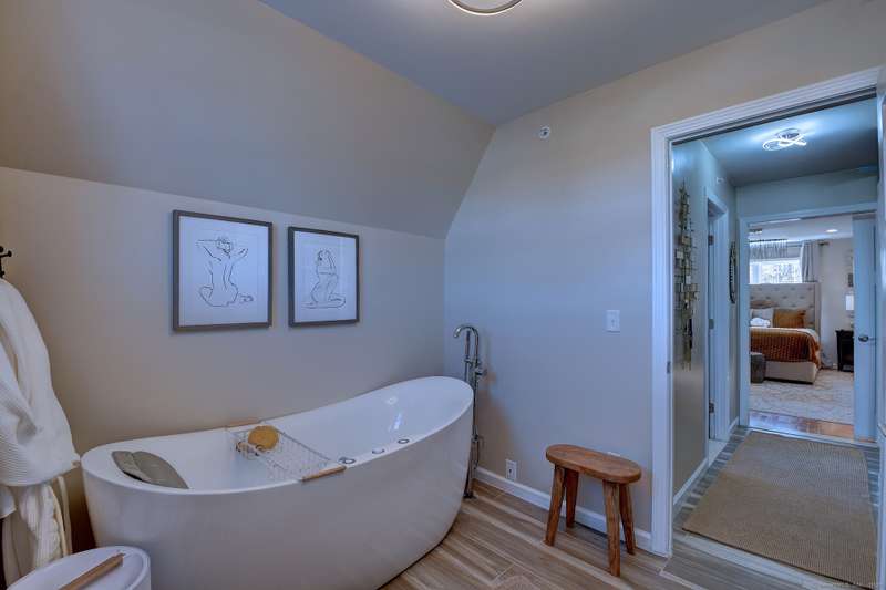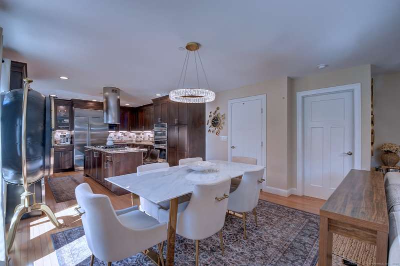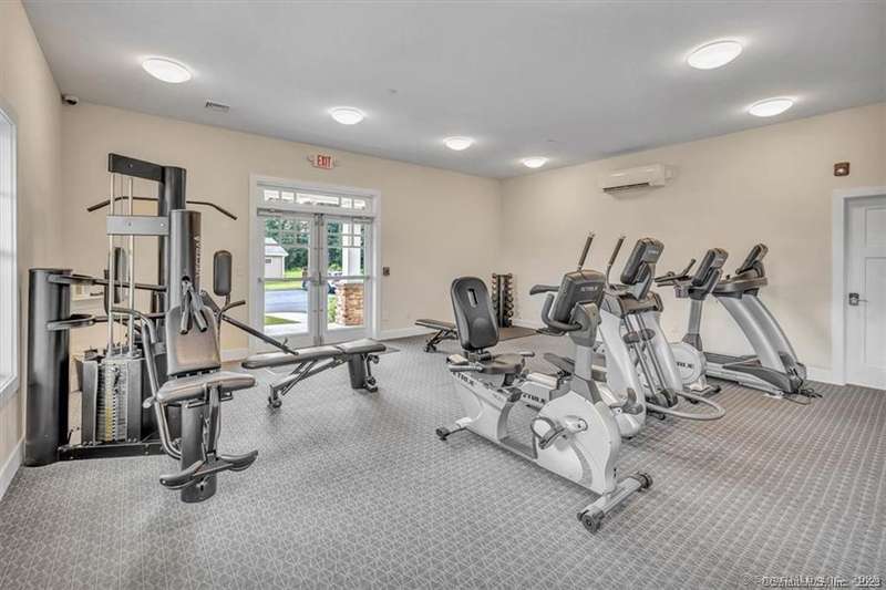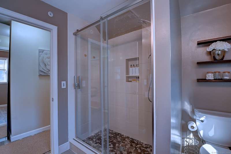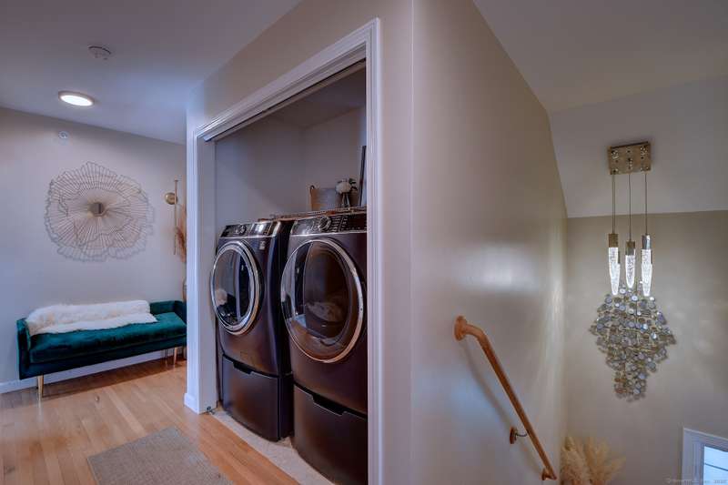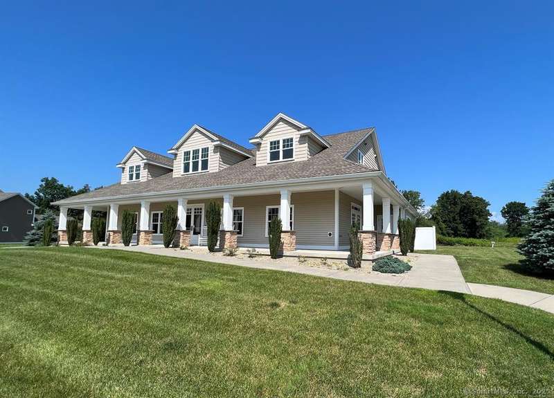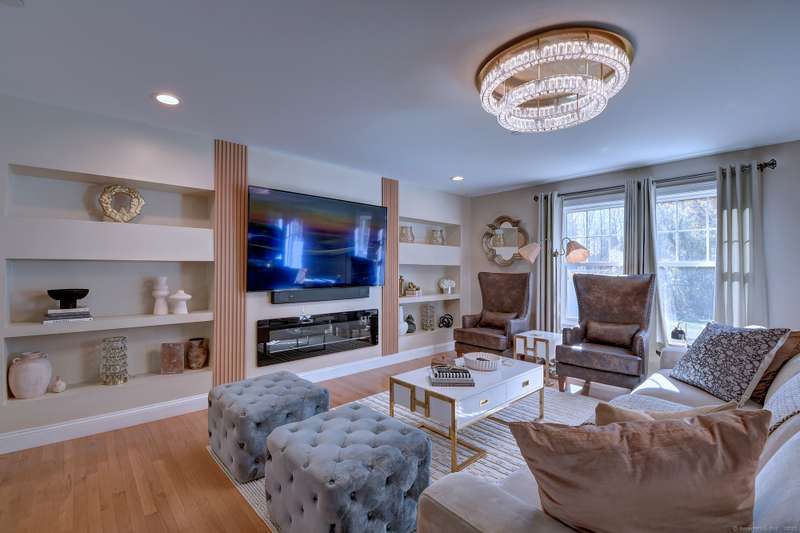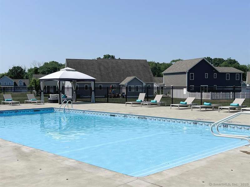 Stunning freestanding unit at The Villages at Poquonock with many premium upgrades and beautiful natural light. The pretty & functional foyer opens to an open floor plan featuring an island kitchen with high end appliances, a dining area with sliders to the back patio, and a living area with a spectacular modern feature wall with a centrally mounted flat-screen TV and cozy electric fireplace flanked by recessed shelves for a clean, custom look. Upstairs, the elegant primary suite has hardwood floors, a beautiful en-suite bath, and generous closets. The walk-in closet has been tranformed into a spa-like tub room but the seller plans to remove the tub and reinstall the closet shelving. One bedroom is being used as a closet/dressing room but will be restored to a bedroom - also with hardwood floors. Two additional bedrooms, a full bath, and a laundry closet complete the 2nd floor. The full basement is clean, dry, and unfinished. The deep yard backs to woods for additional privacy and is f