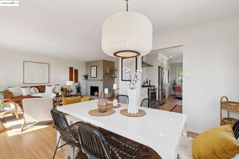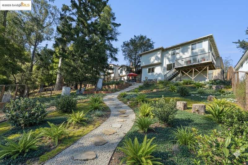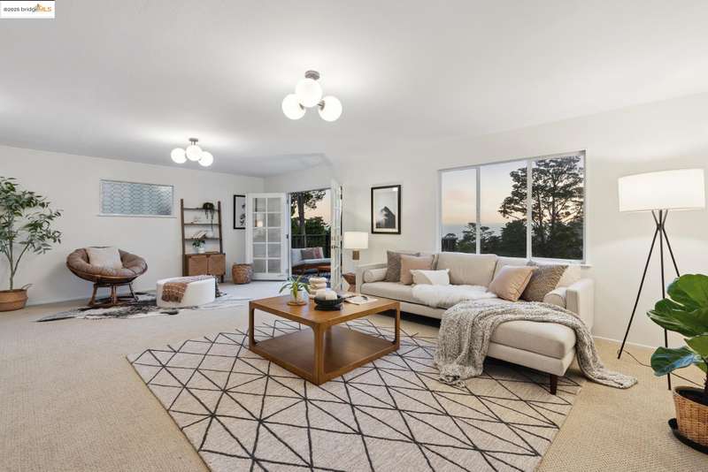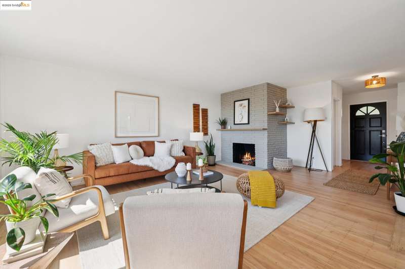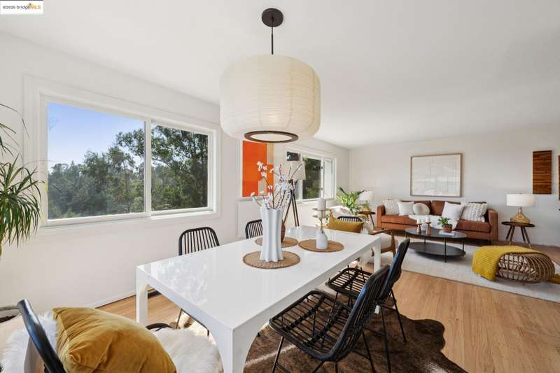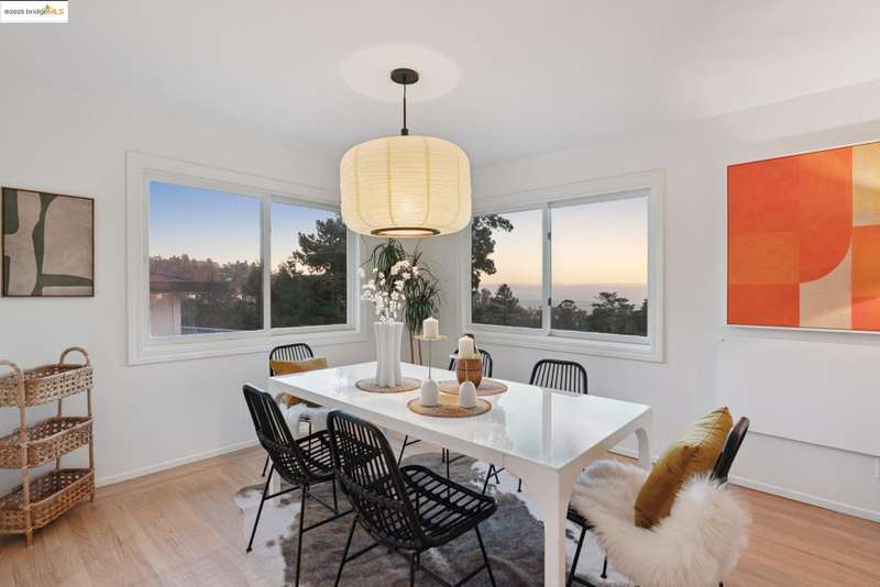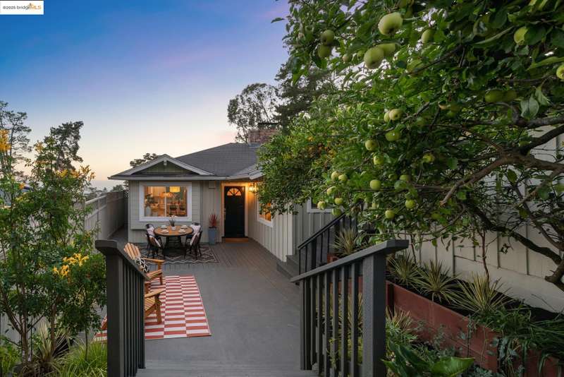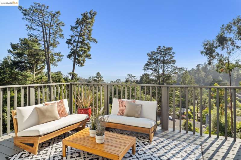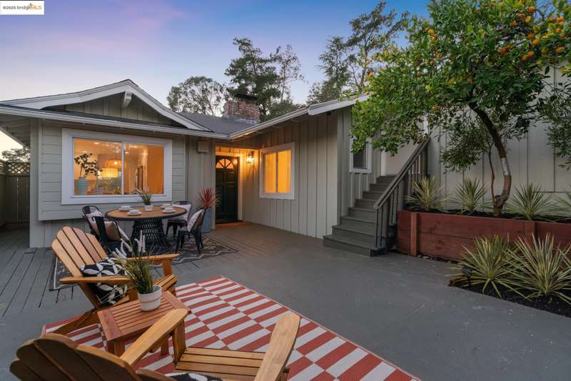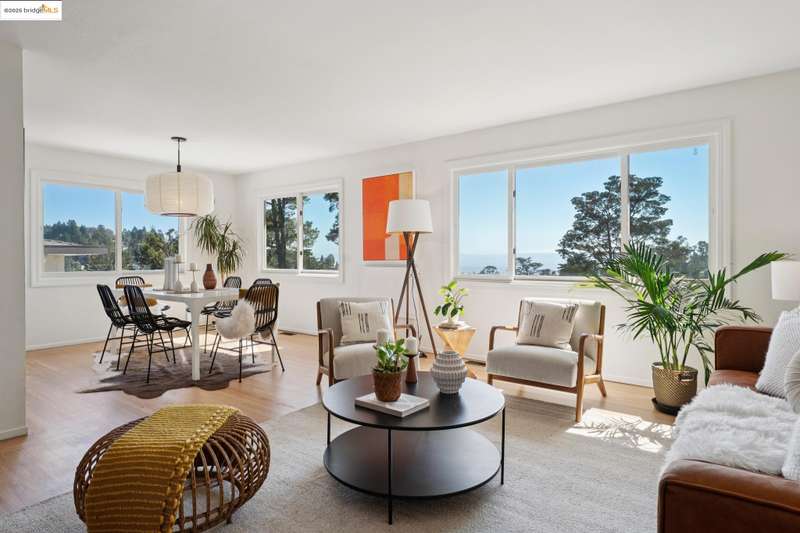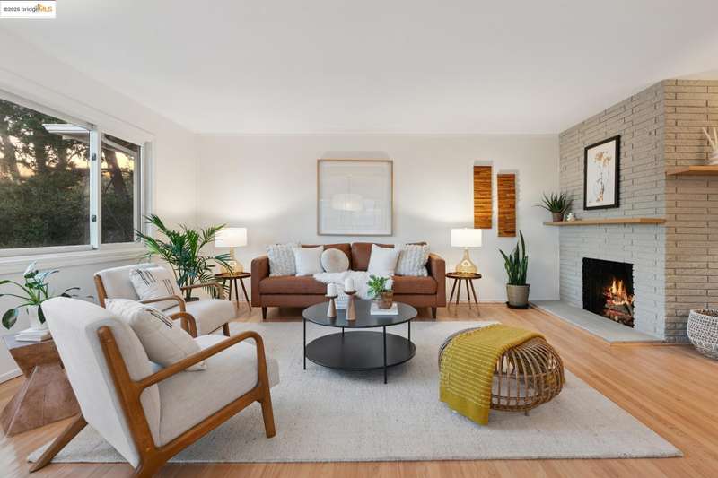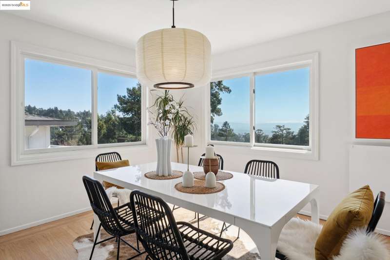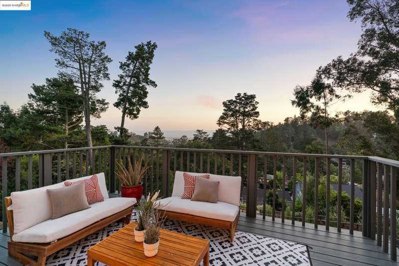 Nestled in the Montclair Hills, 6827 Ridgewood Drive is a light-filled mid-century retreat with Bay views and inviting spaces throughout. The main level features an open living and dining area framed by wide windows with ever-changing outlooks of the sky and city. Outdoor dining takes center stage—enjoy evening meals al fresco beneath a starlit sky on your private patio. The spacious, sun-drenched kitchen has been updated with high-quality, mid-century–inspired finishes. Downstairs, an expansive family room with a cozy brick fireplace opens to a private deck and large backyard—the perfect setting for morning coffee, sunset evenings, or casual gatherings. Two additional rooms provide flexible options for bedrooms, guests, or a home office. The backyard is expansive and a true blank canvas, ready for a lush garden, outdoor dining haven, or your own creative landscape design. Just minutes from Montclair Village, top-rated schools, commuter routes, and nearby hiking and biking trails are just minutes away. This slice of nature’s paradise offers hillside serenity with everyday convenience. Come make it your own! www.6827Ridgewood.com