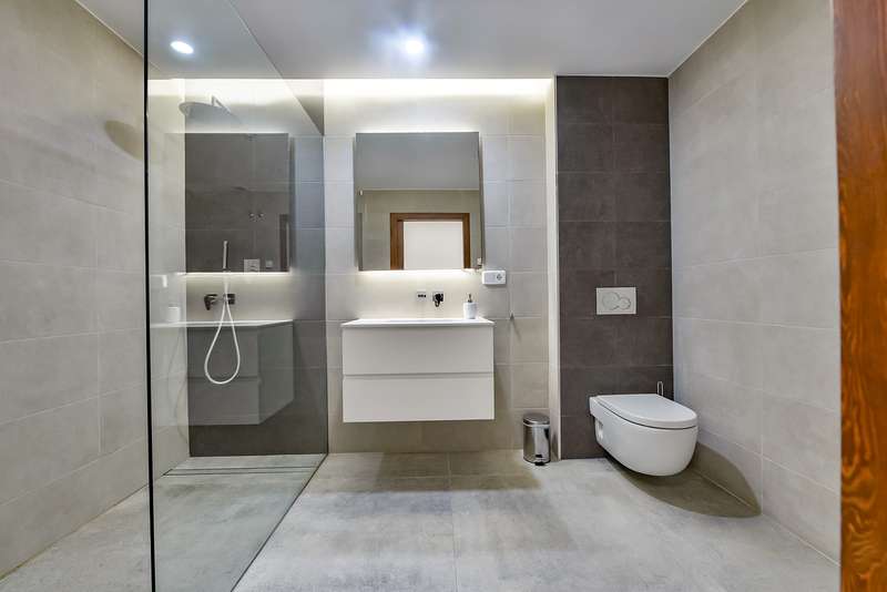 The master bedroom features sea views, built-in wardrobes, and an en-suite bathroom with a shower, bathtub, and double vanity. Two additional en-suite bedrooms each have their own private bathrooms. The lower floor boasts a second living room, dining area, and an open kitchen—perfect for guests.
