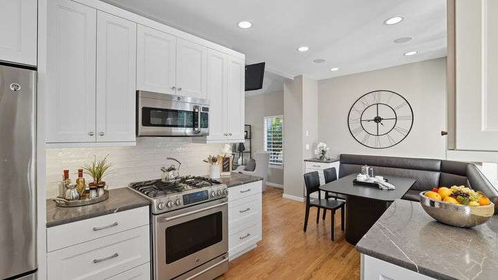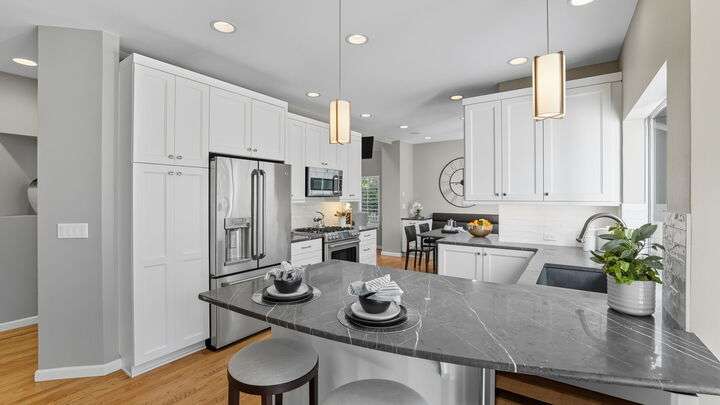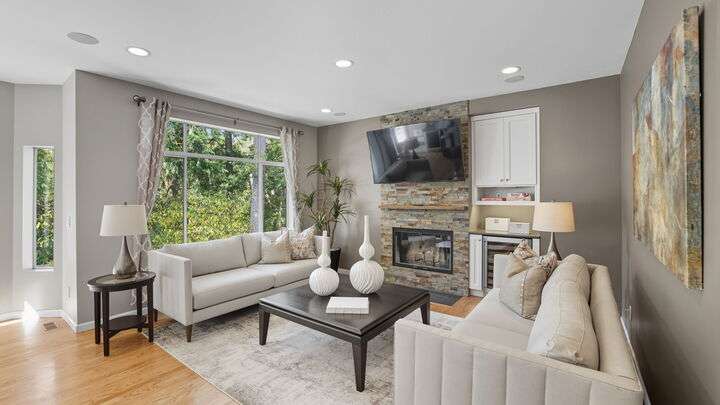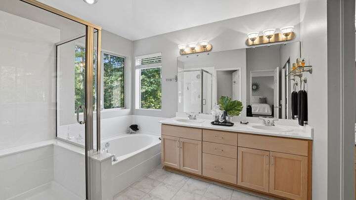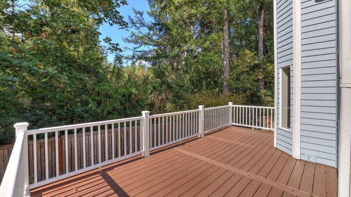Updated 4-bedroom home on a quiet street in The Willows backing to a lush greenbelt. Vaulted ceilings and skylights fill the home with natural light. Real hardwood floors flow through the main living areas, complemented by plantation shutters in the formal rooms. The remodeled kitchen features Pietra Grey marble counters, glass tile backsplash, and high-end appliances with gas and electric cooking. The family room offers a slate-surround wood-burning fireplace and large TV that stays. The primary suite includes a sitting area, French doors, and a luxurious 5-piece bath with heated tile floors. Enjoy a fully fenced yard, large Trex deck, & access to Klahanie’s pools, parks, trails. Top-rated Issaquah schools. Pre-inspected.