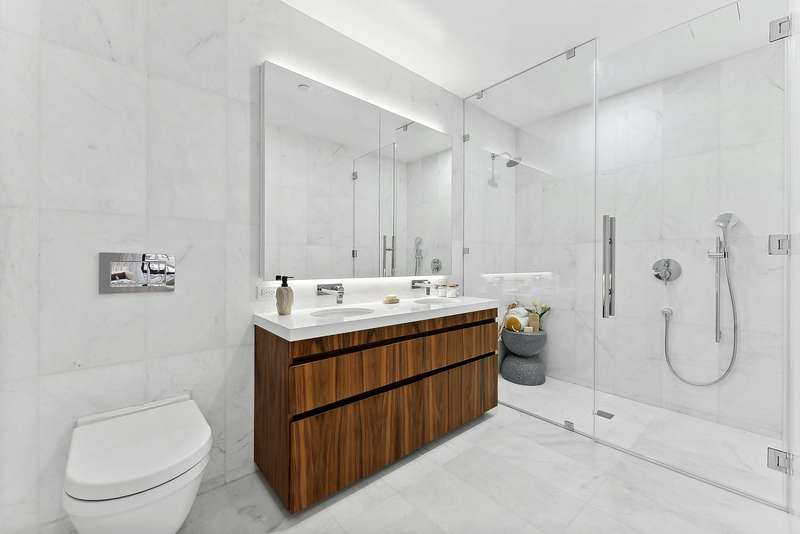 The bedroom wing is tucked away from the main living areas and includes a laundry closet with a full-size Miele washer and dryer. The spacious second bedroom features a large closet and offers garden views to the south, with the second bathroom conveniently located across the hall. The oversized primary bedroom boasts a private south-facing balcony and a walk-in closet. The elegantly appointed primary bathroom features heated floors, North Pearl marble, a custom BOTTEGA vanity, and Hansgrohe chrome fixtures.