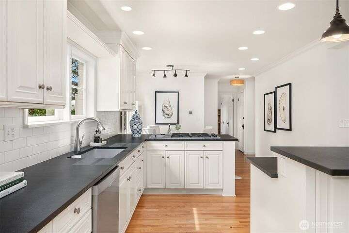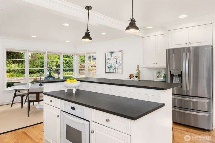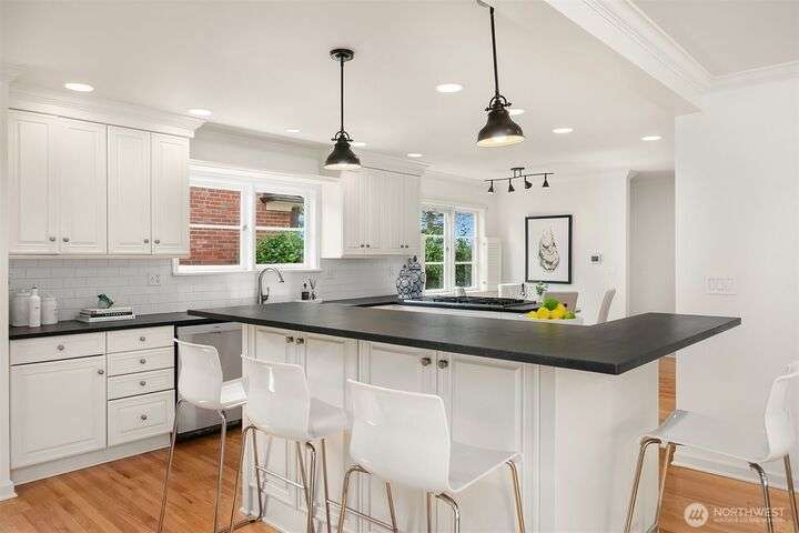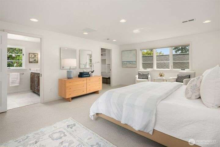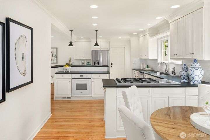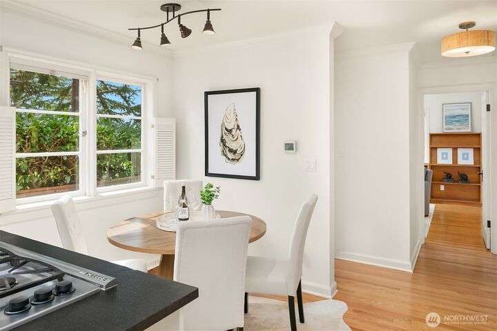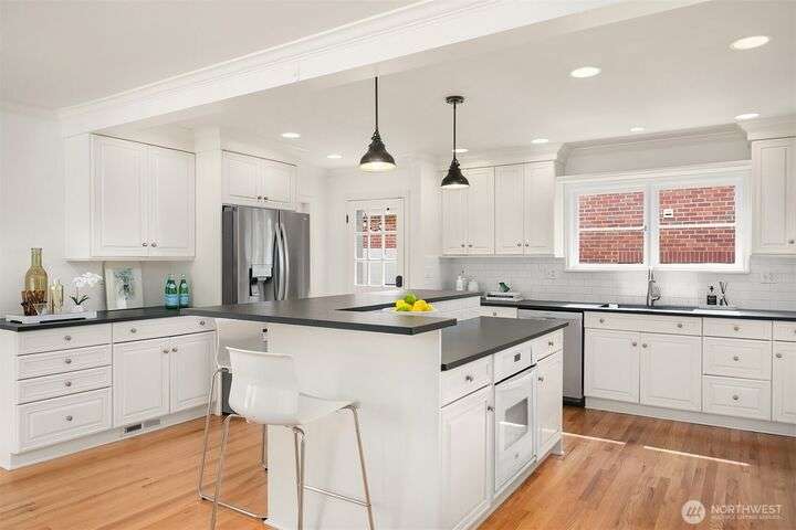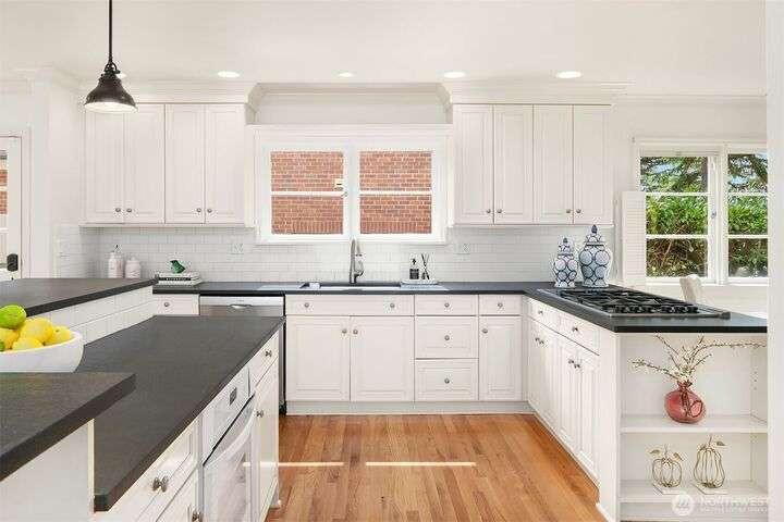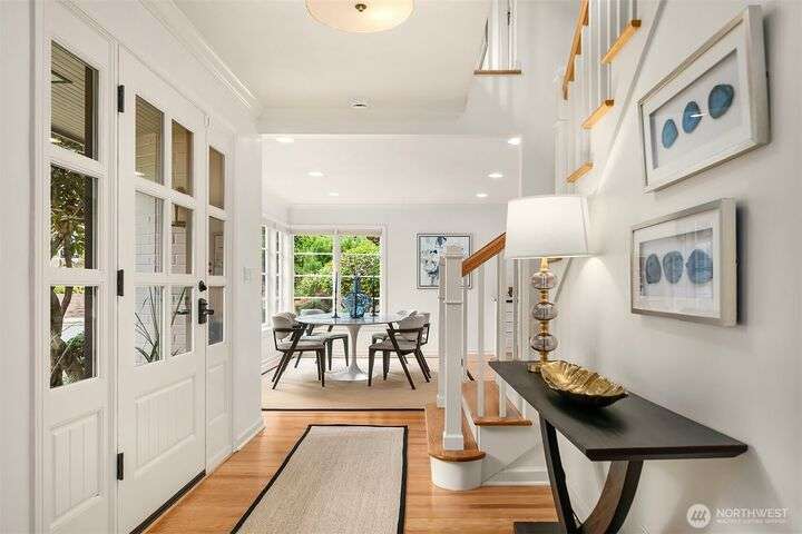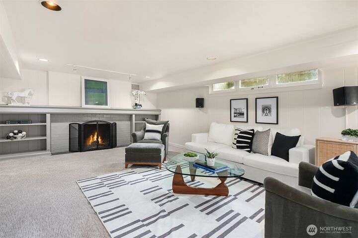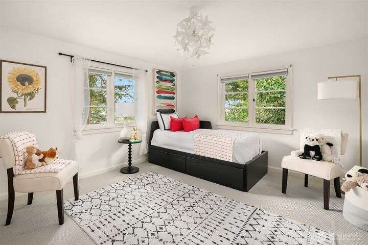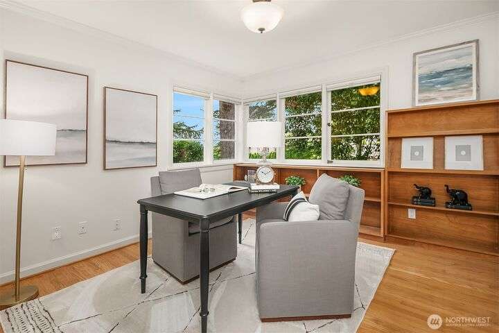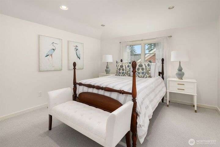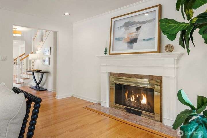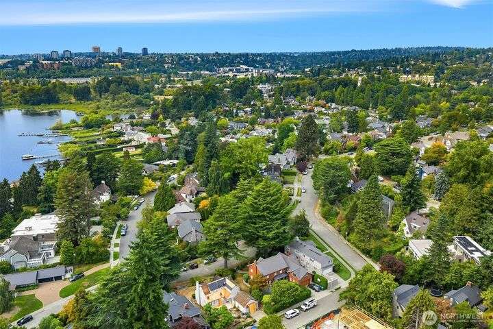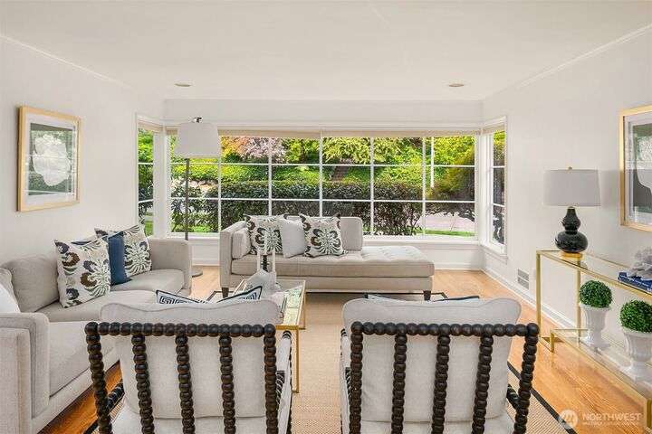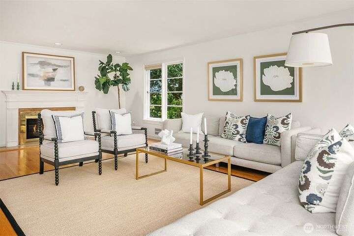 Prestigious Laurelhurst living on a rare oversized corner lot near Lake Washington, Husky Stadium, University Village & Children's Hospital. This elegant residence features a 2-car garage, private entertaining patio & garden spaces. The spacious kitchen with breakfast nook opens to a sunny dining room and leads to the grand living room with wood-burning fireplace. Flexible main floor bedroom/office, plus 4 bedrooms upstairs (1 with lake views!) including a serene primary suite with walk-in closet & spa-like bath. Lower level offers a rec room with fireplace, playroom/optional bedroom, laundry & abundant storage. Enjoy modern comforts with A/C, all within the coveted Laurelhurst Beach Club boundaries & just 2 blocks from public lake access.