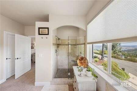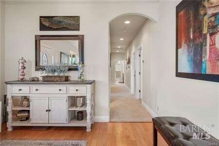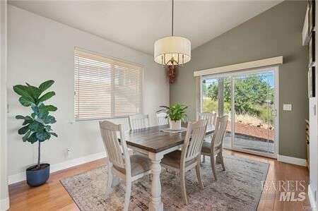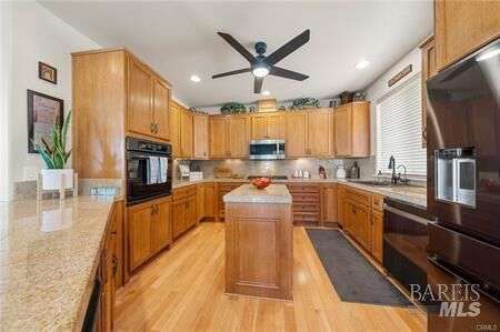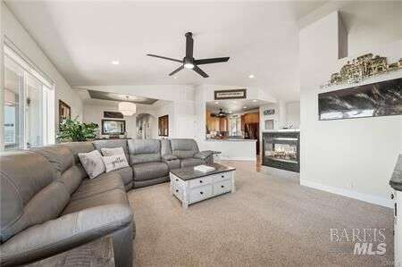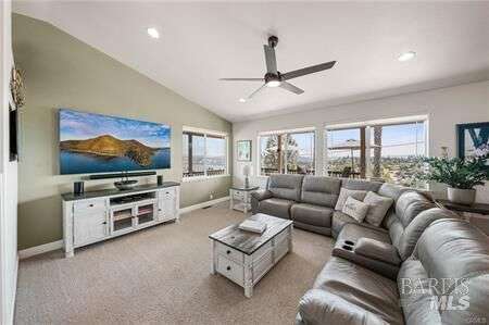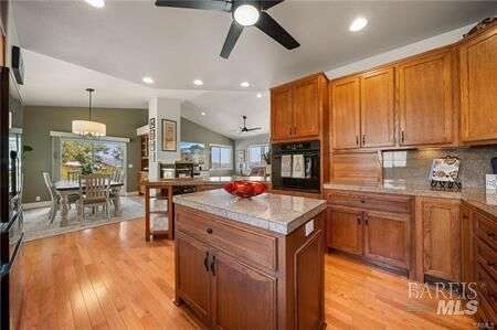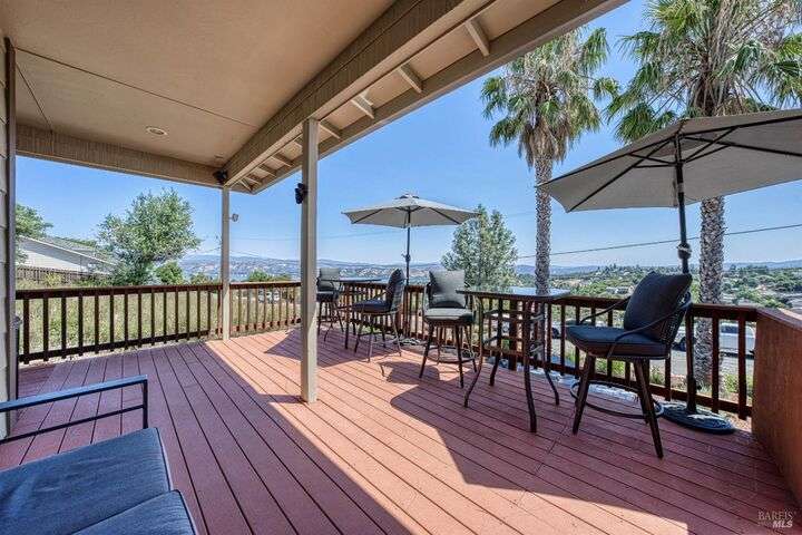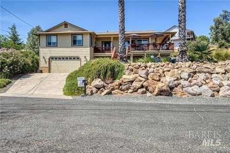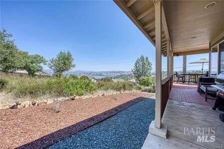 This custom single-level home offers 2168 sq ft of living space with stunning lake, wine country, and mountain views from its quiet court location. It includes a 950 sq ft oversized garage, low-maintenance landscaping, and wrap-around decks for outdoor living. Inside, a formal entry with coffered ceilings and modern lighting leads to an open great room. This area features vaulted ceilings, ceiling fans, a three-sided fireplace, and artistic niches. The large kitchen, adjacent to the formal dining area, has granite countertops, stainless steel appliances, a center island, and a peninsula. The dining area also has a built-in buffet and deck access. All three bedrooms are on the same level, along with an oversized laundry room that doubles as office space. The primary bedroom provides abundant windows, an en-suite spa-style bathroom with a walk-in custom-tiled shower, a soaking tub with vineyard views, a toilet room, and a walk-in closet. The second and third bedrooms have closets and carpeting, and a hall bathroom with double sinks, granite countertops, and a tub/shower combo serves these rooms. The property also includes a concrete driveway. Located above Clearlake, you can enjoy year-round water sports, sunsets, and sunrises. Located 2 hours from Sacramento and San Francisco.
