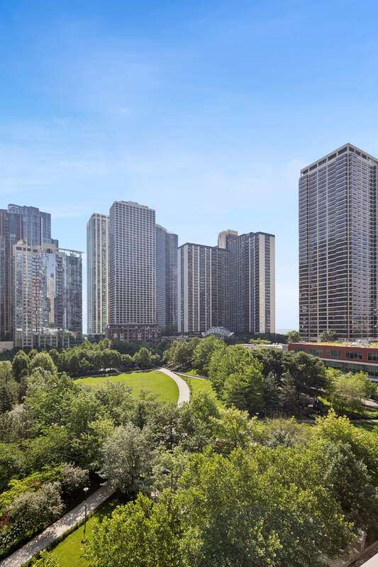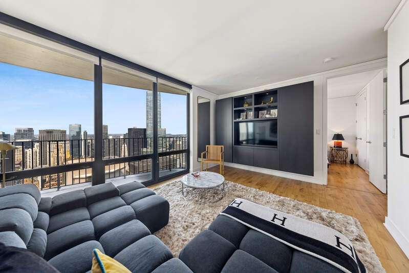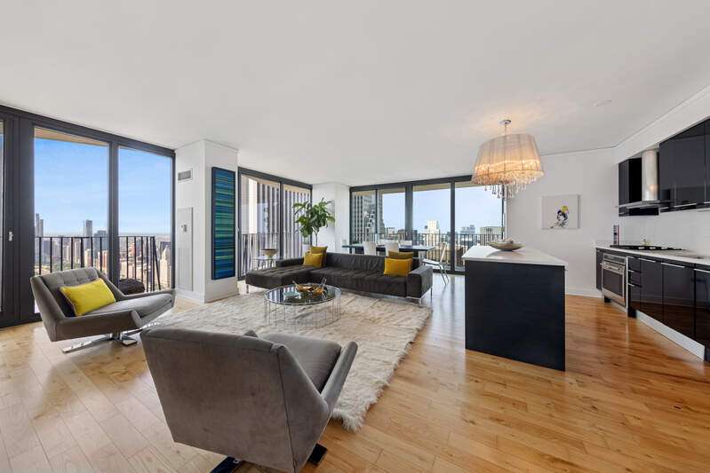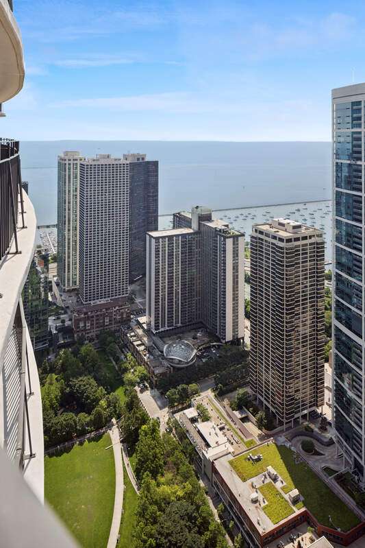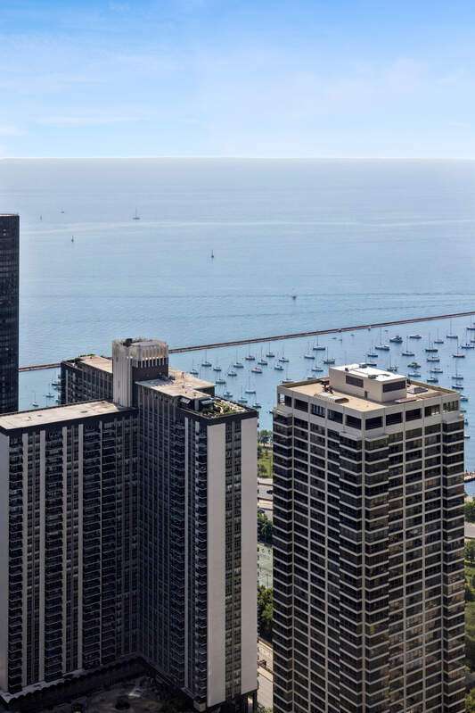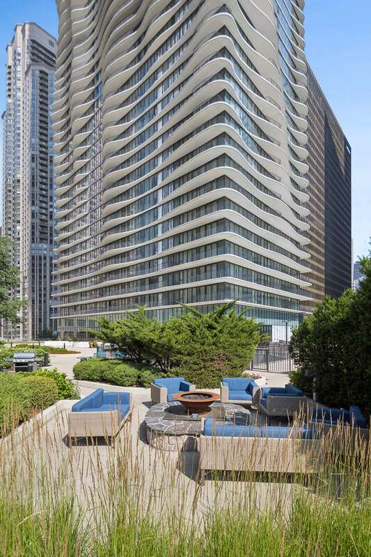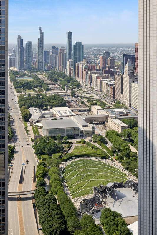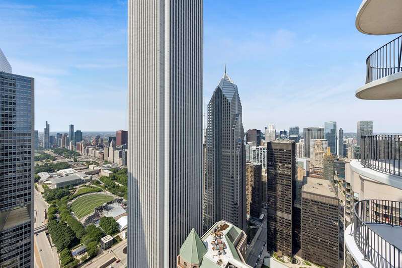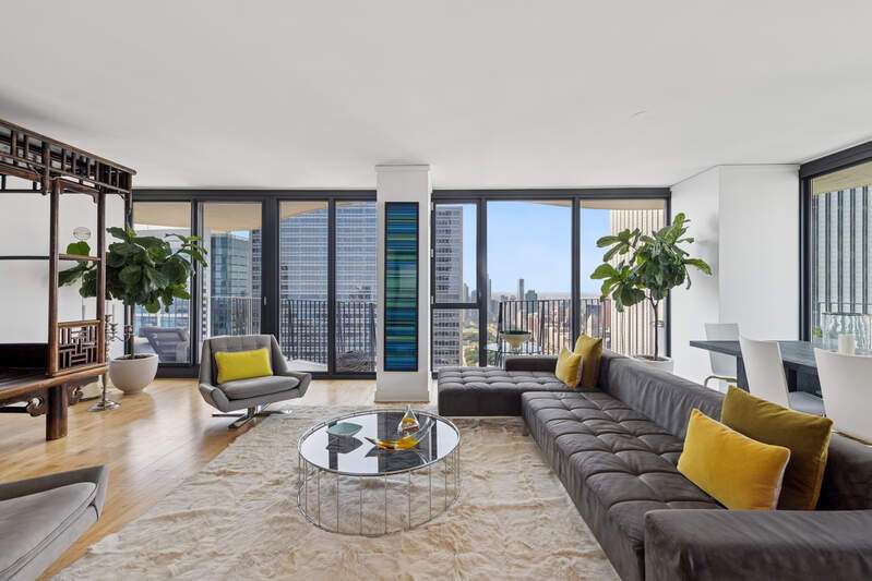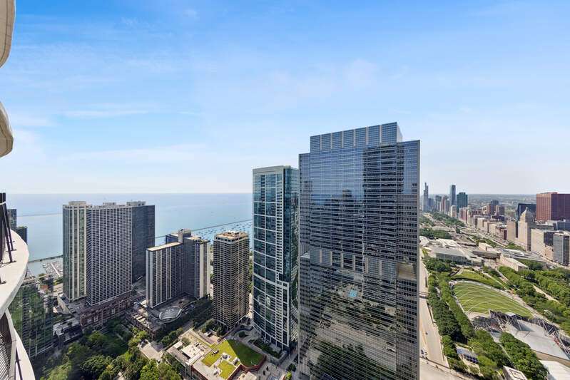 This Southwest corner condo was thoughtfully re-imagined to be a luxury larger two bedroom with a second living space in the award-winning Aqua Building. Each room offers floor to ceiling windows with stunning panoramic views of the lake, Grant Park and the western skyline. Enjoy unique outdoor living on the 75 foot terrace. Spacious living room and dining areas feature white ash hardwood floors throughout and carefully selected designer lighting. The kitchen boasts modern Snaidero cabinets, quartz countertops and backsplash along with Wolf and Miele stainless appliances. The stunning additional living space with western skyline views can be used as a family room, an office or converted back into a third bedroom and has been carefully designed with a media built-in unit. Escape into the primary bedroom suite with custom walk-in closet and tranquil spa bath with yet more stunning views. Additional design touches include custom millwork, oversized doors and window treatments. The Aqua Building was thoughtfully created and offers some of the best amenities in the city including indoor/outdoor pools, basketball court, fitness center along with a private club suite for owners. This is a unique must-see corner unit.