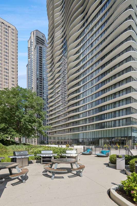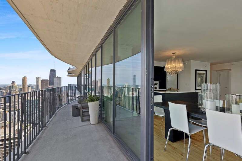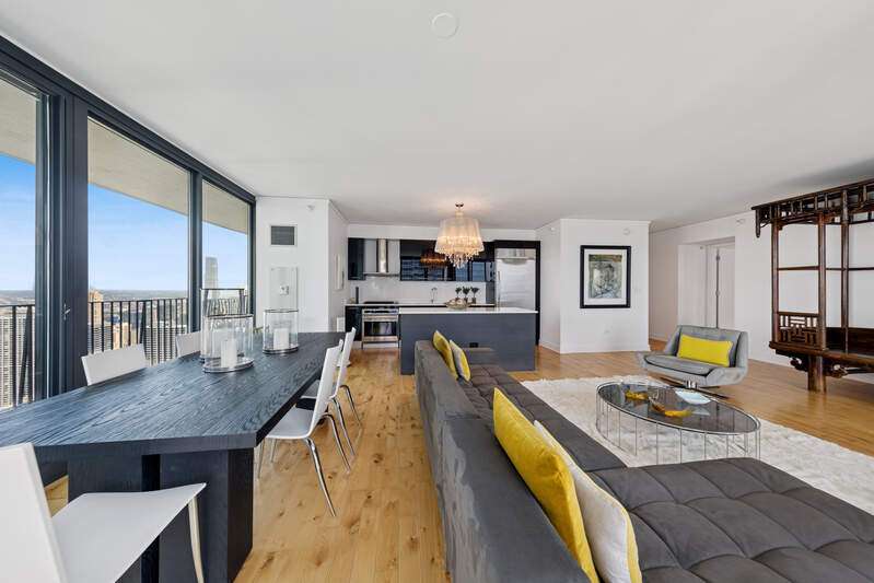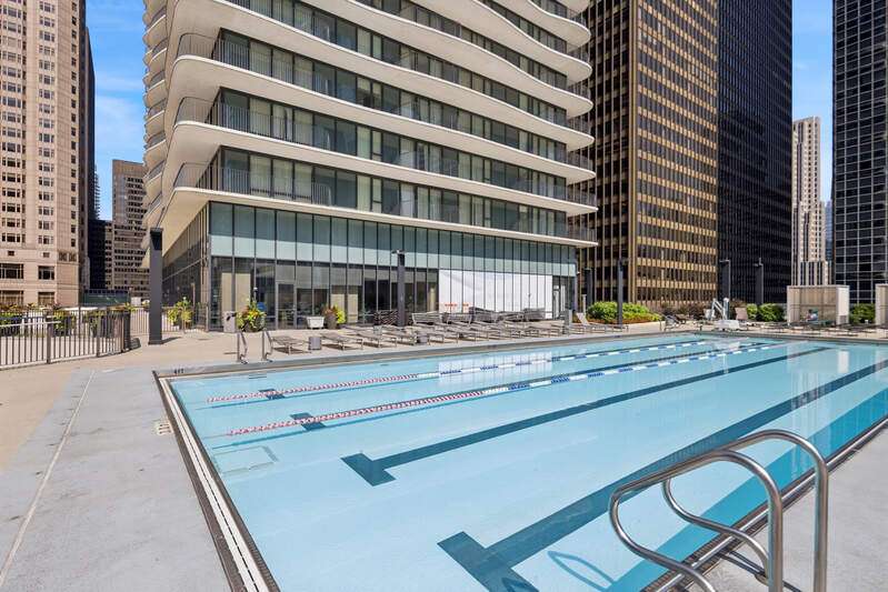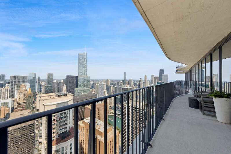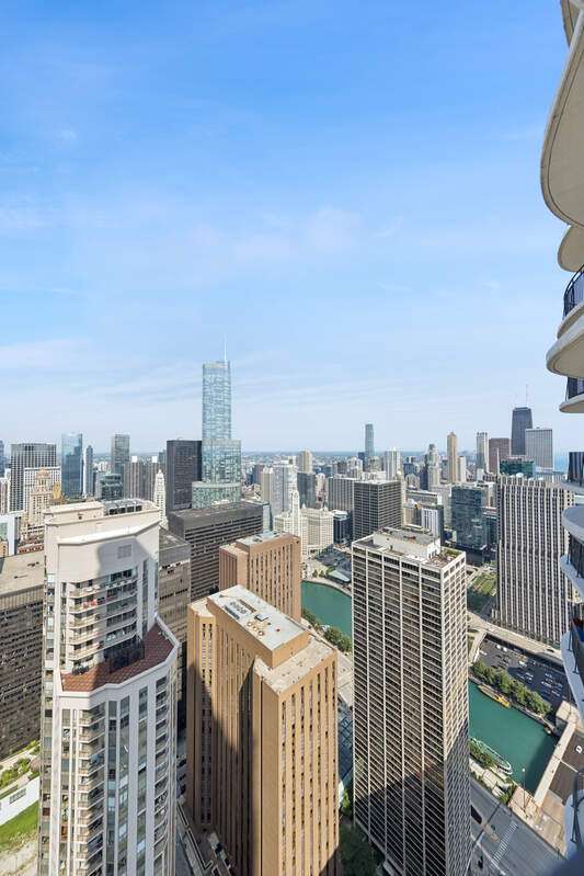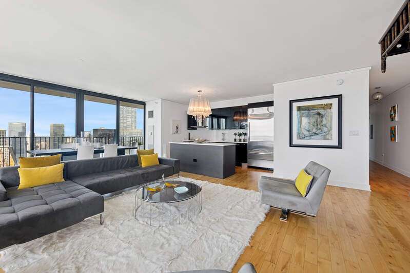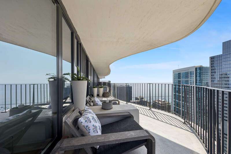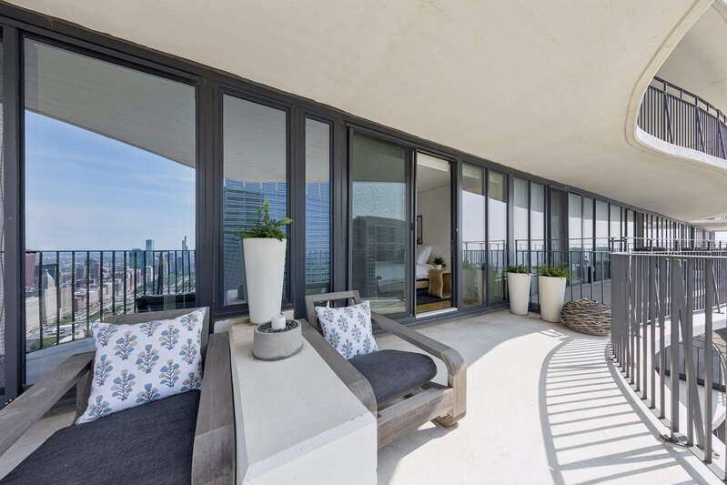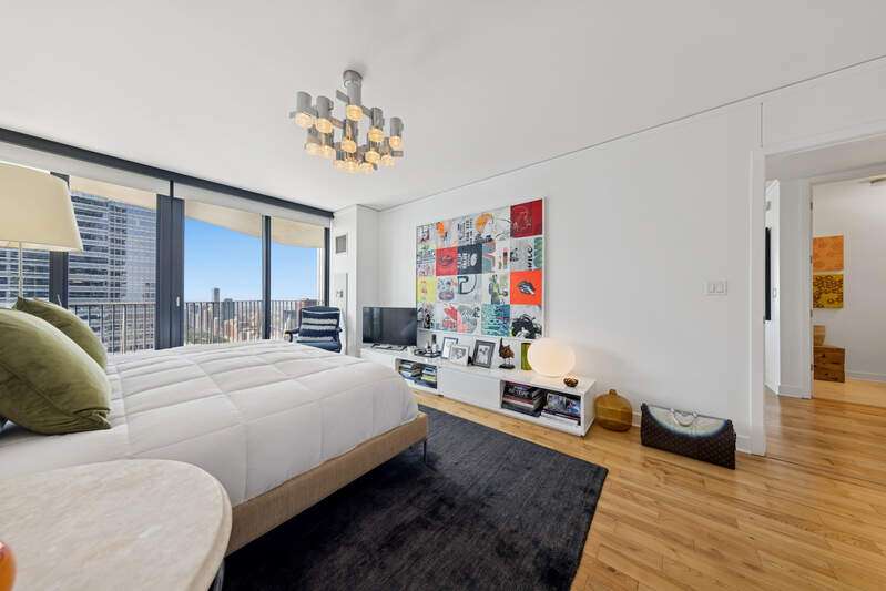 This Southwest corner condo was thoughtfully re-imagined to be a luxury larger two bedroom with a second living space in the award-winning Aqua Building. Each room offers floor to ceiling windows with stunning panoramic views of the lake, Grant Park and the western skyline. Enjoy unique outdoor living on the 75 foot terrace. Spacious living room and dining areas feature white ash hardwood floors throughout and carefully selected designer lighting. The kitchen boasts modern Snaidero cabinets, quartz countertops and backsplash along with Wolf and Miele stainless appliances. The stunning additional living space with western skyline views can be used as a family room, an office or converted back into a third bedroom and has been carefully designed with a media built-in unit. Escape into the primary bedroom suite with custom walk-in closet and tranquil spa bath with yet more stunning views. Additional design touches include custom millwork, oversized doors and window treatments. The Aqua Building was thoughtfully created and offers some of the best amenities in the city including indoor/outdoor pools, basketball court, fitness center along with a private club suite for owners. This is a unique must-see corner unit.