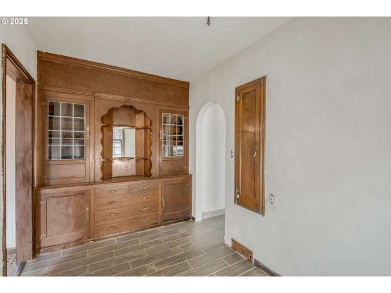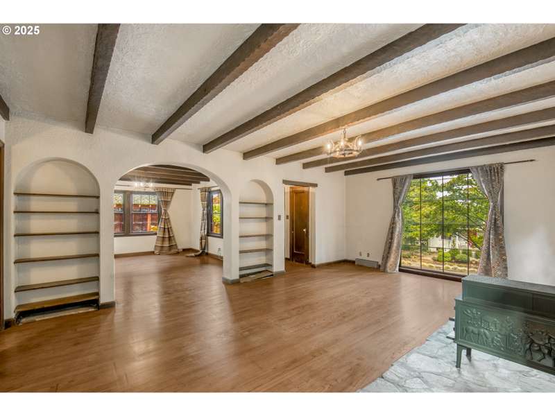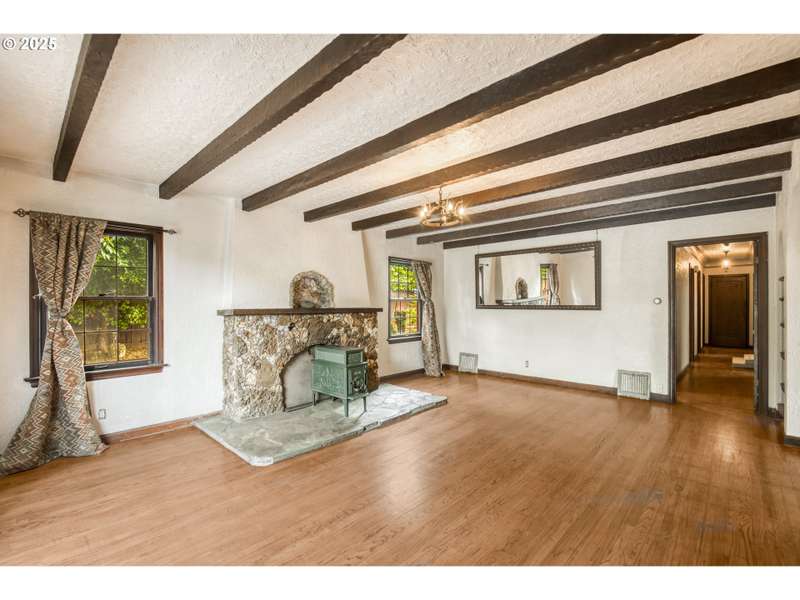 This thoughtfully updated 1934 gem blends historic character with truly one-of-a-kind details inside and out. The exterior is embedded with gem quality rocks, crystals, and petrified wood, setting the tone for a home that’s anything but ordinary. Enter through a crystal-ceiling entryway, then discover hand-hewn exposed wood beams, 2 show stopping rock-and-crystal fireplaces, 3/4 inch thick hard wood floors, a charming telephone nook with an original laundry chute, and a butler’s pantry with original built-in cabinets. With 3 spacious bedrooms, 1 full bath, and nearly 2,800 square feet of creative space, this home offers room to live, create, and entertain. Step outside to a private sanctuary featuring a tranquil scent garden, wrap-around entertainer’s porch, hot tub, wood shed, and mature landscaping with grapevines, kiwis, and more. This is not just a home—it's an experience. Own a piece of Portland’s soul. [Home Energy Score = 3. HES Report at https://rpt.greenbuildingregistry.com/hes/OR10241551]