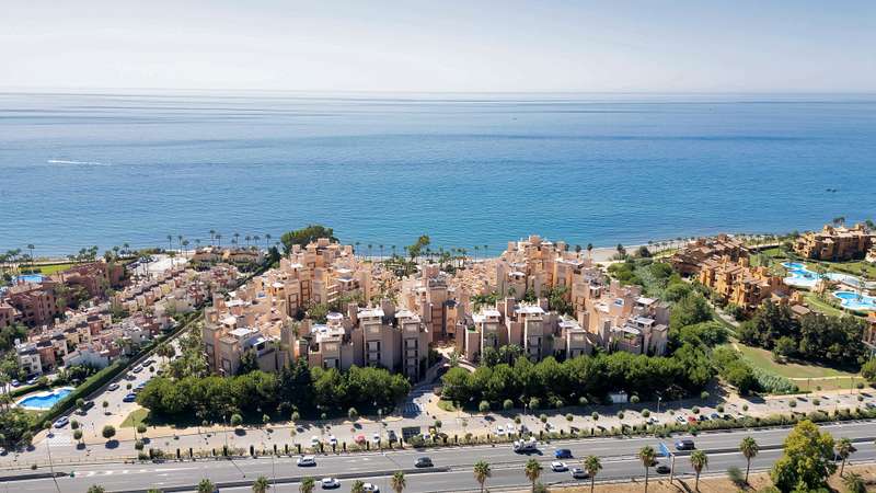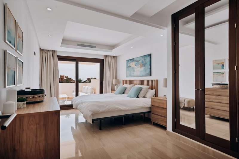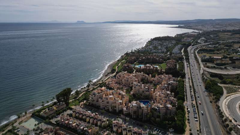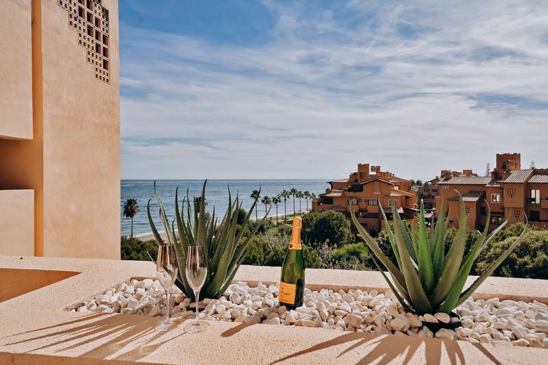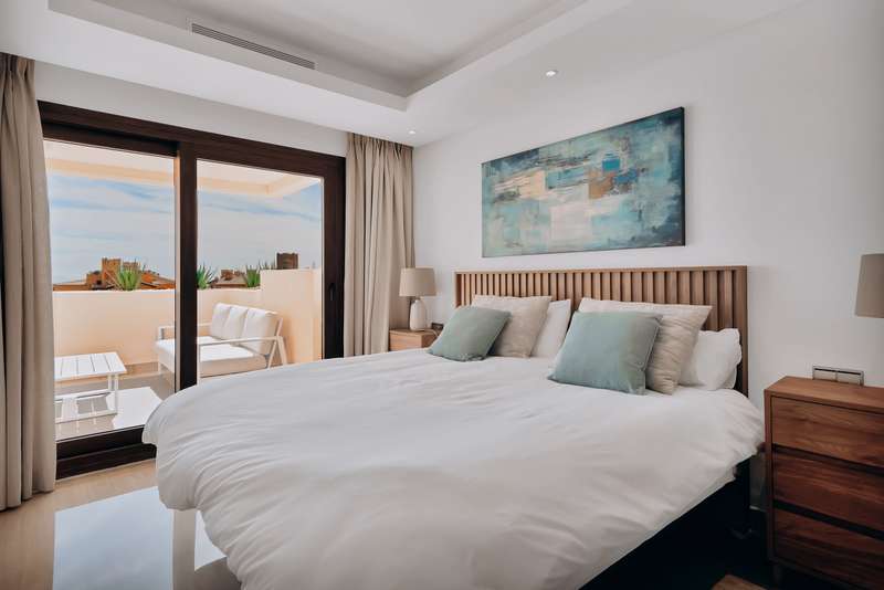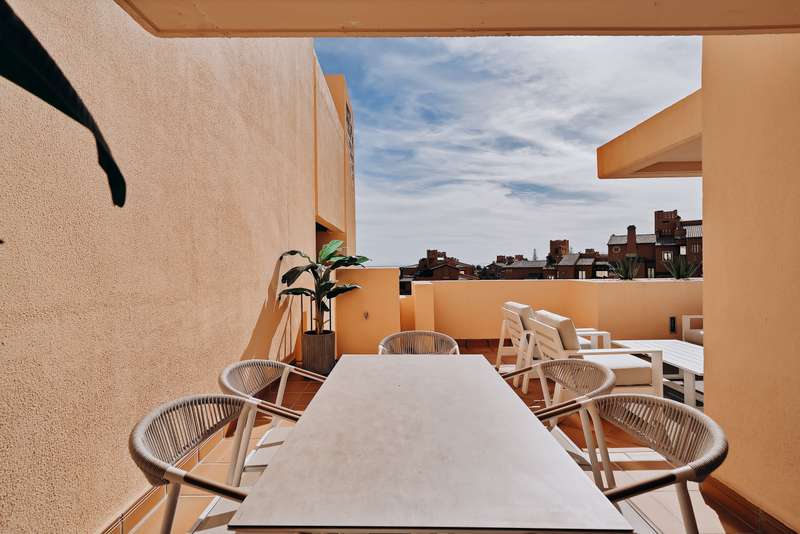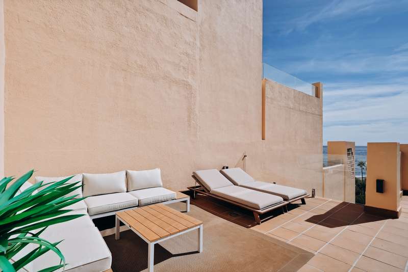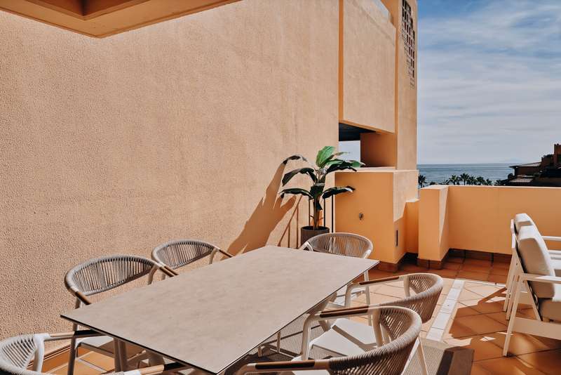 This spectacular 3-bedroom, 3-bathroom duplex penthouse, located in the prestigious Bahía de la Plata development, right on the beachfront in Estepona. A truly unique property that combines luxury, comfort, and an unbeatable setting with breathtaking views of the Mediterranean Sea and the Rock of Gibraltar. Fully renovated in a refined Nordic style, the residence offers bright open spaces, clean lines, and top-quality finishes, creating a sophisticated yet welcoming atmosphere—perfectly suited to the Mediterranean lifestyle. On the main floor, large windows connect the living-dining area with a private terrace, an ideal spot to unwind while enjoying the sea views. The modern, fully equipped kitchen blends seamlessly into the open-plan design, making it ideal for family life or entertaining guests. Each of the three en-suite bedrooms ensures privacy and comfort, with the master suite boasting direct access to the stunning panoramas. The property is in excellent condition, move-in rea