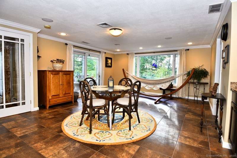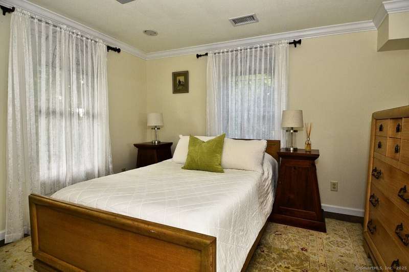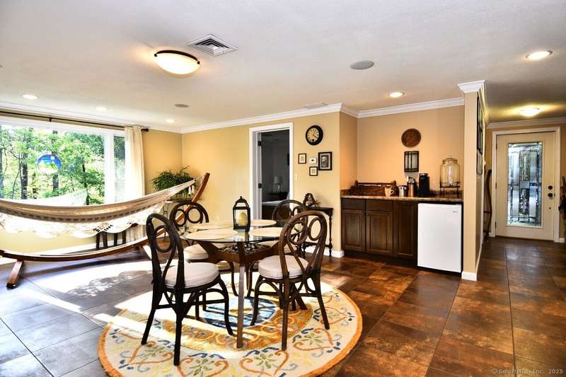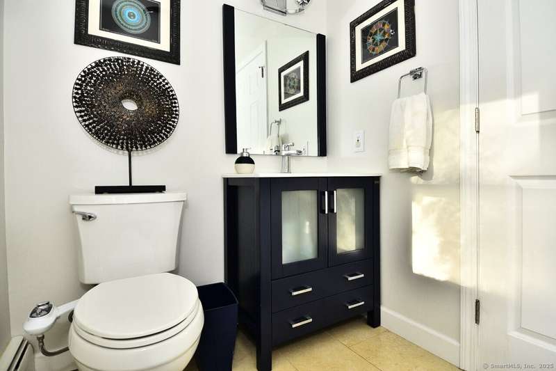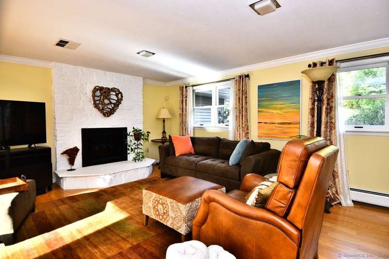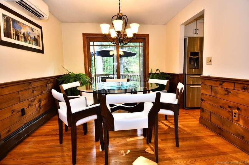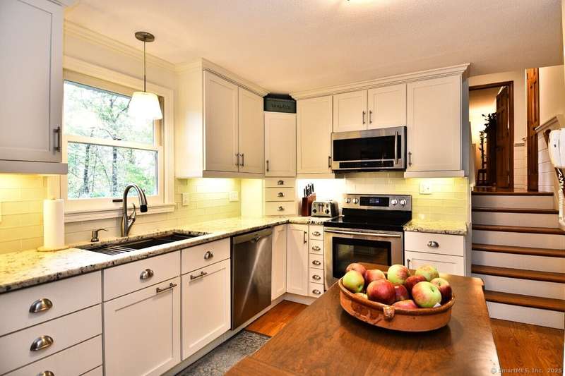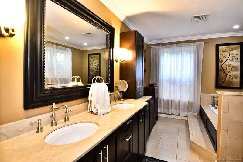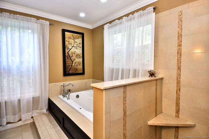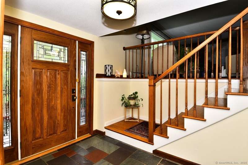 Your sanctuary awaits! This Arts & Crafts inspired 10-room 3.5 bath home features Primary Bedroom suite with office/nursery and luxurious full bath including BainUltra Canada Light Therapy soaking tub, dual sinks with Danze faucets, Toto toilet, and marble separate shower stall, large walk-in closet with built-ins and balcony overlooking a tranquil half-acre. A spacious ground level foyer with slate floor and ample closet provides access to traditional living areas on the left and to the right, stairless entry to the family room with fireplace, sliders to deck, hardwood floors, adjacent half-bath with laundry area, sunroom with Spanish Terra Rustic tile, coffee bar and sliders to deck, adjoining guest bedroom/office, 3/4 bath, private entry foyer with mudroom and direct access to the oversized 2-car garage. Up half-flight of stairs from the entry foyer, a traditional area with hardwood floors throughout offers living room with picture window, horizontal shiplap and stone accent wall op