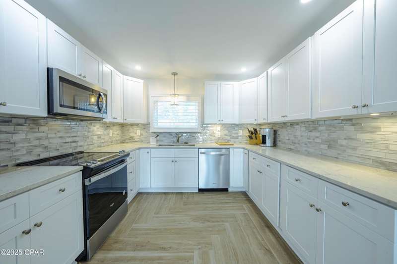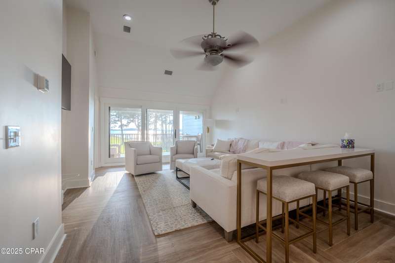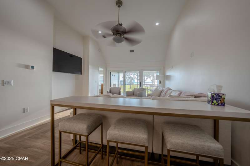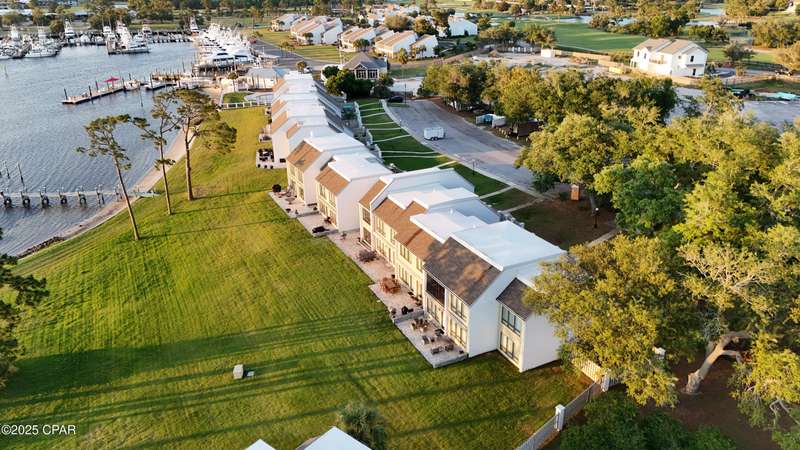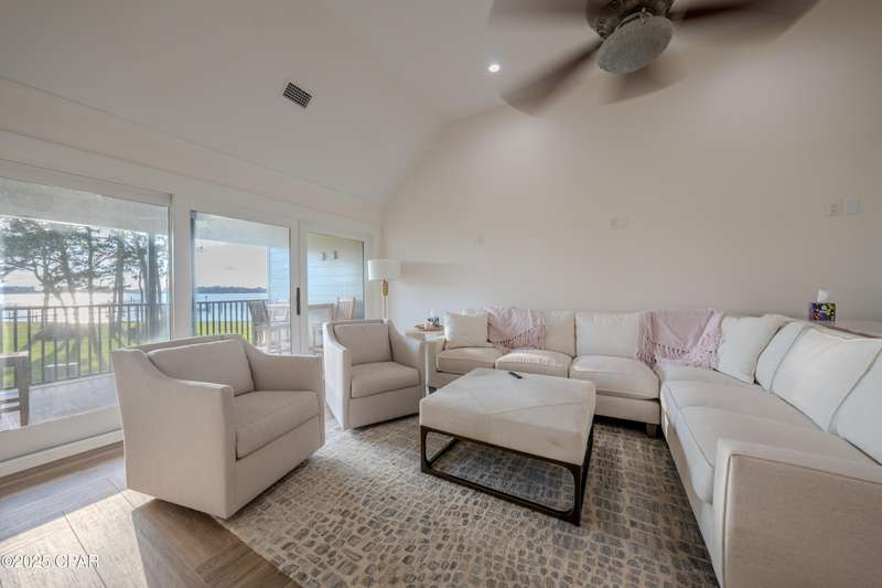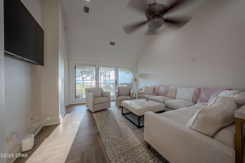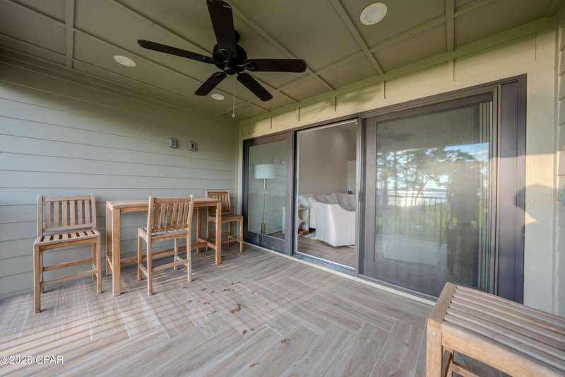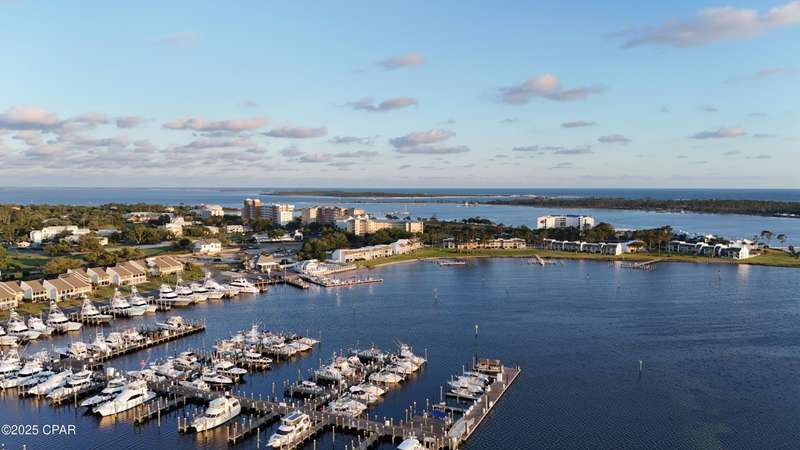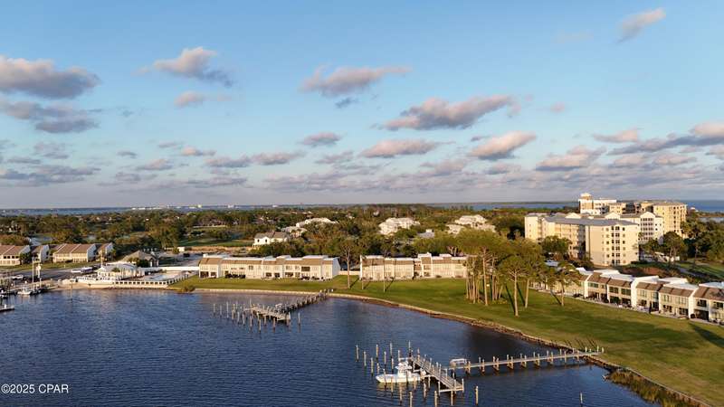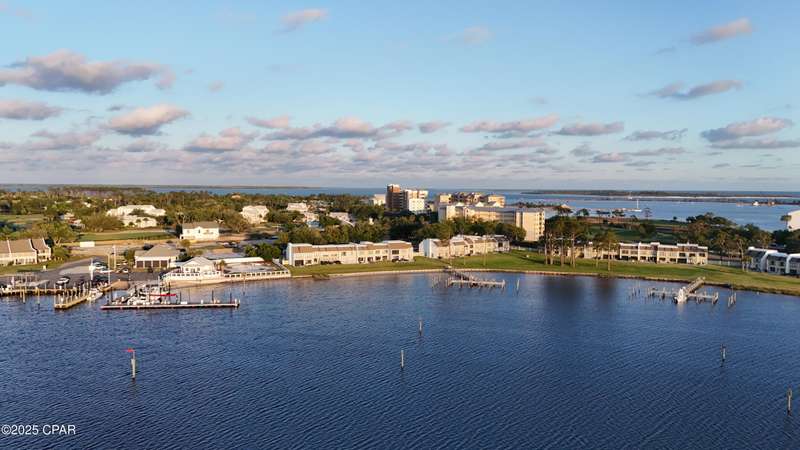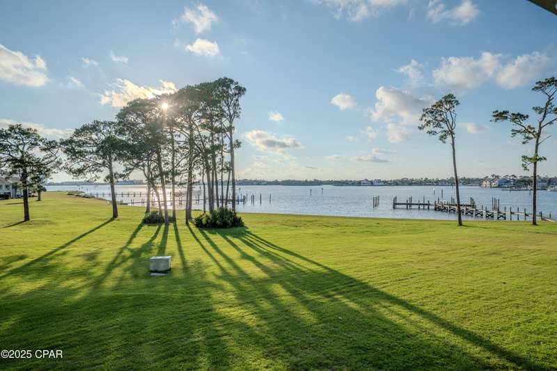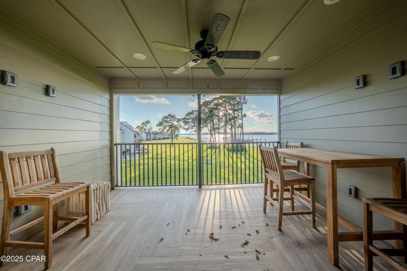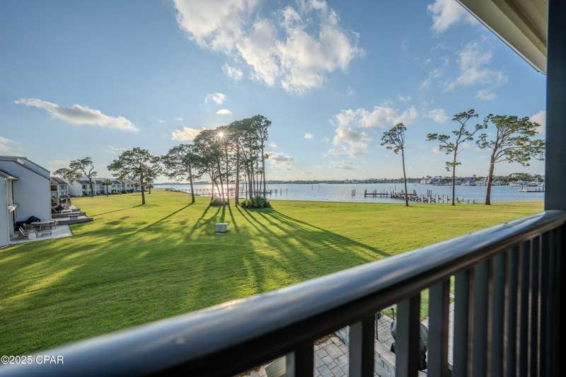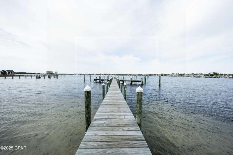 Bay Point Turtlegrass WATERFRONT condo for sale. Features Three boat docks for the use of Turtlegrass. Just renovated Bay Point Turtlegrass 3bedroom / 3 Full Bath. The plank tile floors have been laid in a herringbone pattern throughout the condo. All the sheetrock is new as well as craftsman style trim. All the bathrooms have been updated, two feature seamless glass walk in tiled showers, the third is a walk in tub. Monte Carlo fan and flush mounted led lights illuminate the space. The kitchen has white cabinets, quartz countertops, a complete Whirlpool set of appliances, and accented by custom backsplash. The porch overlooks Grand Lagoon and is next to new Bay Point Marina. There is an additional fenced patio as well as a heated a cooled space that could be used as a studio, bunk room, or storage space. Bay Point is gated golf course community with 24 hour roving security.