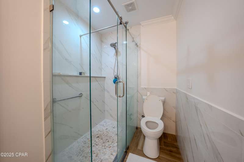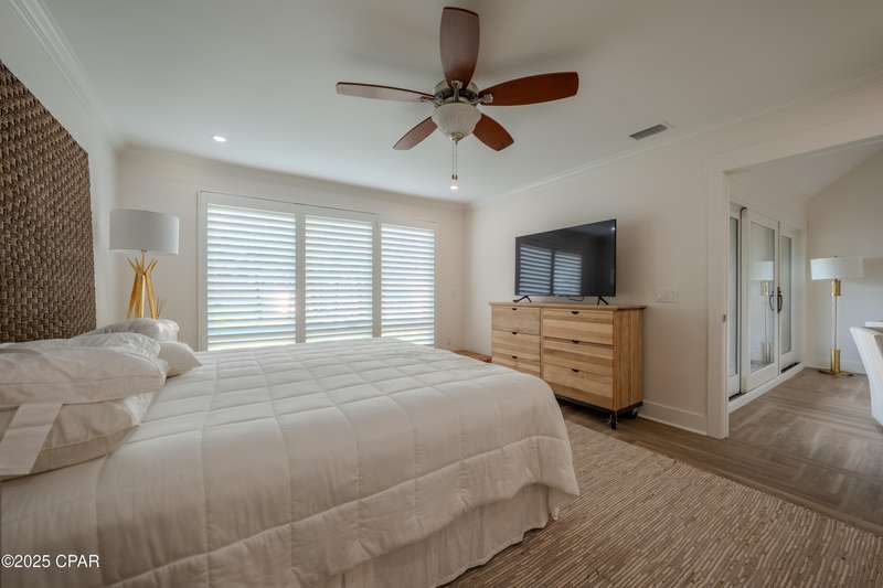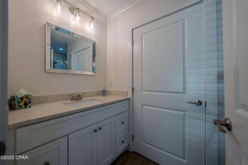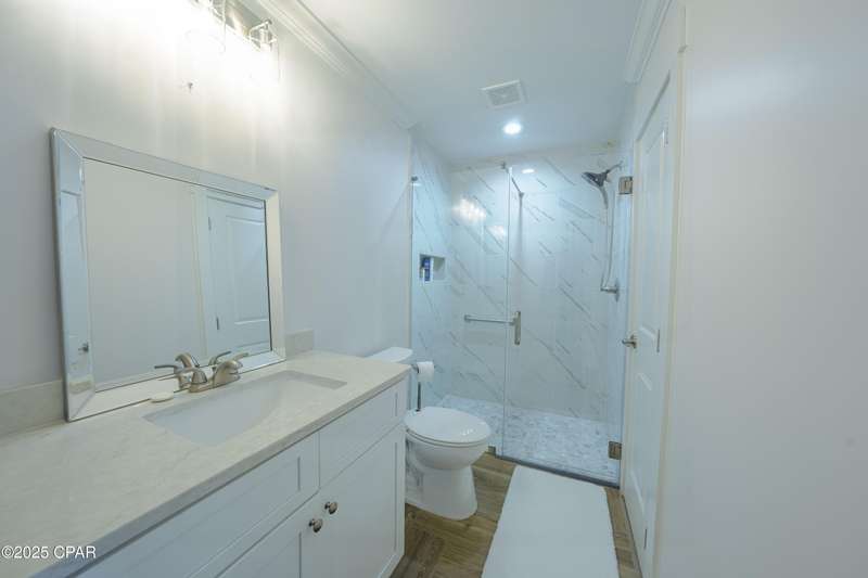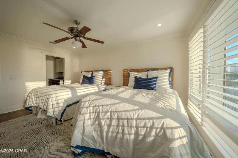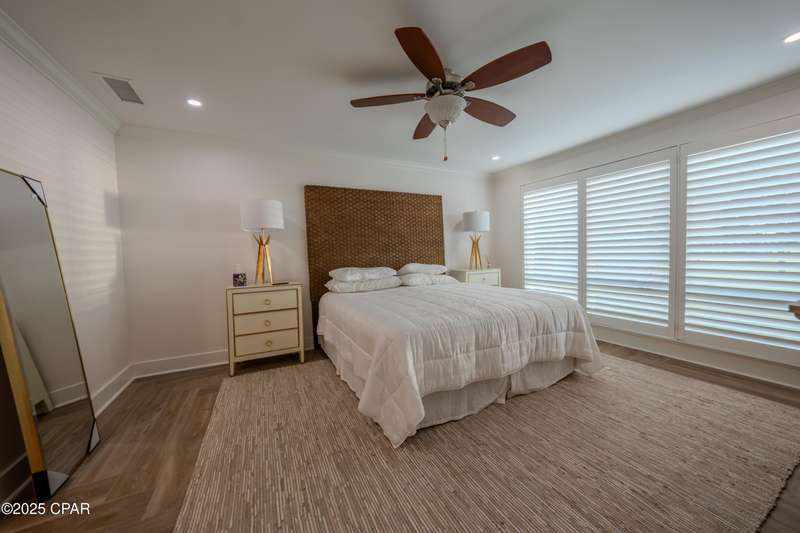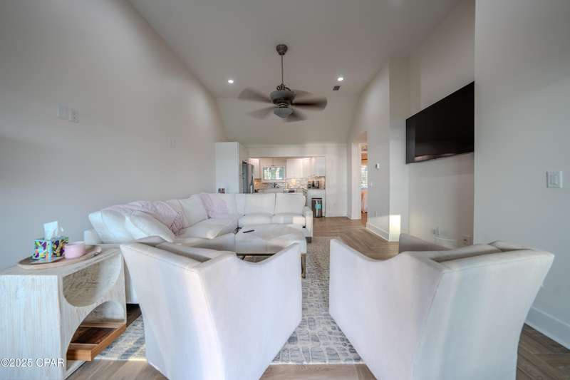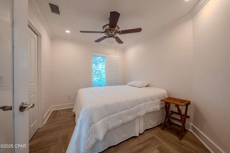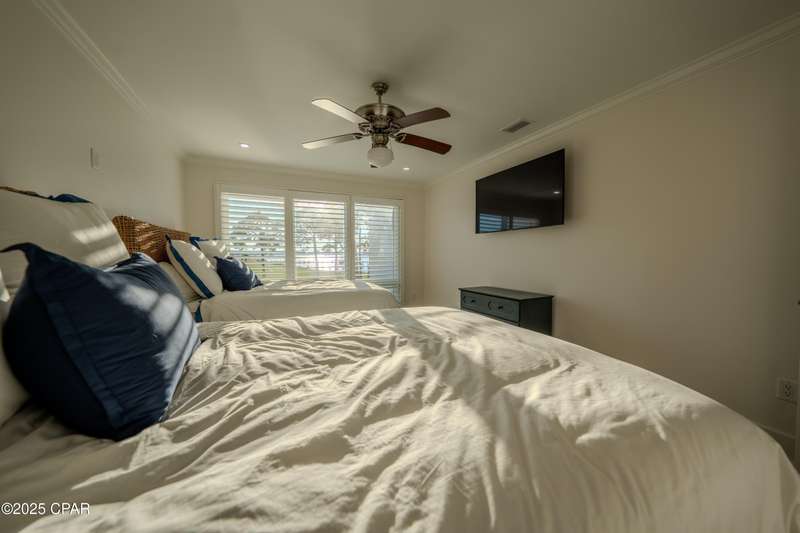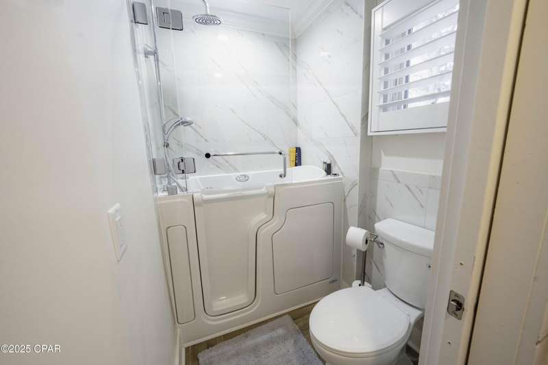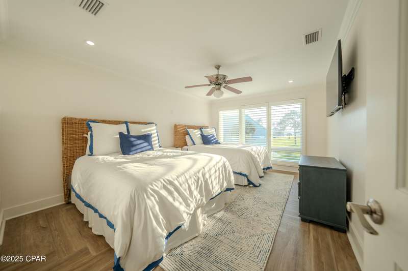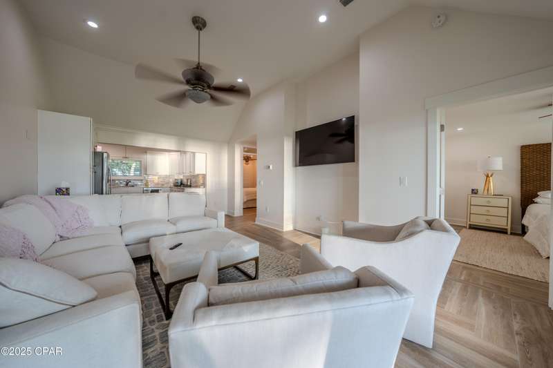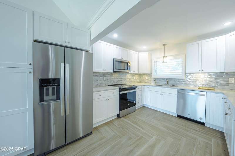 Bay Point Turtlegrass WATERFRONT condo for sale. Features Three boat docks for the use of Turtlegrass. Just renovated Bay Point Turtlegrass 3bedroom / 3 Full Bath. The plank tile floors have been laid in a herringbone pattern throughout the condo. All the sheetrock is new as well as craftsman style trim. All the bathrooms have been updated, two feature seamless glass walk in tiled showers, the third is a walk in tub. Monte Carlo fan and flush mounted led lights illuminate the space. The kitchen has white cabinets, quartz countertops, a complete Whirlpool set of appliances, and accented by custom backsplash. The porch overlooks Grand Lagoon and is next to new Bay Point Marina. There is an additional fenced patio as well as a heated a cooled space that could be used as a studio, bunk room, or storage space. Bay Point is gated golf course community with 24 hour roving security.