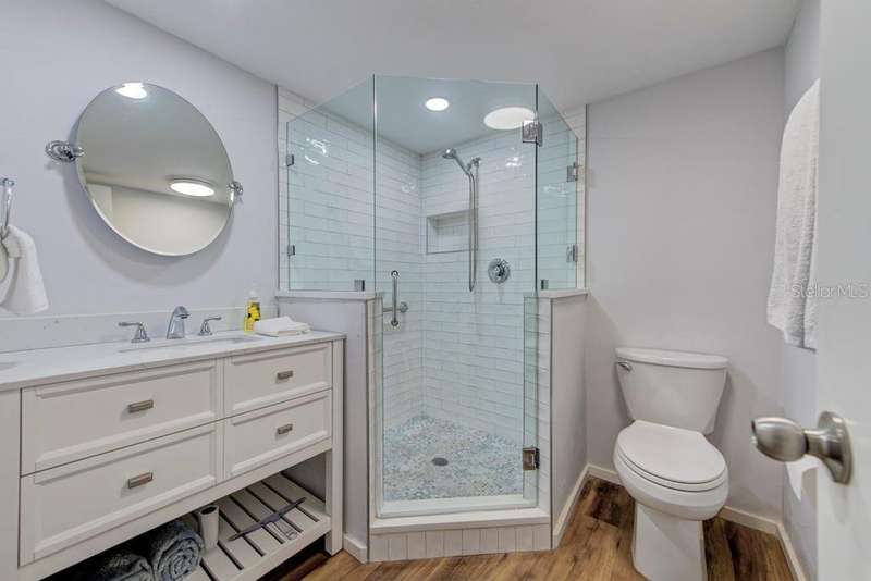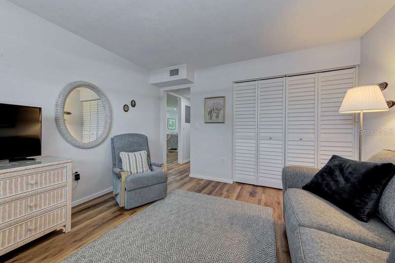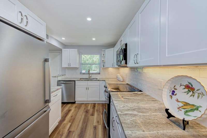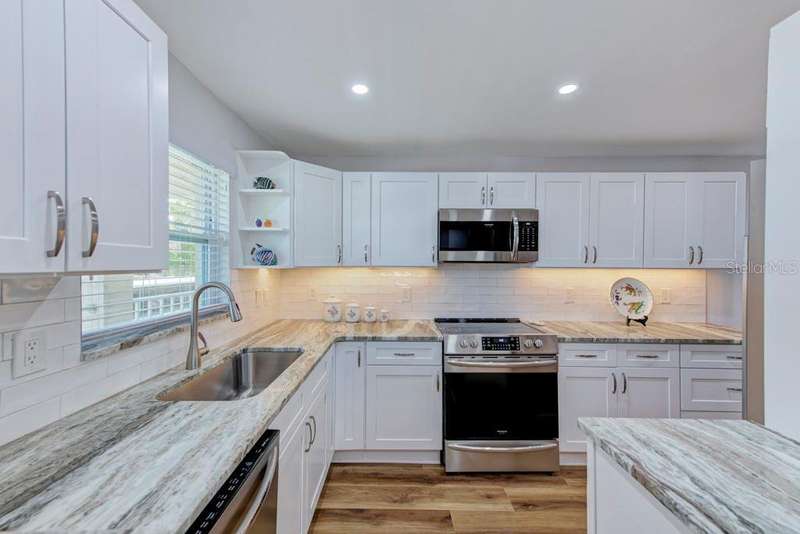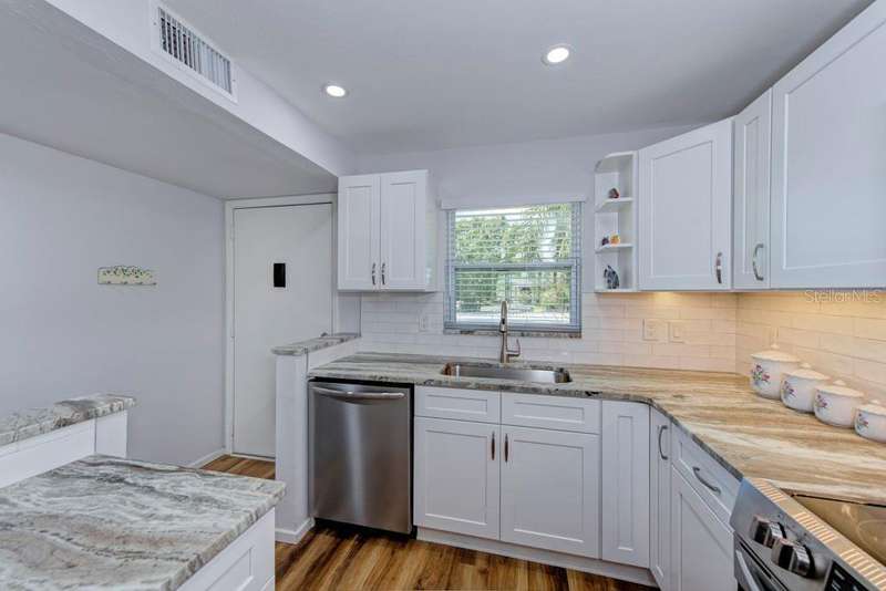 Under $200,000 in Sarasota!! Newly renovated 2/2 second floor condo facing the pool and greenbelt for wonderful privacy and views. Almost 1,000 square feet with new luxury vinyl flooring throughout. Quartz countertops in both baths and kitchen, new subway tile backsplash and in showers. Inerior impact windows, recessed lighting with new electrical panel, all new stainless steel appliances including Bosch stackable washer and dryer. Enjoy a tiled and glassed in peaceful lanai. Save money, there is no need to own a car. Location is walkable to public transportation, restaurant, Publix, shopping, Starbucks and more. And, it is minutes to a golf course and the beautiful beaches. All buildings have elevators, and this 55 plus friendly community boasts a beautiful swimming pool, gas grills and clubhouse. HOA fees include grounds maintenance, private road and cable t.v., sewer, trash and water. AC 2016 and Water Heater 2017.