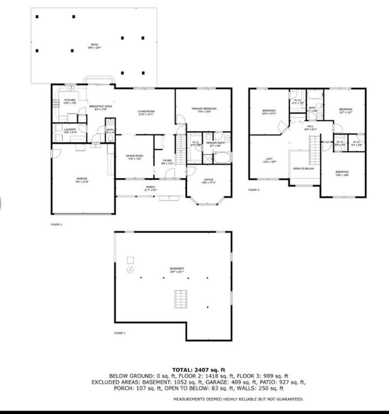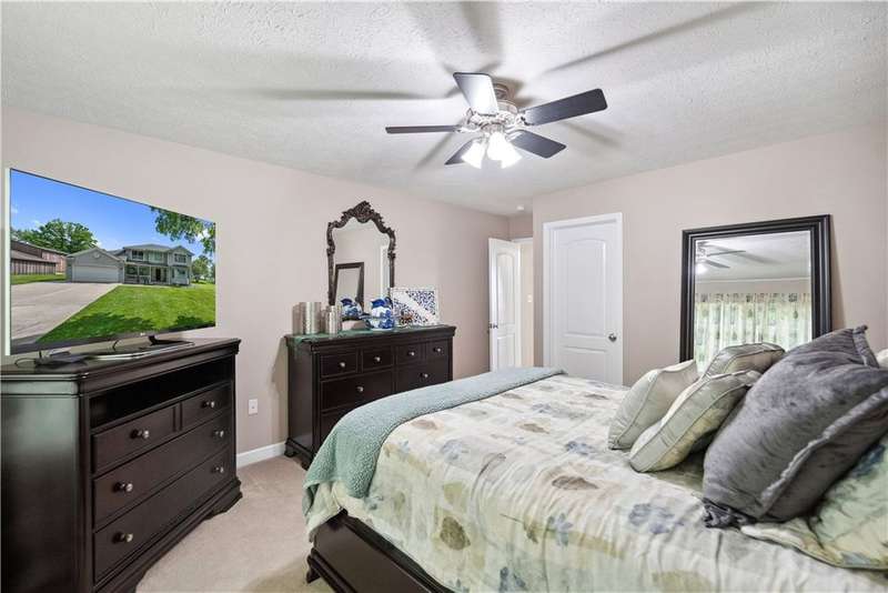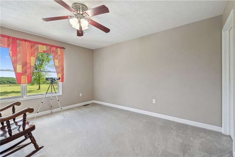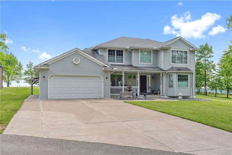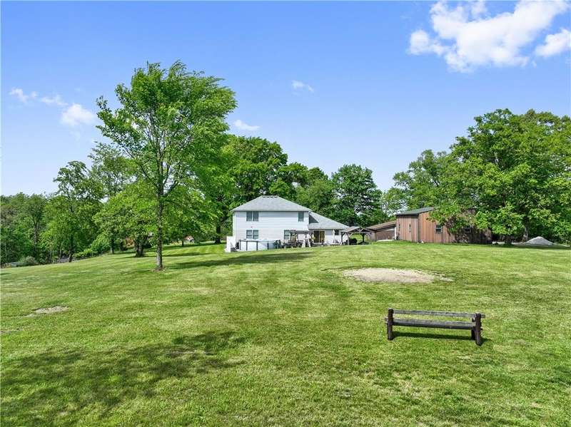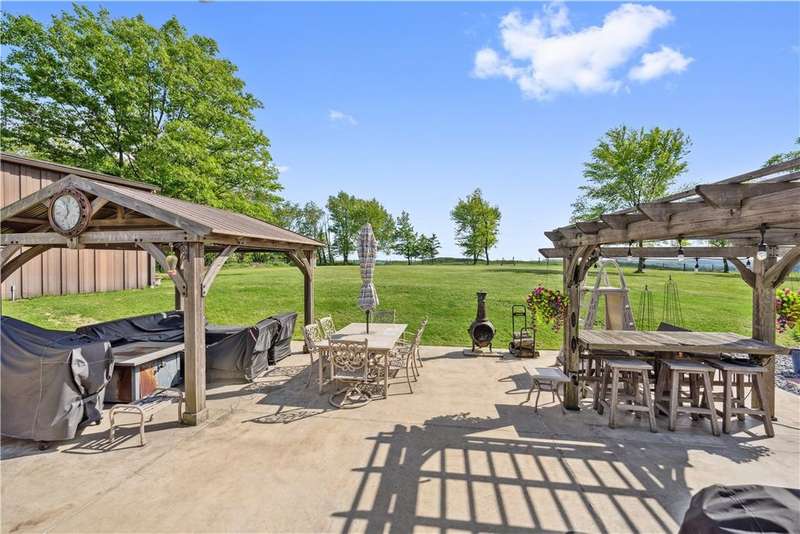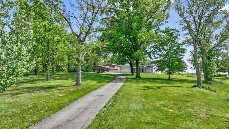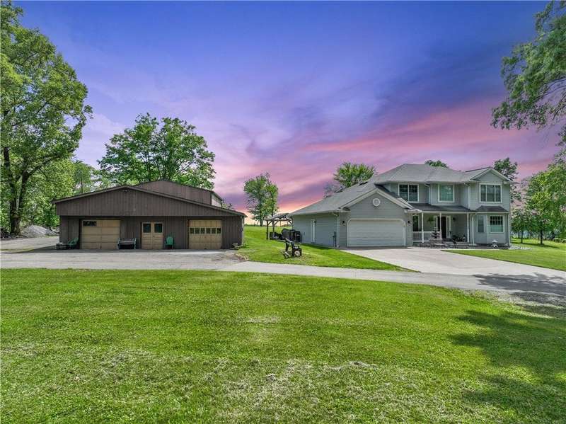 Situated on 3.2 private acres. This property offers incredible views with superb sunsets surrounded by mature professionally maintained trees. The first floor is home to the ensuite primary, home office and open layout of kitchen and living room with direct access from the breakfast nook to the large patio for alfresco dining. The second floor features 3 more bedrooms and a loft family room area. With a 2 car integral garage, second detached 32'x40', and 3rd detached 30' x40' with 12' door and 9' loft , this is truly the car enthusiast dream with endless storage.