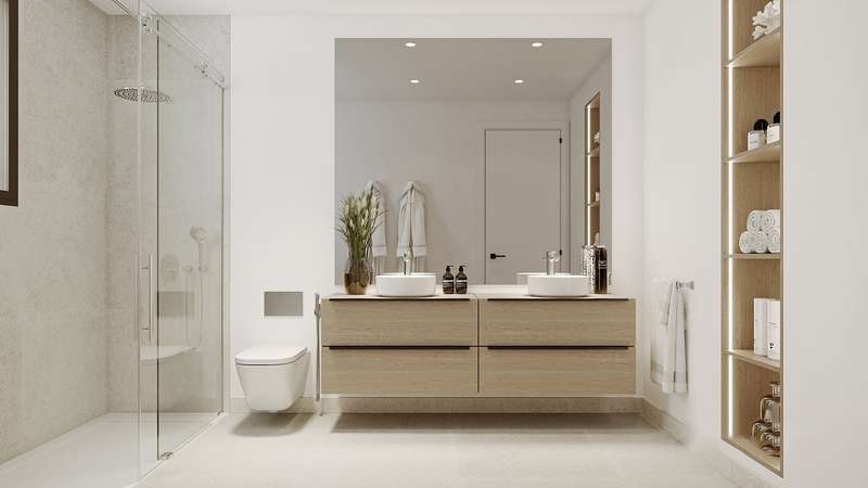 These Estepona apartments boast generous and bright interiors with premium quality finishes. In each unit open plan kitchens are connected to spacious living areas, large windows flood the interiors with natural light, inviting you to enjoy the indoor-outdoor living and captivating views to the picturesque surroundings. The apartments will be delivered with fully fitted and equipped kitchens with branded appliances and white goods, cold and hot a/c throughout, and underfloor heating.