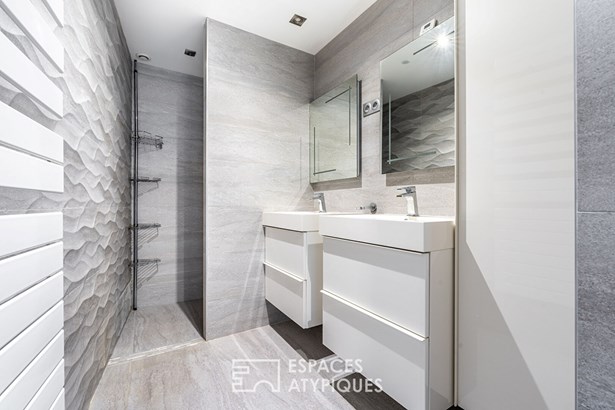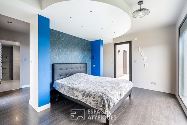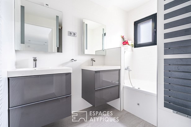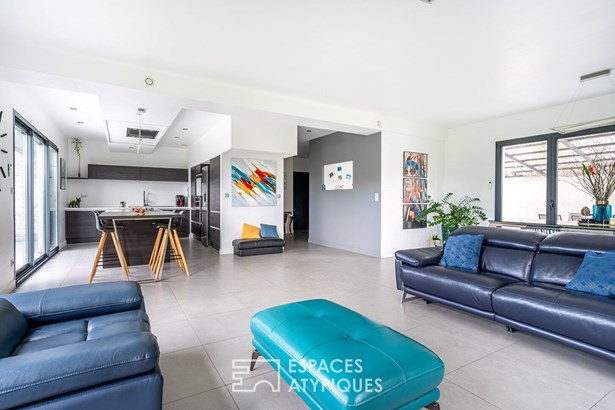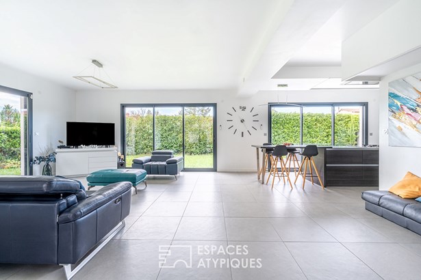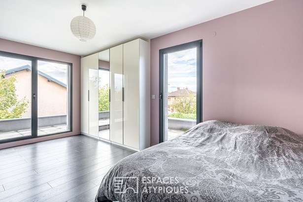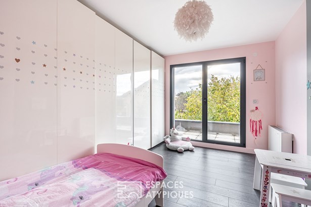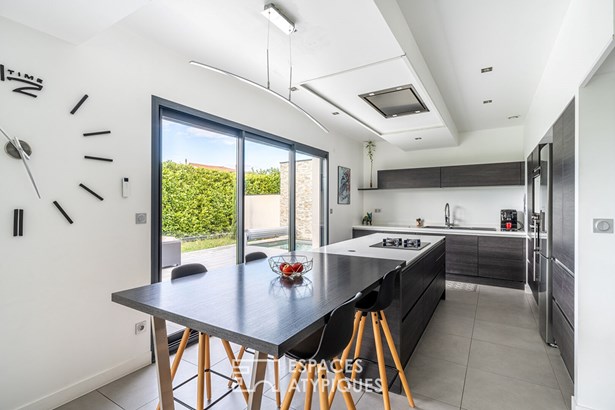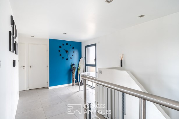 A bathroom, an office space and toilets complete this floor, which also has a continuous balcony. In terms of comfort and finishes, this house stands out with its noble materials and careful services: large 3m30 aluminum bay windows, underfloor heating by air/water heat pump, cooling floor and reversible air conditioning upstairs, as well as Porcelanosa tiled floor coverings. A 20 sqm outbuilding with independent access offers additional space to be fitted out according to your wishes. A garage and two parking spaces complete this property combining modernity, comfort and ideal location.