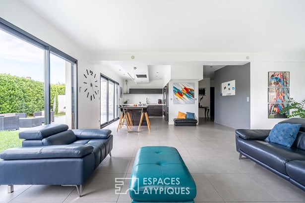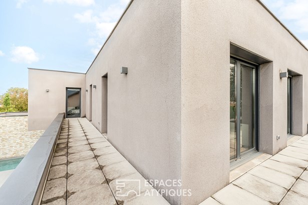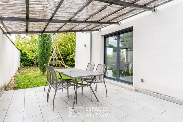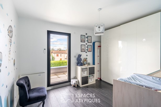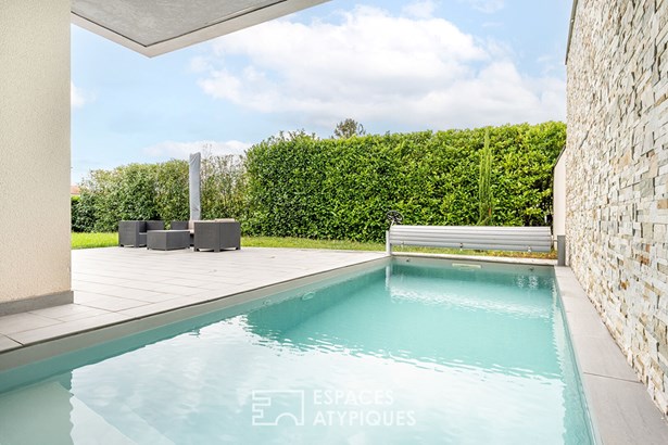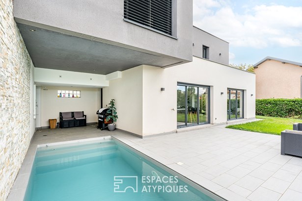 Located in Quincieux, just 30 minutes from Lyon and in the immediate vicinity of the village center and schools, this contemporary house of 162 sqm (excluding outbuildings) is built on an enclosed and landscaped plot of 720 sqm with a heated and secure swimming pool and its outdoor shower.