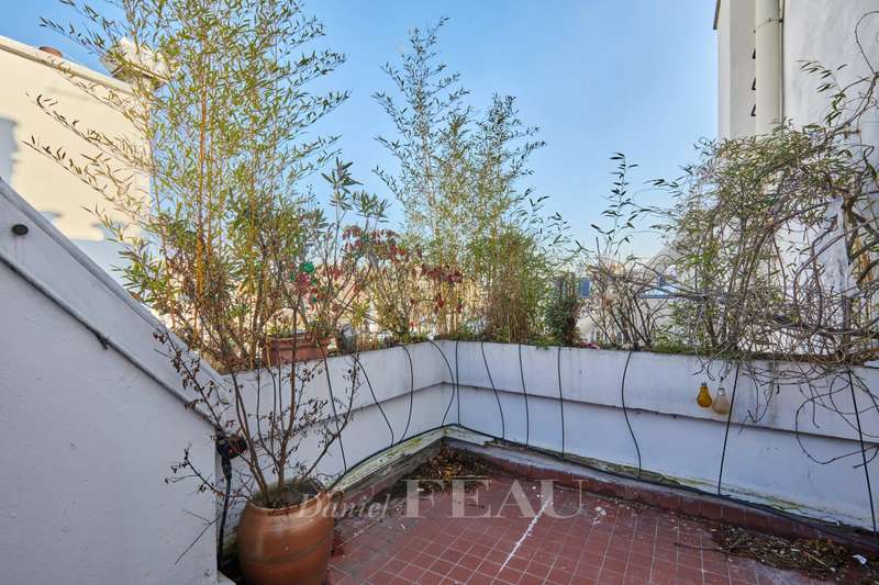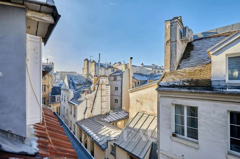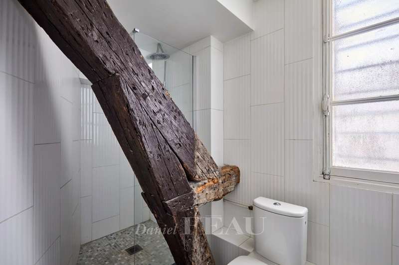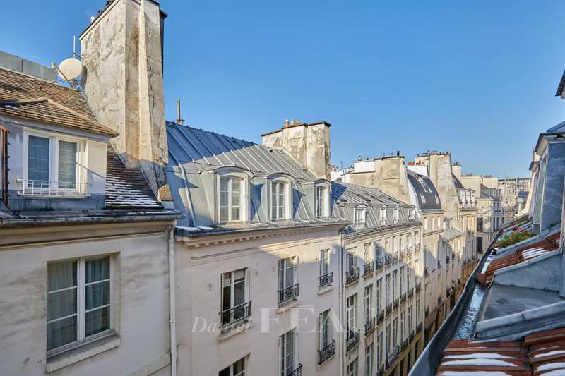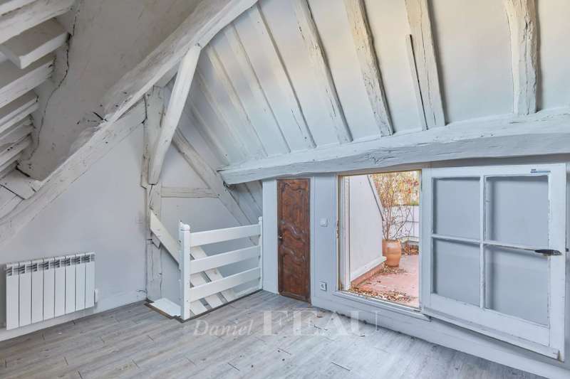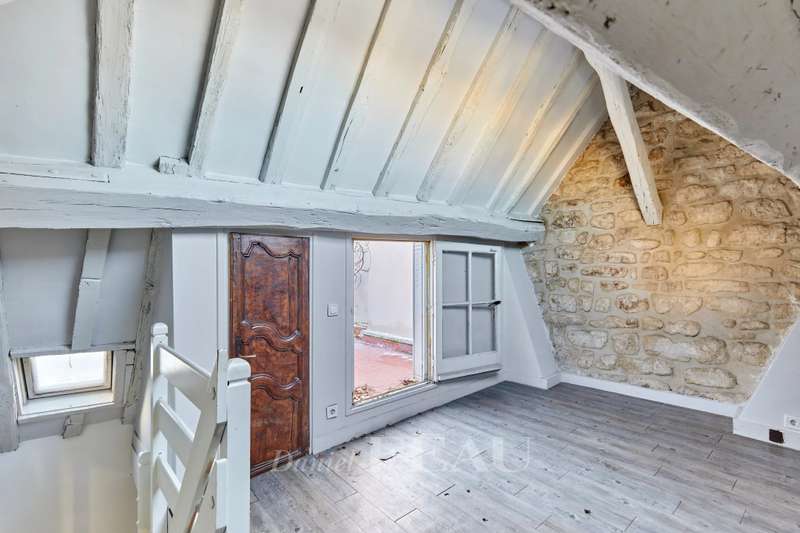 Rue des Grands Augustins. This dual-aspect apartment on the 4th and top floor of a fine 18th century building with a lift offers 65 sqm of floor space and 46.12 sqm of living space as defined by the Carrez Law. It comprises a living room featuring exposed beams, a fireplace and terracotta floor-tiles, a kitchen, and a shower room with a wc. Upstairs a bedroom with a wc accesses a 7 sqm terrace. Renovation is required to exploit the full potential.