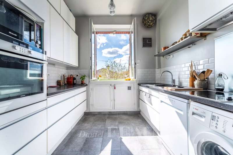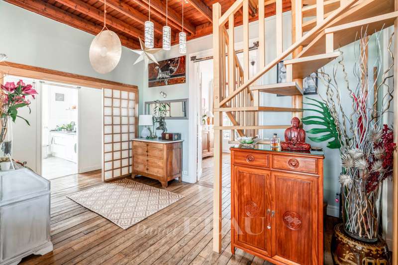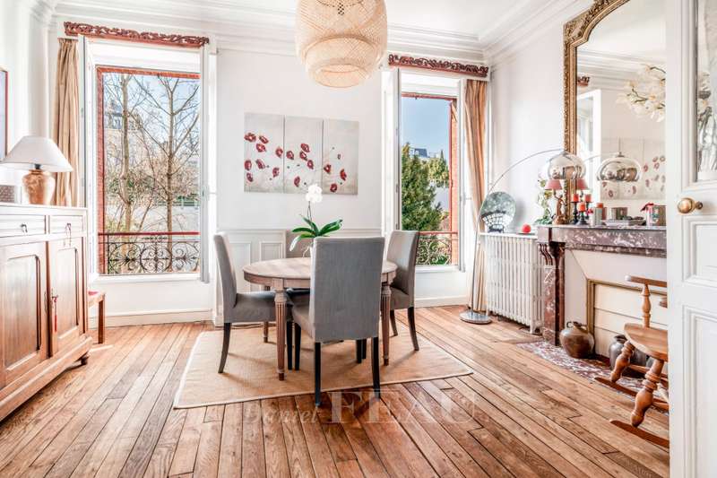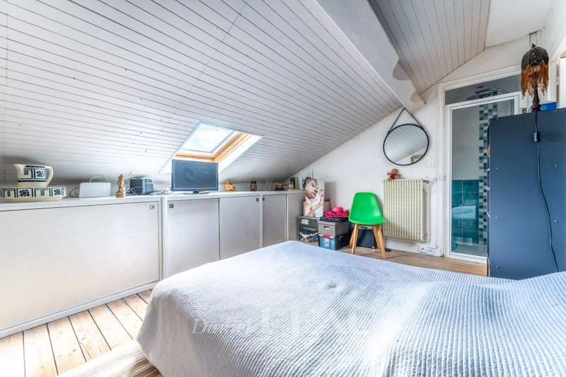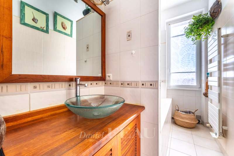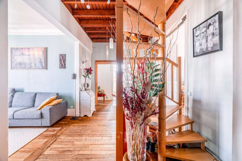 This south, east and west-facing duplex apartment offering 120 sqm of floor space and 111 sqm of living space as defined by the Carrez Law is on the top floor of a peaceful little early 20th century building located in the heart of Saint-Cloud’s “Village” neighbourhood. It includes a spacious living/reception room with a fireplace commanding a superb open view of the Eiffel Tower and the capital, a dining room, an equipped kitchen, two spacious bedrooms, a bathroom and a separate wc. A central staircase accesses a landing/study area and a spacious attic bedroom with a shower room. With a cellar. Residents benefit from access to the co-ownership’s lovely garden. In a convenient location near the schools, the park, the shops and the station a short distance west of the capital.