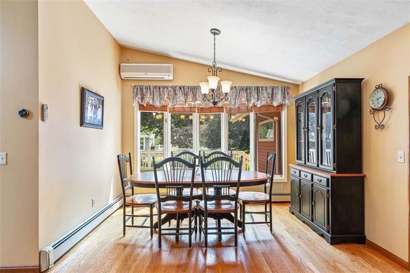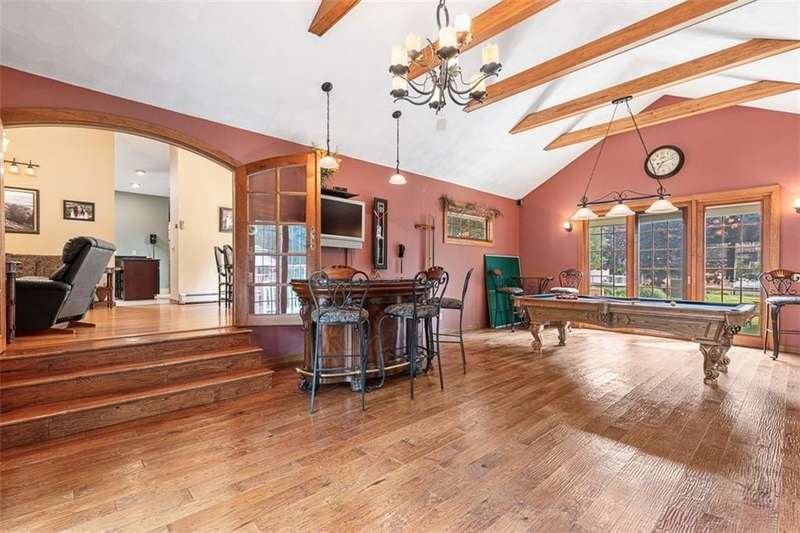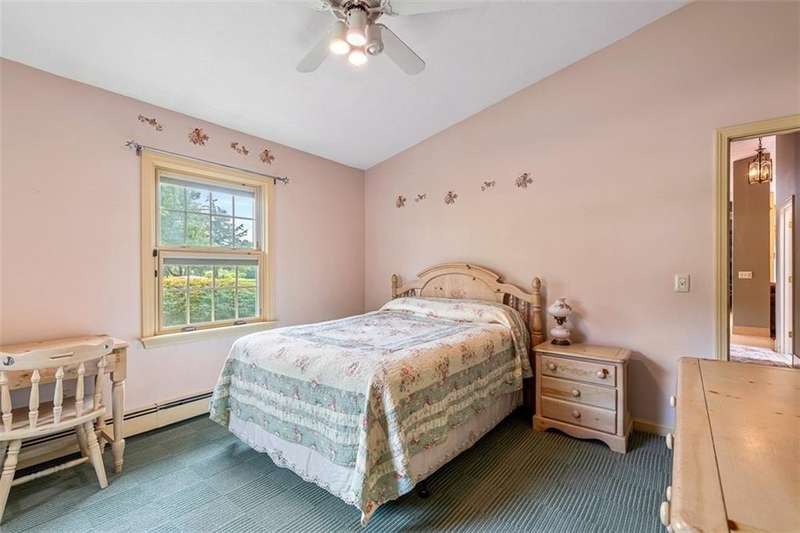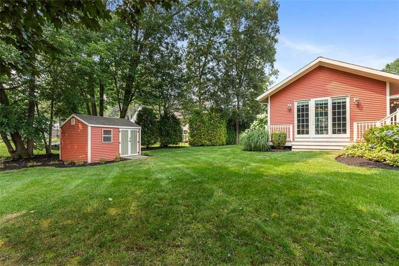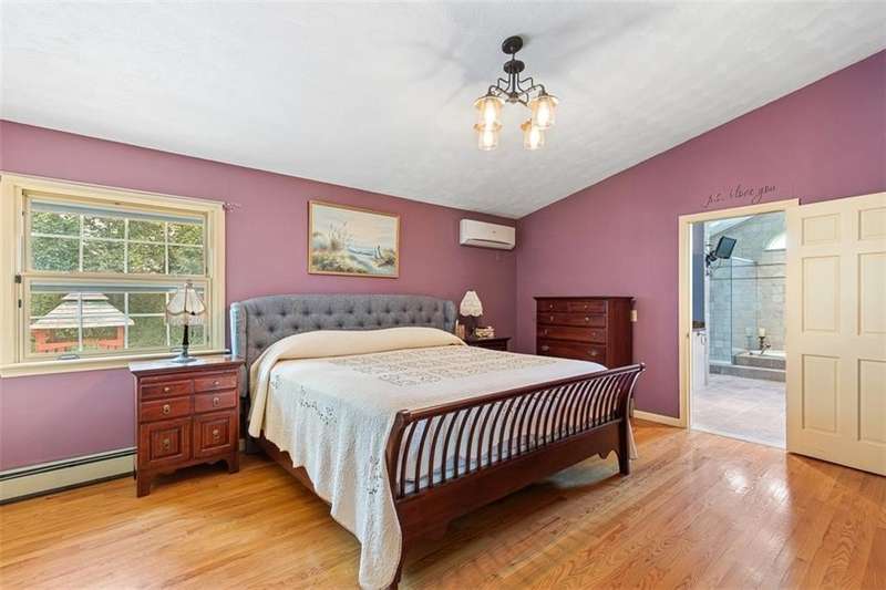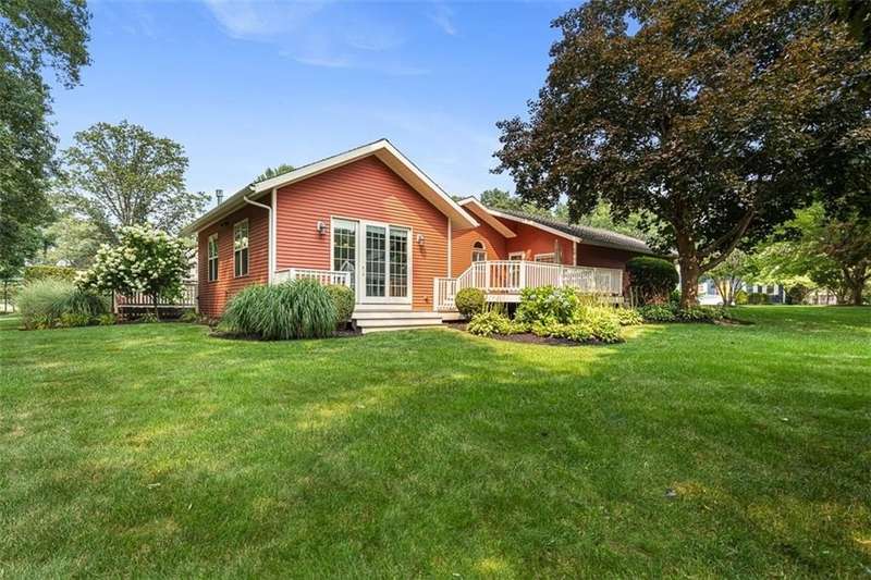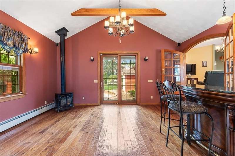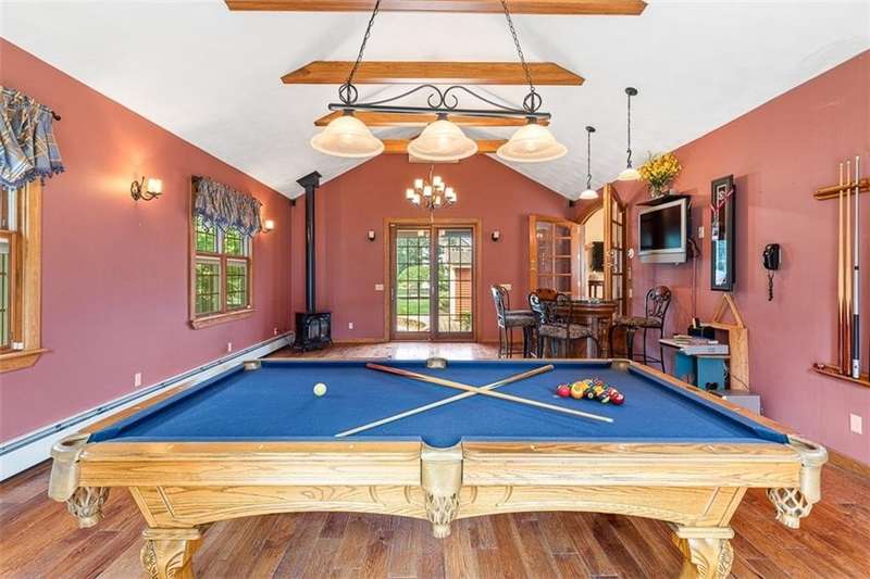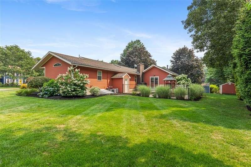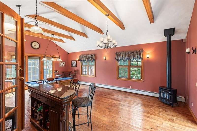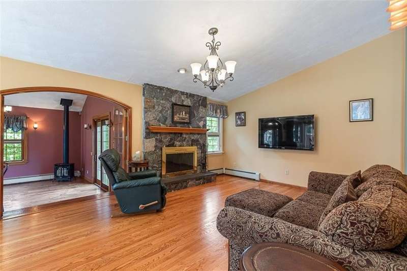 This 3-bed, 3-full-bath Ranch offers updates & enhancements that make it a stylish, efficient slice of modern country living. A floor-to-ceiling wood-burning fireplace in the living/dining space adds instant charm. The all-chestnut game room features hand-scraped Amish chestnut flooring & is bookended by large glass doors letting guests step out to 2 decks & the grounds. Pool table, dry bar, & stools all included. The skylighted eat-in kitchen includes hardwood cabinetry, stone counters, & stainless appliances with a pantry & laundry room just steps away. The owner’s suite delights with a walk-in closet, 2 additional closets, & luxurious private bath with separate vanities, a jetted tub, glass shower, radiant heat, & towel warmer. An additional 2 bedrooms nearby, while the lower level has 2 bonus rooms with California closet systems, finished living space with sauna, & a full bath with backup house water filter. The spacious backyard offers an expansive deck for outdoor living, a half basketball court, sand play area, & a bonus shed. Find an artesian well, town sewer, sprinkler system, low-voltage landscape lighting, invisible pet fencing, 5-zone heating, heated garage, 7 mini split A/C units, propane tank for a stovetop & gas stove. Surrounding areas include the Barden Family Orchard, Knights Farm, & Wright's Dairy Farm. Travel Route 44 for stores & dining along with the Apple Valley Mall & Smithfield Crossing. Hop down Route 146 to reach Providence nightlife in 20 minutes.