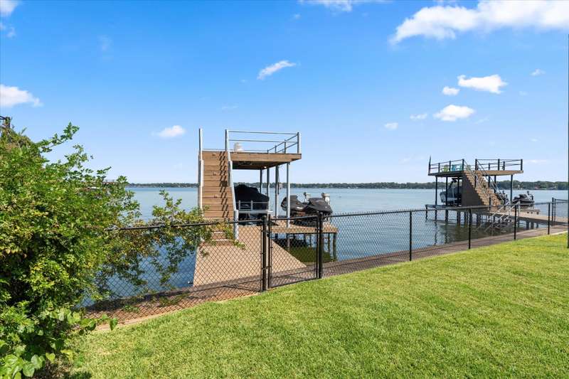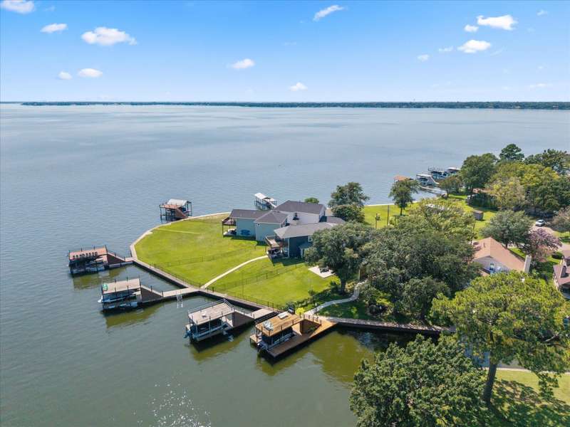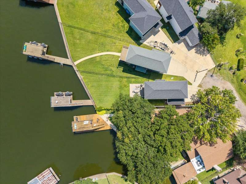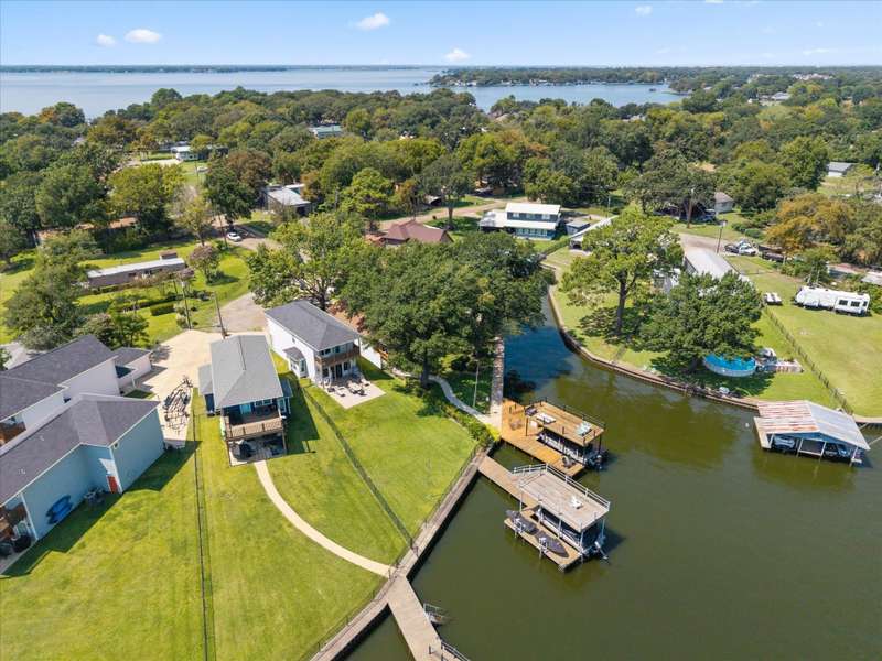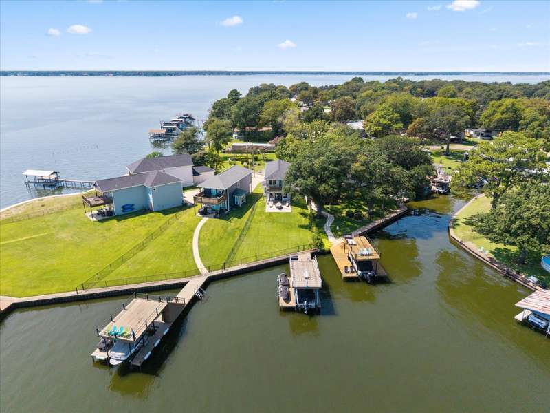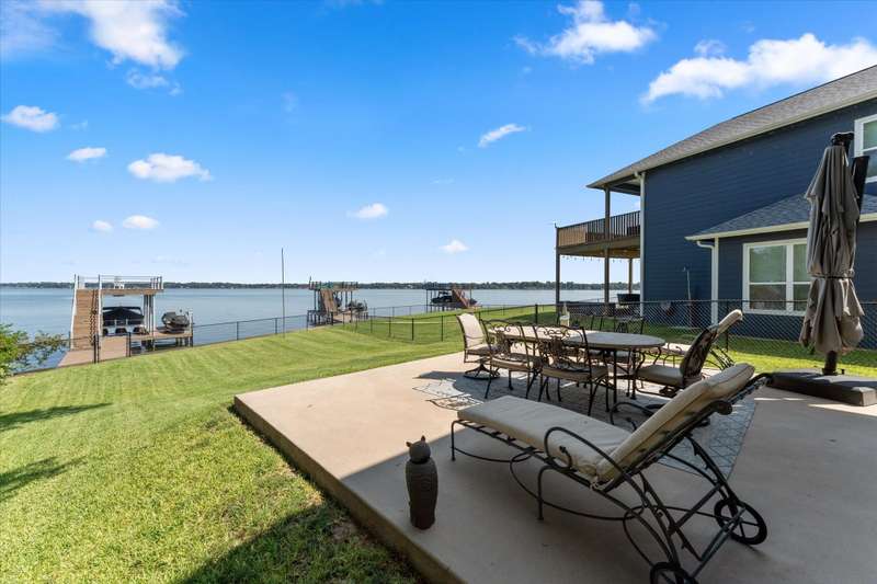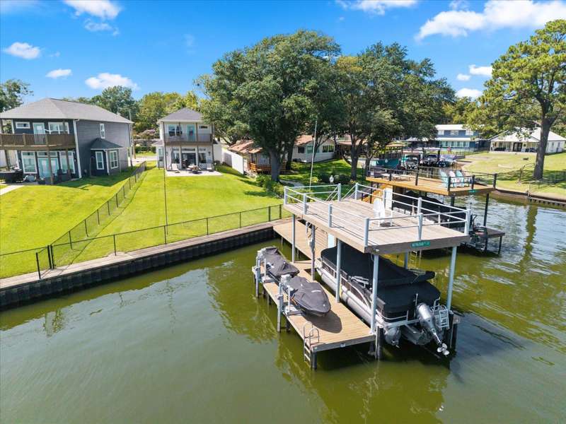 Welcome to 162 Palisade Drive in Mabank, a beautifully maintained 2020 build offering 3 bedrooms, 3 bathrooms, and 1,867 square feet of living space. Situated on open water, this home captures the best of lakefront living with 10-foot ceilings, expansive views from living and primary suite, and an open-concept layout that continues to bring those views direct to you.Make yourself at home. Being sold fully furnished, this is truly a move-in ready turn key opportunity. Thoughtfully designed with comfort, convenience, and style in mind, all focused on lakeside living, this property blends modern living with the ultimate waterfront lifestyle.The main level features a spacious living area that flows to a large outdoor space, perfect for entertaining or relaxing. Upstairs, the primary suite includes a private balcony, creating an ideal retreat for enjoying both morning sunrises and evening sunsets.The property includes a well-appointed boathouse with a lift for a tri-toon boat, two jet ski lifts, a storage closet, and an irrigation system sourced directly from the lake.