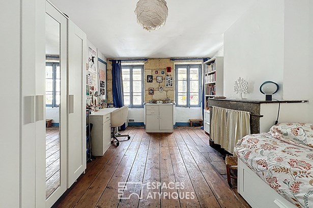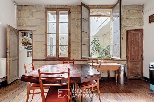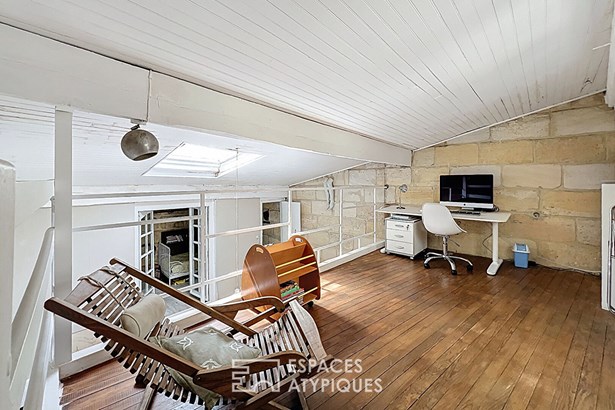 The 92 sqm ground floor can be used for parking, a workshop, or as a liberal profession or commercial space. The 168 sqm house is divided as follows: the first floor is accessed via a beautiful stone staircase and the living room is bathed in light overlooking the street. Beautiful original parquet flooring, a fireplace, and a nice height give this typical house a certain charm. Next, the kitchen opens onto the covered interior patio. This is followed by a large library lounge with a mezzanine at the back.