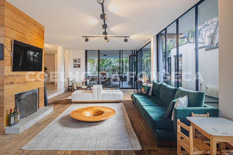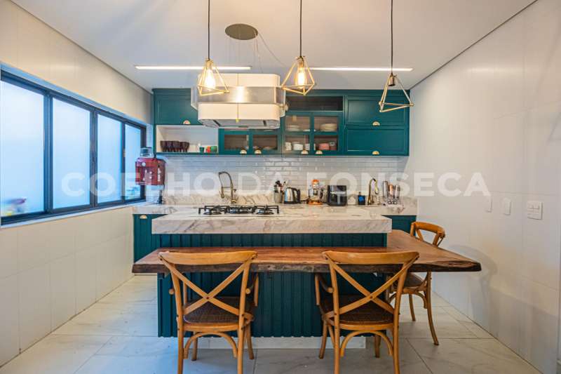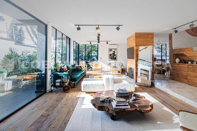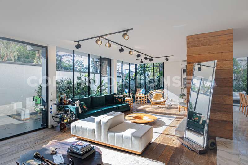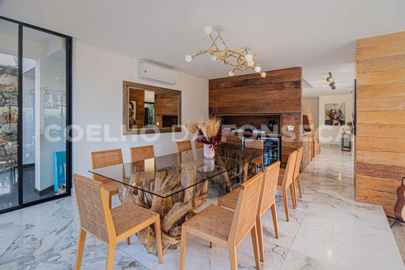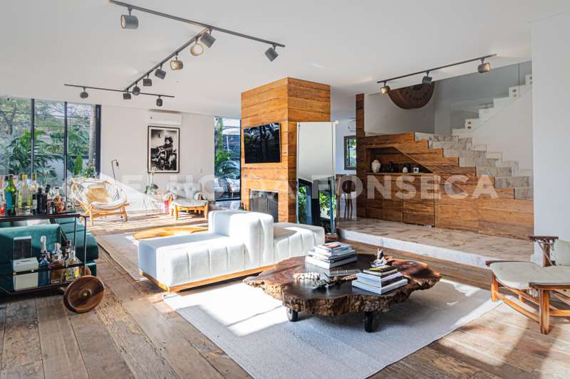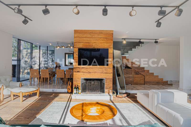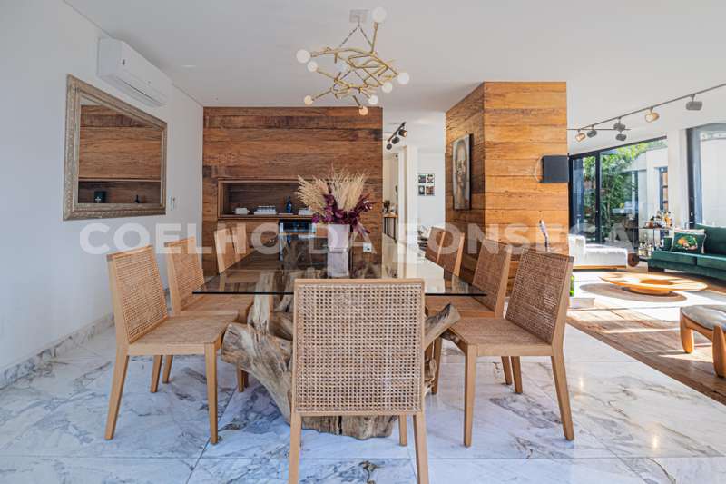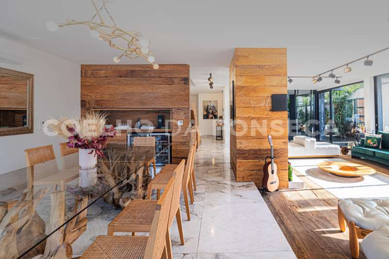 No pavimento térreo, possui salas de estar e de jantar, com esquadrias em vidro do piso ao teto, que se abrem para a área externa, garantindo muita luminosidade natural. Ampla cozinha com ilha.