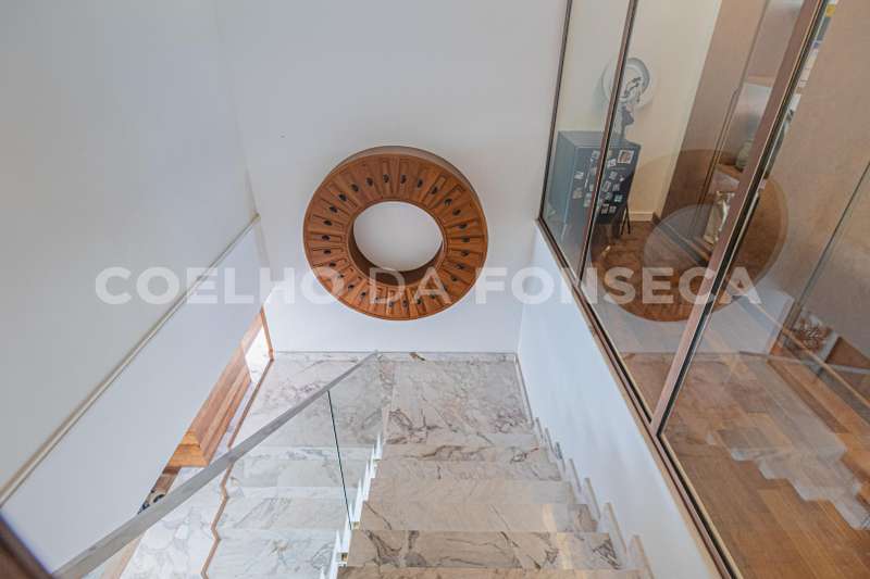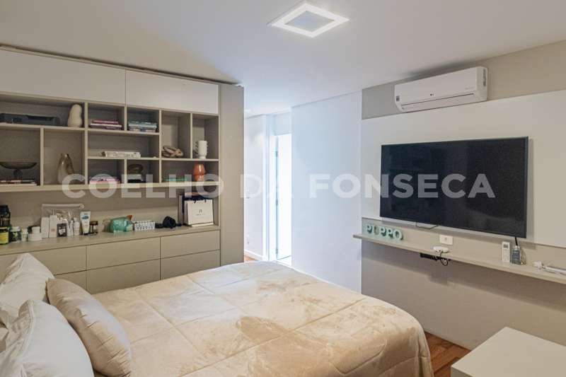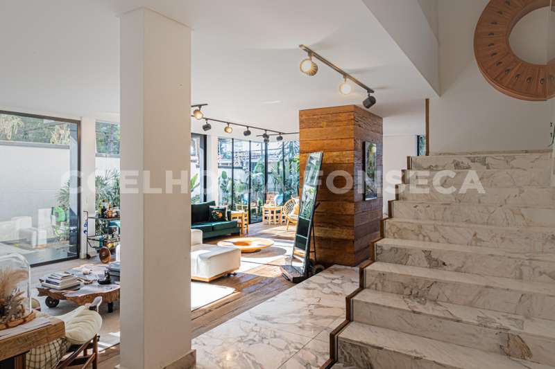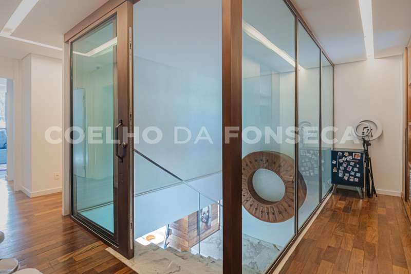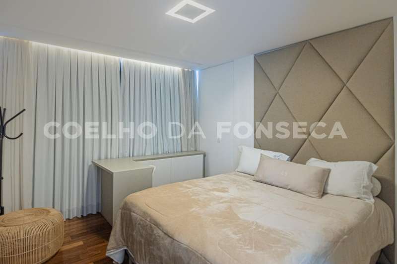 No pavimento superior são 5 suítes, sendo a master com closet Sr. e Sra. e uma sala de banho com banheira. Escritório privativo. Vista dos quartos para a copa das árvores e paisagismo da casa.