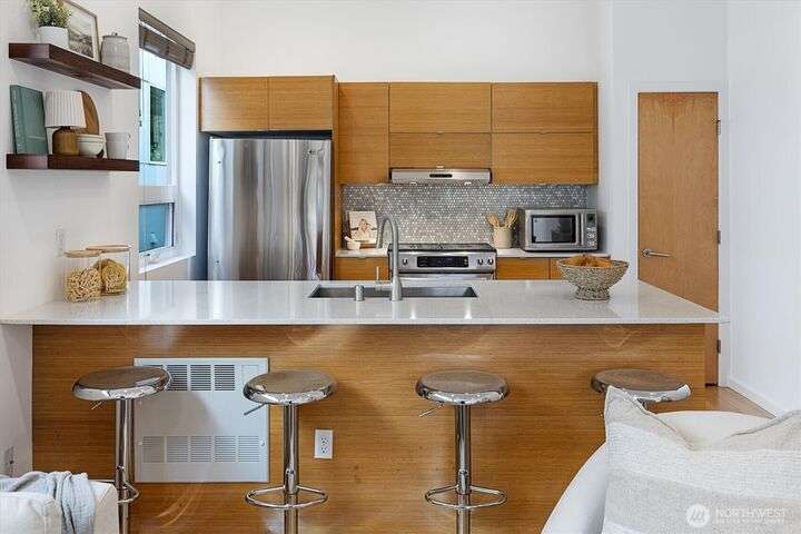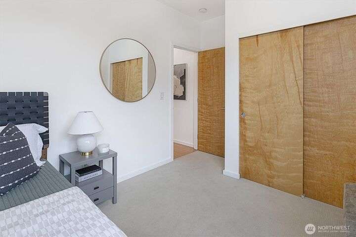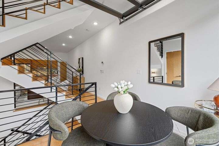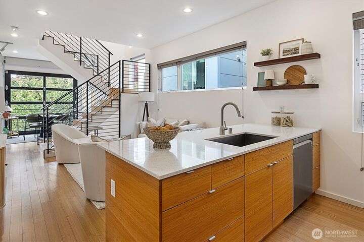 Discover modern living in this 2 bedroom + office nook, 2.25 bath townhome in Cap Hill, where style meets comfort in a vibrant setting. Open floor plan connects living & dining spaces, highlighted by a dramatic roll-up wall that welcomes the outdoors in. Modern kitchen features quartz counters, SS appliances, and generous island with breakfast bar. Expansive windows fill the interiors with natural light. Modern, chic architectural details throughout. Primary suite offers a cozy retreat with en-suite bath and generous closets. Second bedroom and bathroom, and laundry all on the same floor. Versatile lower-level flex space adapts to your lifestyle, while attached garage adds convenience. Easy access to DT Seattle, shops, dining, and freeways.