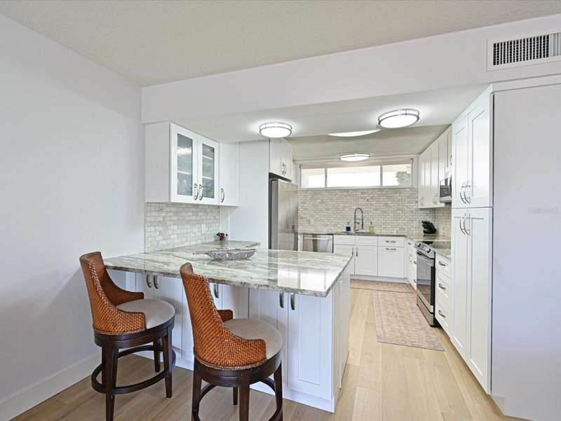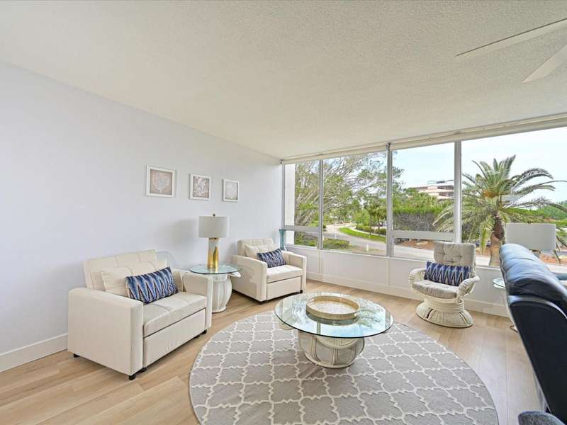PRICING UPDATE! Longboat Key's best kept secret. Sands Point Condominium is everything you could ask for! Lowest priced 2 bedroom condominium in this community blending gorgeous mid-century architecture with stunning location along the Gulf of Mexico. Situated next to the Longboat Key Club complex, Sands Points offers everything you need to relax and unwind under the Florida sun and all the amenities you could think of. This community offers direct access to the beautiful white sand beaches of Longboat Key, endless views of the Gulf of Mexico sunsets, New Pass and its own private marina. This second floor unit is accessed by either elevator or nearby stairs. Wall to wall windows offer expansive views from both the living/dining area and primary bedroom suite. This two bedroom unit is filled with sunlight and has had extensive recent (2023) remodeling throughout. The beautiful luxury vinyl plank flooring and tall baseboards extend throughout the entire unit. The expansive combination living/dining spaces offer room for large groups or to allow for separate seating areas; all without giving up sunny views. The gorgeous kitchen offers stainless steel Samsung appliances including French door refrigerator with 2 freezer drawers, range and microwave. The double stainless sink is a plus for those who love to cook. Beautiful stone countertops top fresh white cabinetry with soft-close doors and drawers. A generous pantry holds everything you need for cooking and entertaining. Dual sided cabinetry forms the breakfast bar offering even more storage. The interior laundry room has GE Insignia washer and dryer and added cabinetry for storage. Both bathrooms have been updated with cabinetry and countertops.The primary bedroom is a huge space with a wall of windows offering a bright, airy space and ample room for adding a desk or lounges and has both built in and walk in closets.Mid-century charm exudes from the clubhouse; terrazzo floors and complementing furnishings make this a fun place to gather and entertain. It includes a kitchen and library area. There is onsite management housed in this building as well. Take a short walk to the stunning beach-this is what you came here for! Expansive white sand beach area wraps around the complex and has palapa tables, beach chairs and a newly renovated (just about complete) overlooking New Pass. Watch the dolphins and enjoy the spectacular sunsets. The marina has boat slips (currently a wait-list) kayak launch and storage and bicycle storage. HVAC new in 2020.condo offers an assigned covered parking spot right outside of your building and a separate assigned storage unit.St. Armand's Circle with a variety of restaurants and shops is a short drive away. Easy access to downtown Sarasota and it's cultural and entertainment venues.You must see this home to fully appreciate the location, charm and design and expansive beach area of Sands Point. Don't fight the crowds to get to the beach; you are here!