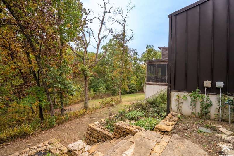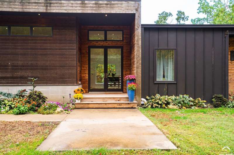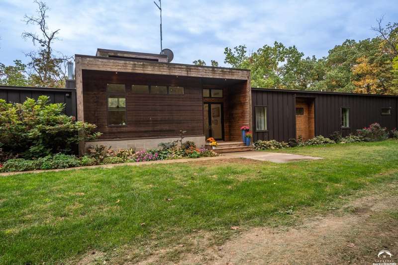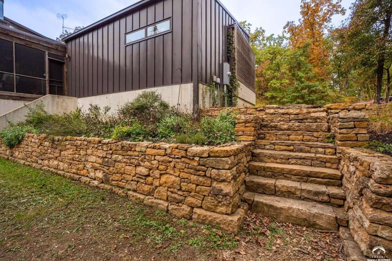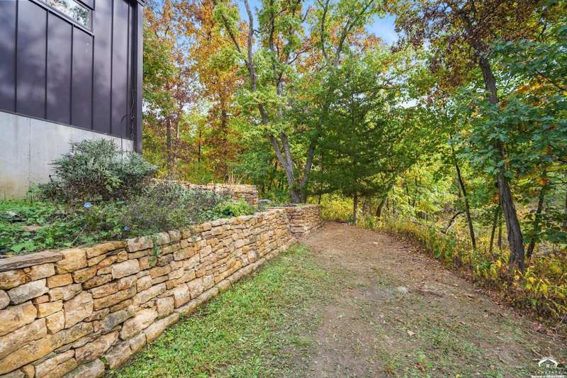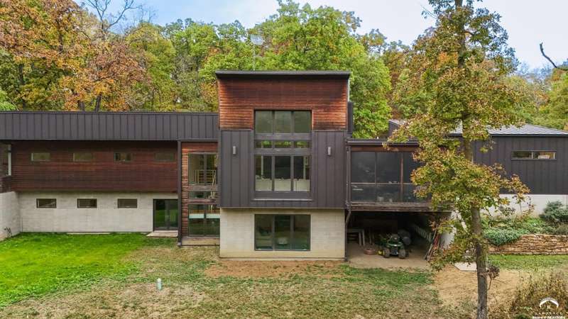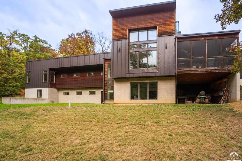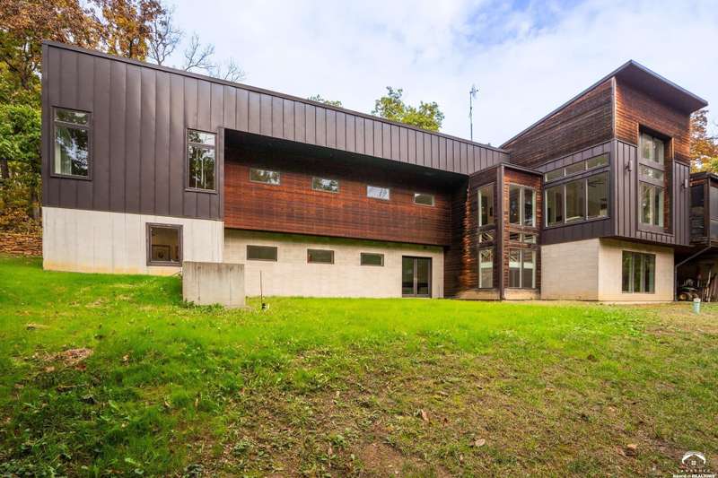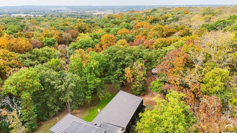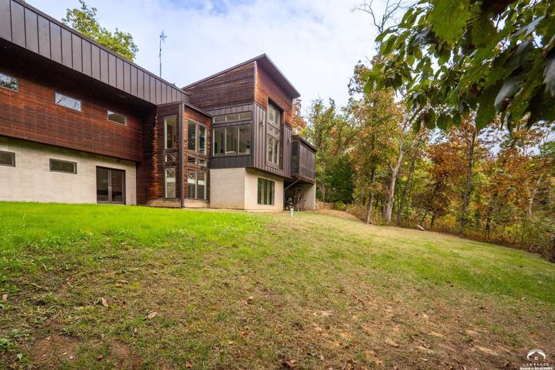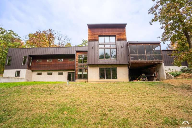Nestled in to a lovely wooded hillside, close to Tonganoxie yet secluded and private, this lovely contemporary home sits on it's own 10 acres. Modest seeming as you approach, entering the home brings an unexpected sense of openness and airy light. With soaring windows looking out over the wildlife filled site, you will be taken by the beauty of both the home and the property. With a welcoming foyer as your starting point, you'll move through the open kitchen and dining room, enjoying the proximity to the living room, and the access to the office and the screened porch. Down the well lit hallway are the generous bedrooms, with the whole first floor being bathed in light through the large window banks. Down the stairs to the finished basement leads you to more highly usable living area, with a large rec-room, game nook, large wet bar and more. The fourth conforming bedroom anchors one end of the basement, with it's private bath, and there's a non-conforming Craft room/ office as well. This lovely home and property are the perfect landing place for your next adventure, be sure to schedule a viewing today!