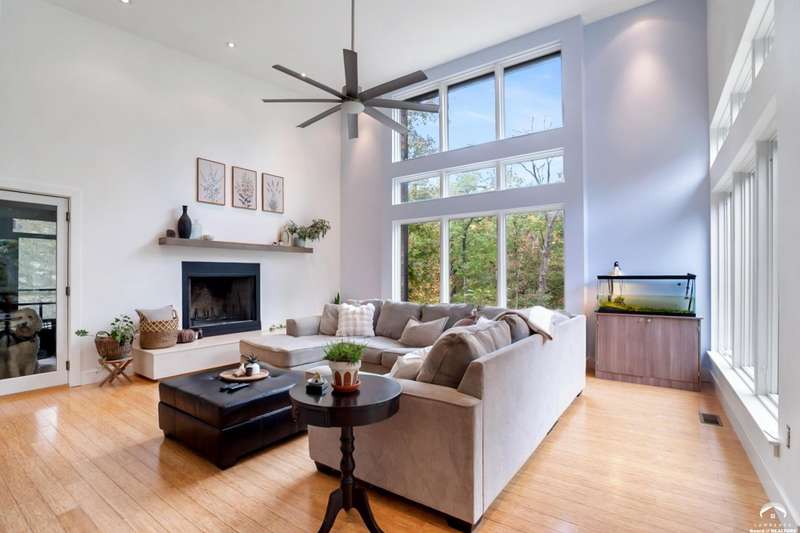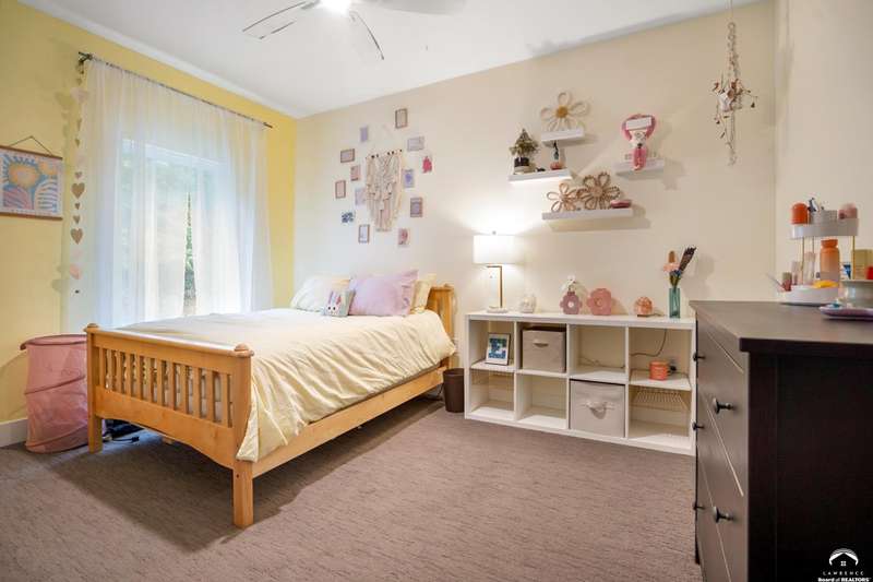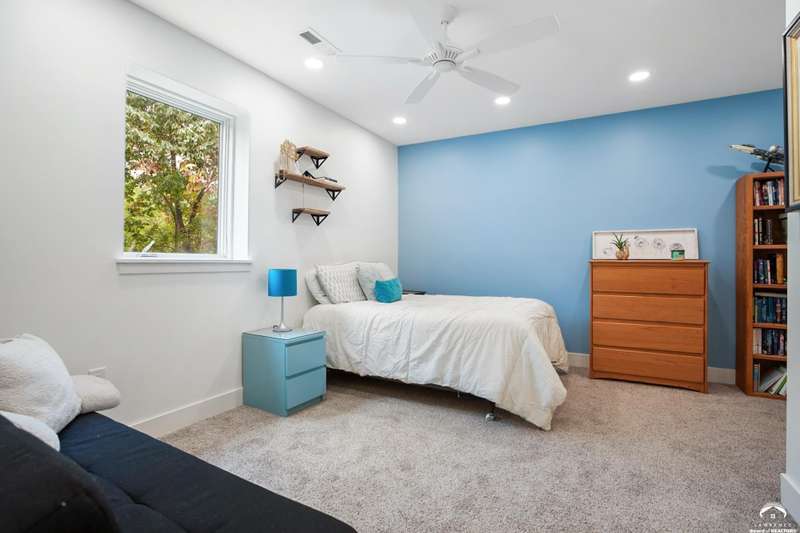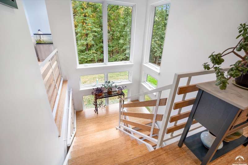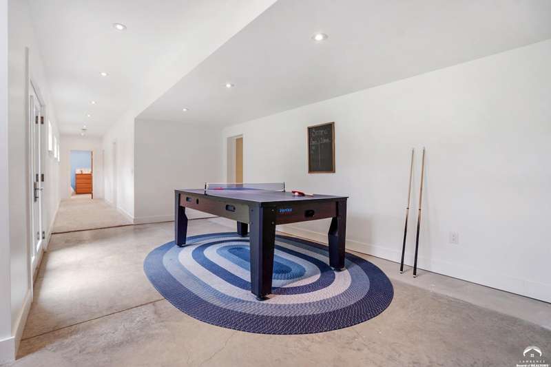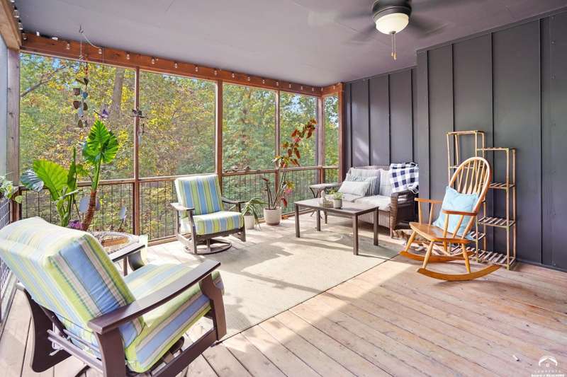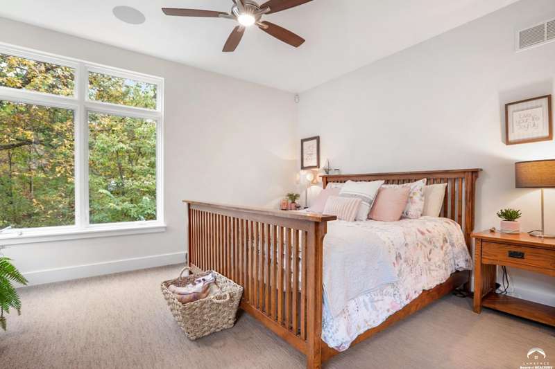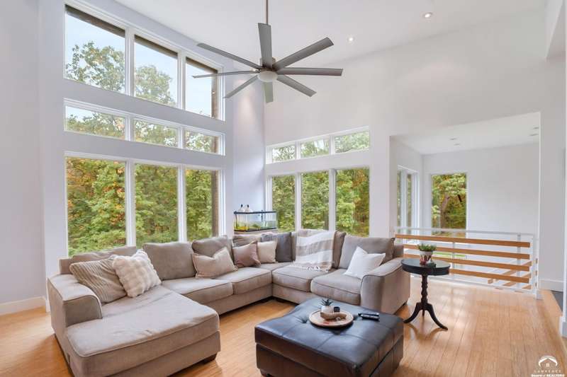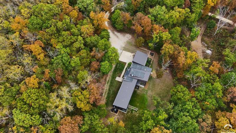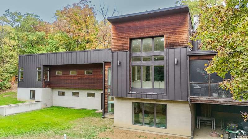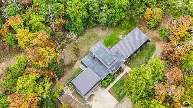 Nestled in to a lovely wooded hillside, close to Tonganoxie yet secluded and private, this lovely contemporary home sits on it's own 10 acres. Modest seeming as you approach, entering the home brings an unexpected sense of openness and airy light. With soaring windows looking out over the wildlife filled site, you will be taken by the beauty of both the home and the property. With a welcoming foyer as your starting point, you'll move through the open kitchen and dining room, enjoying the proximity to the living room, and the access to the office and the screened porch. Down the well lit hallway are the generous bedrooms, with the whole first floor being bathed in light through the large window banks. Down the stairs to the finished basement leads you to more highly usable living area, with a large rec-room, game nook, large wet bar and more. The fourth conforming bedroom anchors one end of the basement, with it's private bath, and there's a non-conforming Craft room/ office as well. This lovely home and property are the perfect landing place for your next adventure, be sure to schedule a viewing today!