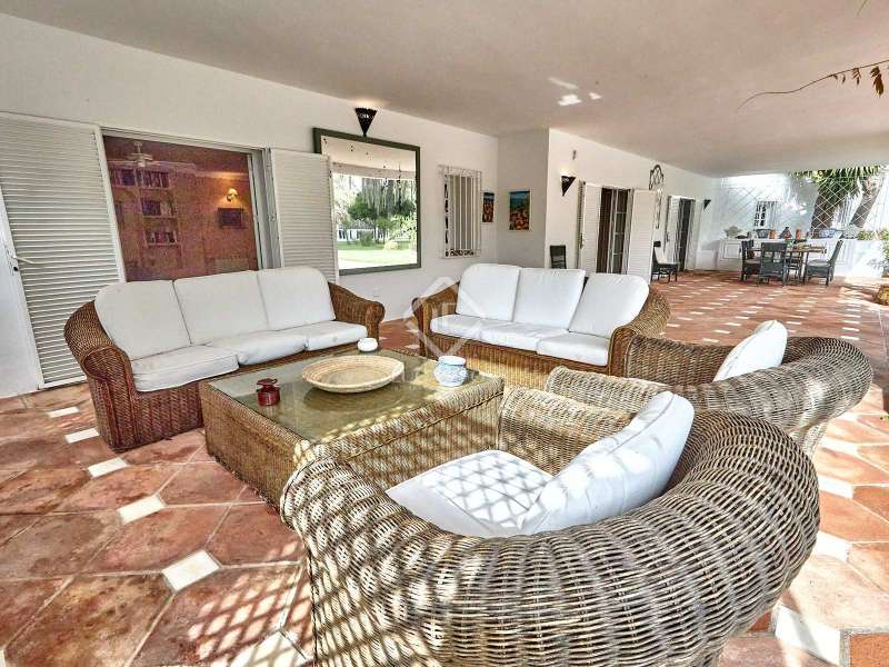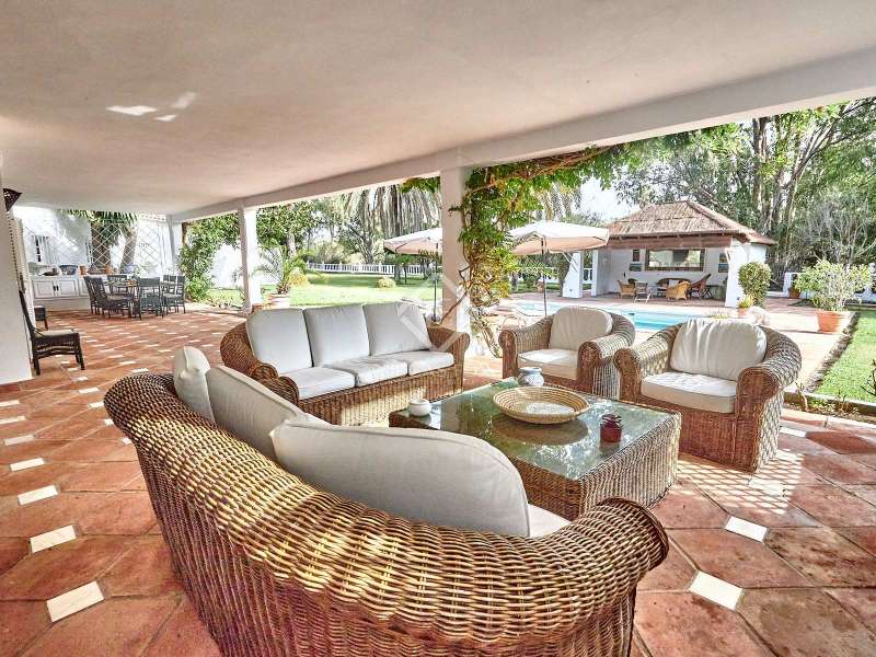 This charming Andalusian-style villa, located a few metres from the beach and next to one of the most prestigious golf courses in Spain, offers a unique opportunity as both a residence and an investment. The property, which extends over a plot of more than 4,000 m², stands out for its single-storey design that includes a large living room with fireplace and access to the garden, two dining rooms for summer and winter, and a fully equipped semi-industrial kitchen with a dining area and separate laundry room. The villa's four bedrooms, each with its own bathroom and direct access to the garden, guarantee comfort and privacy. The main bedroom features a separate lounge with fireplace, dressing room and a bathroom with separate jacuzzi and shower, providing a touch of luxury. The staff area of the house has a separate entrance, has three more bedrooms with two bathrooms, one of them en-suite. All the rooms in the house are arranged with privacy in mind. The extensive, well-kept garden, full of mature trees, houses a heated swimming pool and a summer pavilion with lounge, changing rooms and toilets. Located in the exclusive residential area of Casasola, with 24-hour security, and less than ten minutes by car from Puerto Banús and Estepona, the villa is close to several golf courses and all kinds of services. Additionally, the potential for extensions, renovations, or even division of the land for future developments, offers attractive flexibility to increase property value over the long term. With central heating, air conditioning and other amenities, this villa is ideal for both immediate occupation and future improvements, representing an excellent opportunity to enjoy the Andalusian lifestyle on the Costa del Sol.